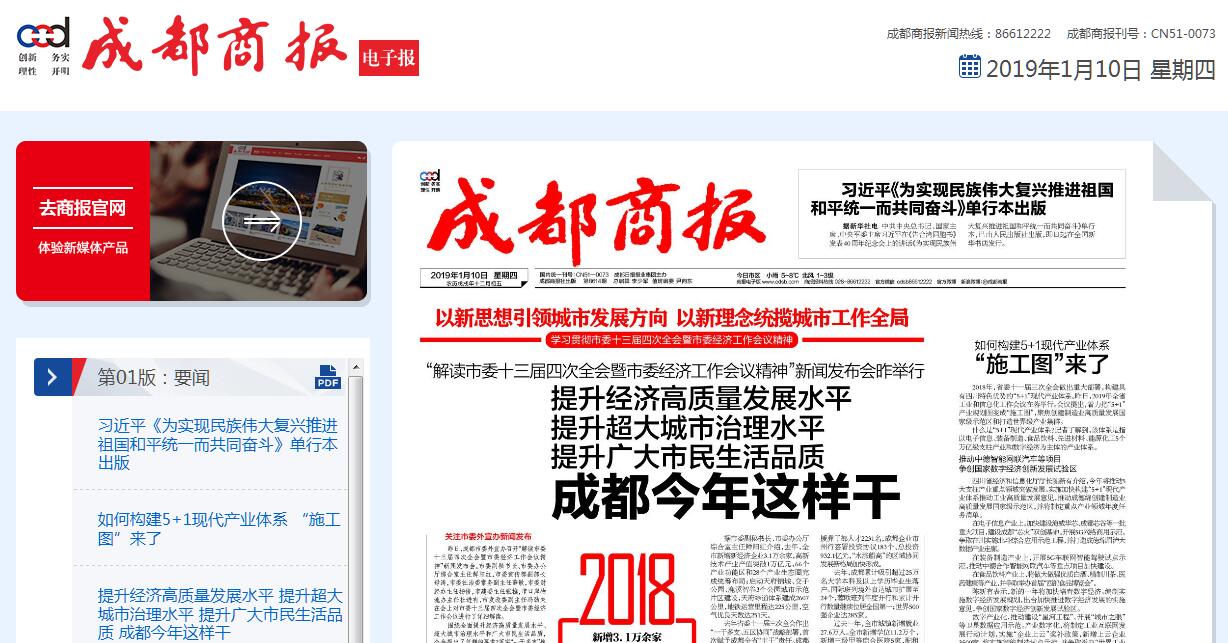| 网站简介: 《成都商报》是1994年成都商报社出版的报刊。主要内容是由要闻、财经、市民、文体和特刊五大版块组成的,包含很多及时的信息。2018年03月,获得第三届全国“百强报纸”。《成都商报》坚持“创新、务实、理性、开朗”的理念,坚持“权 威、公信、主流”的办报方向,长期以大容量、高密度、新形式的新闻和资讯回馈读者,是一张深受读者尊重和喜爱的畅销日报。《成都商报》以丰富多样的版面,全面快捷丰富多彩的新闻报道、清新活泼的版式风格,为广大读者所喜爱。平均每日出版对开20—24版,形成了各具特色的要闻、财经、市民、文体和特刊五大版块,以大容量、高密度的新闻和信息,追求其“一报在手,别无所求”的市场目标。 |