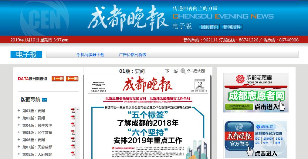 | 网站简介: 《成都晚报》创刊于1956年5月1日,现在的报头由江泽民同志亲自题写。2001年7月1日,《成都晚报》剥离中共成都市委机关报职能,成为一张具有鲜明都市特色的综合性市民报。生于一九五六,负责报道成都。成都晚报坚持新闻本土化、差异化、特色化,重点关注教育、交通、生命、健康、财富、环保、创业、新知等有关城市进步文明的新闻。她的读者群覆盖到成都市民的各个阶层,是社会各界发布信息的最佳媒体之一。期待与社会各界共同发展,合作双赢! |
