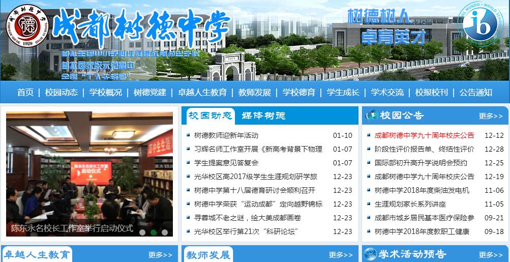 1929年,孙震将军创办私立树德学校,提出“树德树人”的办学主张。二十世纪三十、四十年代,成为全国办得最好的六所私立学校之一,时称“北有南开,西有树德”(《大公报》记载)。1952年,改制为公立学校,更名为成都九中,定为四川省首批办好的省级重点中学。1958年被定为四川省归国华侨子女集中就读学校、1959年被定为四川省高级干部子女集中就读学校。1989年,恢复树德中学校名。2000年,被评为四川省首批国家级示范高中。2004年,成为四川省第一所引进国际高中课程(VCE)的学校。2007年~2010年,实施名校扩建,形成“一校三区”的办学格局。2009年,组建树德中学教育集团,引领帮扶13所成员学校,促进教育优质均衡。2010年,被确定为教育部在四川省的首批探索拔尖创新人才早期培养的试点学校。2011年,成为中国西部唯一引进IB国际课程的公立高中。同年,获北京大学“中学校长实名制推荐”、清华大学“领军计划”学校。2013年,被评为四川省首批一级示范性高中。2014年,成为全国首批中国大学先修课程(CAP)试点学校。现为中国教育学会高中专业委员会常务理事学校。八十多年来,树德中学为国家培养了数以万计的优秀人才,其中不乏科学院士、文化巨擘、政坛精英、商界领袖。曾荣获全国五一劳动奖章、全国工人先锋号、全国德育工作先进集体、教育部首批“全国中小学心理健康教育特色学校”等荣誉称号。近年来,在“树德树人,卓育英才”的办学思想引领下,树德中学致力于建设“学术思想领先、教育品质一流,以研究和创新为显著特征的现代卓越学校”,追求“为高校输送基础宽厚、品性卓越、具有创新潜质的杰出学生,为培养未来社会的优秀公民、专门人才和领军人物奠定坚实基础”的教育使命,教育教学质量一直位居全省顶尖水平,多项教育改革走在最前列。近年来,学校着力创新教育实践,系统设计教育内容与制度体系,深化课程教学改革,优化人才培养模式。现已构建出以英才班、英才学院为突破口,以三大基地、四大校园节、五大讲堂、六大中心、七大典礼为支撑,以“4+3”课程图谱(品格课程、学术课程、实践课程、未来课程+校本必修课程、国际选修课程、跨界课程)为基础,以“德性滋养、人格完善、学习力提升、创新力培育、实践力发展、领袖力奠基”为核心内容的“卓越人生”教育体系,努力奠基学生明日之卓越。