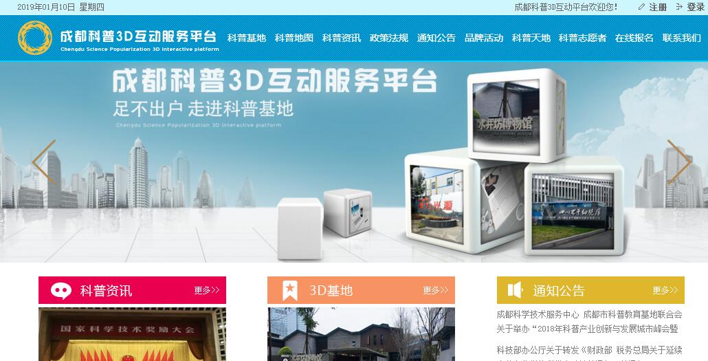成都科普3D互动服务平台由成都市科学技术局主办。成都科学技术服务中心科普部重点围绕成都市创新驱动发展战略,以全面提高市民科学素质为目标,搭建科普资源单位之间的共享平台,促进科普与创新的融合,从普及科学知识、宣传科学思想、倡导科学方法、弘扬科学精神和开展爱国主义教育五个方面,实现科普资源的共享和优势互补。通过举办成都市科技活动周、全市科普讲解大赛、全市青少年科幻画大赛、全市科普剧汇演等重大科普活动及科普“五进”活动,大力开展科普宣传,营造创新创业氛围,提高全民科学素养。业务范围:大型科普活动策划及实施、科普培训、科普宣传;科普相关领域的学术交流、展览展示、竞赛;接受国家、省、市政府及相关部门的工作委托等。成都市科普教育基地联合会(The Association of Chengdu Scientific Educational Bases),成立于2017年9月15日,是由国家、省、市命名的科普基地、科普教育基地、科普示范基地及科普培训基地的单位或有志献身科普事业的单位自愿组成的科技类联合性非营利性社会团体法人,登记机关为成都市民政局,接受成都市科技局、市科协工作指导。“联合会”通过建立协同机制,搭建科普资源单位之间的共享平台,政府与企业之间、科普基地与广大群众之间的沟通平台,是成都地区科技普及的重要力量。目前有中国科学院成都生物所、成都南湖国际旅游文化发展有限公司、成都生命奥秘博物馆、成都川菜博物馆、四川新生命干细胞科技股份有限公司、四川省防灾减灾教育馆、中国科学院成都文献情报中心、成都蛟龙投资有限责任公司、成都浩海立方海洋馆、成都农业科技职业学院、四川交通职业技术学院等100家会员单位。秘书处常设于成都科学技术服务中心。