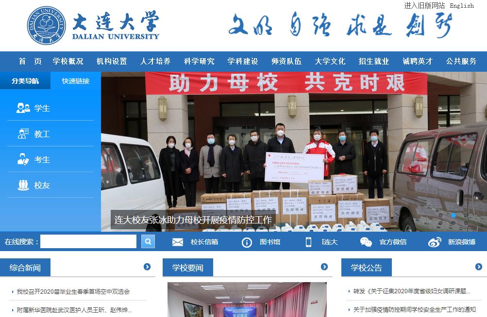 大连大学的历史可以追溯到始建于1949年4月成立的大连大学(1950年7月大连大学建制撤销,1978年10月成立大连工学院旅大分校,后为大连工学院分院,1983年11月大连工学院大连分院独立办学更名为大连大学)、1948年3月成立的关东文法专门学校(后为大连师范专科学校)、1950年10月成立的旅大市卫生学校(后为大连市卫生学校)。1987年10月,大连大学、大连师范专科学校、大连市卫生学校三校合一,组建新的大连大学,大连大学设工学院、师范学院、医学专科学校。2008年12月,大连铁路卫生学校并入大连大学。多年来,大连大学在先进大学文化的引领下,秉承“让每个人都成功、让每个人都快乐”的核心理念,发扬“立德树人、崇学笃行、兼容并蓄、创新超越”的连大精神,倡导“崇尚学术、崇尚科学”的优良校风,团结奋斗,坚持“以贡献求支持、求发展”,实现了跨越发展,现已发展成为一所拥有哲学、法学、经济、教育、文学、艺术、历史、理学、工学、医学、管理11大学科门类,主要办学指标和综合办学实力进入辽宁省高校前列的综合性普通高等学校。在艾瑞深中国校友会网公布的2018年中国大学排行榜单中,我校位居184名,位列省内高校第7名,大连高校第4名。学校现有教职工6455人(含2所附属医院)。校本部教职工1600余人,正高职188人,博士生导师35人,具有博士学位的教师487人,专任教师1027人。学校坚持实施人才强校战略,实施“金普学者”系列计划,大力强化“大连市人才储备基地”的功能。目前,学校有辽宁省后备院士培养工程人选1人,长江学者1人,国家杰出青年基金获得者2人,国家优秀青年基金获得者1人,国家“百千万人才工程”百层次人选3人,国务院政府特殊津贴专家10人,辽宁省攀登学者1人,辽宁特聘教授13人,省高校教学名师奖获得者13人,辽宁省百千万人才工程百人层次人选23人,辽宁省优秀教师3人,辽宁省优秀专家5人,辽宁省领军人才1人,8名教师入选教育部教学指导委员会委员,39名教师入选省高等学校本科教学指导委员会委员。大连大学现有21个一级学术硕士学位授予点,4个二级学术硕士学位授予点、5个专业硕士学位授予点。学校共有7个省重点(培育)学科,8个学科入选辽宁省“提升高等学校核心竞争力特色学科建设工程”立项学科,2个学科入选辽宁省一流特色学科,1个学科入选辽宁省一流学科。学校设有25个学院,64个本科专业,2所三级甲等附属医院。学校现有全日制在校生16000余人(含研究生1000余人)。学校占地面积124.6万平方米,建筑面积56.5万平方米,藏书170余万册。由综合体育馆、中心体育馆、网球馆、游泳馆等组成的体育场馆面积达2.07万平方米,体育设施达到国际比赛标准。学校以人才培养为根本任务,不断深化人才培养模式改革。建有国家级特色专业及卓越计划项目6个、国家大学生素质教育基地1个、国家级实验教学示范中心1个、国家精品在线开放课程1门、国家级双语示范课1门、国家级精品视频公开课3门、国家级“十二五”规划教材2部、国家级实践教育基地1个;建有省级实验教学示范中心(含建设单位)及省级虚拟仿真实验中心12个、省级校外实践教育基地7个、省级示范性专业、特色专业、品牌专业、综合改革试点专业、重点支持专业、工程人才培养模式改革试点专业、转型发展试点专业、国际化试点专业22个,省级精品类课程27门,省级“十二五”规划教材7部,省级教学团队6个,是省微电子通信与IT产业人才培养、培训基地。学校以科技创新推进事业发展,科研实力显著增强。学校拥有博士后科研工作站1个、院士工作站1个,拥有1个教育部创新团队和6个辽宁省创新团队,建有国家地方联合工程实验室3个、教育部重点实验室1个、辽宁省高校重大科技平台1个、辽宁省协同创新中心2个,以及35个省级重点实验室、工程技术中心和人文社科重点研究基地等。近五年,学校承担国家级项目225项,年全口径科研经费超亿元;承担国家自然基金重大研究计划、国家杰出青年科学基金项目、国家优秀青年科学基金项目各1项;获得国家自然科学二等奖和技术发明二等奖各1项、科技进步二等奖3项;2016年获得辽宁省技术发明一等奖、辽宁省科技进步一等奖,位居辽宁省高等院校、科研院所和大型企业第2名;发表SCI、SSCI、EI、CSSCI检索论文1300余篇次;授权发明专利335项。计算机科学与技术领域1项国防科研成果参加国家“十二五”科技创新成就展,14项军民融合科技创新成果参加“辽宁省第一届军民融合成果展”。这标志着我校科技创新能力步入全国地方高校的前列。在2017年中国大学教育部科技奖励排行榜中,学校位居第93名,辽宁省第4名;在教育部科技司发布的《2016年高等学校科技统计资料汇编》中,我校年度科研经费居全国第150名。学校发挥综合性地方大学、多学科交叉融合的优势,紧密围绕大连市战略性新兴产业发展,形成以信息科学、生命科学及人文社会科学等为引领的优势学科群。学校不断加强科技创新和成果转化,以高质量科技成果转化服务地方经济社会发展。为大连市东北亚国际航运和物流中心建设、软件和服务外包新领军城市建设、国家防震减灾示范城市建设作出了重要贡献,推动了汽车产业、生物医学材料产业、海洋微生物产业、蓝莓产业发展,为智慧大连、智慧教育、智慧医疗等民生工程提供了强大的技术支持。学校注重吸引