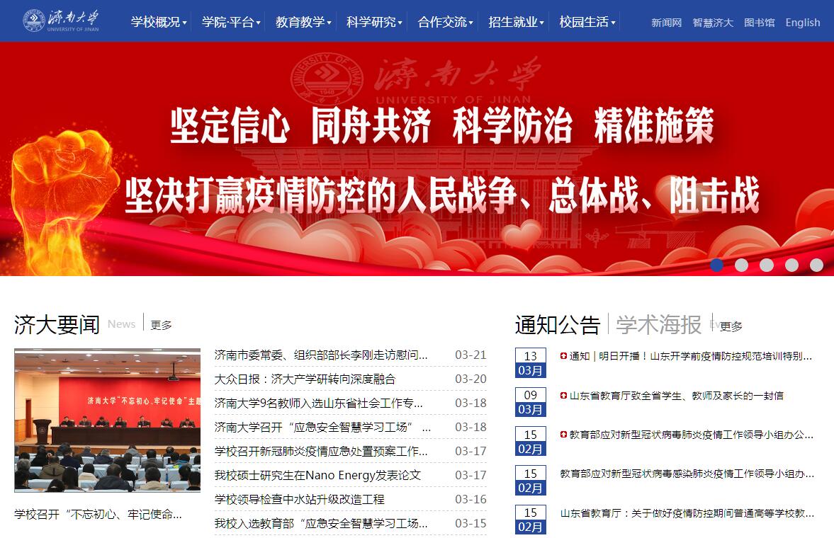 济南大学是山东省人民政府和教育部共建的综合性大学、山东省重点建设大学,具有学士、硕士、博士学位授予权。学校始建于1948年,建校70年来,学校铭记“弘毅、博学、求真、至善”的校训,传承“勤奋、严谨、团结、创新”的校风,发扬“艰苦奋斗、凝心聚力、追求卓越”的精神,为国家建设和经济社会发展培养了大批优秀人才,近31万名校友遍布海内外。学校现设24个学院,拥有2个博士后科研流动站、5个一级学科博士学位授权点、36个二级学科博士学位授权点、25个一级学科硕士学位授权点、167个二级学科硕士学位授权点、12个硕士专业学位培养类别、92个本科专业。学科专业涵盖经济学、法学、教育学、文学、历史学、理学、工学、医学、管理学和艺术学等10个门类。全日制在校本科生、研究生、留学生36784人。学校现有专任教师2100人,其中教授300人,副教授697人,具有博士学位的1027人,中国工程院院士3人(其中外籍院士1人),国家“千人计划”项目入选者2人,国家杰出青年科学基金获得者3人,国家万人计划2人,国家百千万人才工程2人,国务院学位委员会学科评议组成员1人,教育部教学指导委员会委员5人,国家“千人计划”青年项目入选者1人,国家优秀青年科学基金获得者2人,教育部新世纪优秀人才支持计划2人,泰山学者攀登计划人选4人,泰山学者特聘教授、海外特聘专家19人,泰山学者青年专家3人,国家和省部级有突出贡献专家24人,享受国务院政府特殊津贴专家23人,国家教学名师1人,国家级教学团队1个,省级教学名师12人,省级优秀教学团队6个。学校建有省部级以上重点学科及研究平台61个,其中省部共建国家重点实验室培育基地1个、教育部工程研究中心1个、国家“高等学校学科创新引智计划”(“111计划”)引智基地1个,教育部国别与区域研究基地(冰岛研究中心、非洲研究中心)2个、国家专利导航项目研究和推广中心1个、省级协同创新中心(含自主培育建设)2个,省级重点学科14个、省级重点实验室及省部级科研平台10个、“十二五”省高校重点实验室4个、省级人文社科研究基地11个、省级工程技术研究中心和省级工业设计中心14个。学校入选全国首批深化创新创业教育改革示范高校,建有国家级特色专业4个,国家级精品课程5门,国家级双语示范课2门,国家级精品视频公开课2门,国家级精品资源共享课立项5门,国家卓越工程师教育培养专业6个,省级品牌特色专业16个,省级校企共建专业9个,省级精品课程53门,国家级实验教学示范中心1个,山东省实验教学示范中心5个。山东省高水平应用型专业(群)重点立项建设3个、自筹经费立项建设6个。近年来,主持国家级教研教改课题21 项,省部级课题55项,主编国家级规划教材8部,获国家教学成果二等奖3项,省部级教学研究成果奖75项,在“挑战杯”全国大学生课外学术科技作品竞赛、“创青春”全国大学生创业大赛、全国大学生数学建模竞赛等各项活动中,共获得省部级以上奖励3663项,其中国家一等奖74项、二等奖178项。获得中国青少年科技创新奖2 项,小平科技创新团队1个。近年来,学校共承担国家科技支撑计划、国家“973计划”、“863计划”、国家自然科学基金、国家社会科学基金(重大、重点项目)等国家级科研课题452项,省部级项目992项;获得省部级以上科研奖励245项,其中获国家技术发明二等奖2项,国家科学技术进步二等奖3项;高等学校科学研究优秀成果奖(人文社科)三等奖4项;获得国家发明专利1232项;学术论文被SCI、EI、SSCI、CSSCI收录5565篇,化学、材料科学、临床医学、工程学四个学科进入全球ESI前1%,并入选山东省一流学科建设。出版专著、译著和教材220余部。主办《中国粉体技术》、《中华肿瘤防治杂志》、《济南大学学报》等3种学术期刊。学校坚持开放式办学理念,积极扩大与国(境)外教育机构的合作与交流,通过学者互访、学术交流、合作办学等多种方式与美、英、德、法、加、澳、俄、日、韩、新等国家的85所高校建立校际合作关系,与港澳台地区的21所高校建立友好学校关系,在刚果共和国首都布拉柴维尔、美国南达科他州阿伯丁和科罗拉多州首府丹佛市建有孔子学院3所。学校校园占地243万平方米,校舍建筑面积104万余平方米,固定资产总值25.9亿元,教学科研仪器设备总值3.6亿元。图书馆建筑面积6.3万平方米,藏书及电子文献800余万册,中、外文现刊4200余种,电子期刊23000余种。济南大学的中长期发展目标是建设创新性、国际化、有特色的世界高水平大学。