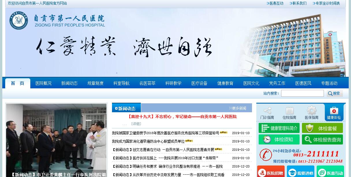 自贡市第一人民医院始建于1908年,历经110周年的淬砺,现已发展为集预防、医疗、科研、教学为一体的三级甲等综合医院。2008年增挂自贡市传染病医院。医院为首批吸纳的中国500所大型医院成员、卫生部批准的爱婴医院、卫生部国际救援中心网络成员、卫生部脑卒中基地医院、卫生部病理远程会诊及质控试点单位、涉外医疗单位、国家综合医院中医药工作示范单位、国家中医药防治传染病临床基地、国家首批住院医师规范化培训基地、自贡市公共卫生应急医院、川北医学院非直管附属医院、四川卫生康复职业学院附属医院、成都中医药大学等教学医院。2015年被四川省卫生计生委确定为自贡、内江“医疗作战区”领头医院。医院实现了连续五年在全省医院的综合排名持续上升,2017年位列17位,在自贡市排名第一。医院占地175亩,业务用房面积近10余万平方米,现有编制床位1800张,实际开放床位2300张。设有临床科室31个,医技科室10个。建有省级重点专科8个、市级重点专(学)科16个、市级质控中心20个。建成胸痛中心、房颤中心、卒中中心、自贡市癌症中心等。以微创、介入、生物治疗等为核心技术,率先在市内开展肝移植术、角膜移植术、导管消融技术、冠心病介入治疗技术、先心病介入技术、神经介入治疗技术以及生物治疗技术等新技术。医院创新建立了医学影像、心电、病理、检验四个远程诊断检查平台,服务于150余家基层医疗卫生机构,让基层群众在家门口就能享受“三甲”医院便捷、优质的医疗服务。自平台建设以来,共出具各类远程诊断报告25万余份。四大远程诊断平台经验做法接受省政府参事室调研获认可,并上报国务院参事室。医院不断加强人才队伍建设。现有在岗职工2428人。高级职称329人,硕博士研究生191人。其中有临床医师691人,副高以上医师198人,占医师数的28.65%。拥有全国、省、市劳模,省、市学术技术带头人,名医、优秀专家、拔尖中医师,“双千计划”杰出人才等40余名,市优秀医学专家培育对象93名。近年获国家专利7项,率先在自贡市实现SCI论文收录零突破。引进GE128排超CT、ECT、MR、直线加速器、数字减影血管造影系统等一大批高精尖设备,设备总值达3亿余元。医院落实分级诊疗制度,加快医联体建设。与自流井区中医院、区妇幼保健院、新街社区卫生服务中心组建全市首个城市医疗集团;与市残联签约共建自贡市残疾人康复中心;与上级医院形成专科医联体29个;呼吸与危重医学科、血液科、康复科等9个专科与45家基层医院组建专科联盟,逐步构建起了区域间相互协同的医疗服务网络。新时代,新起点,新征程。医院将秉承“仁爱精业,济世自强”的院训,光大“百年名院”品牌,按照市委、市政府“树立新规范,展示新风尚,创造新业绩,闯出新天地,再上新台阶”的总要求,以“比学赶超,对标管理,全面推动高质量发展”为主线,进一步解放思想、与时俱进、追赶跨越、转型发展,把医院建设成为高质量的、人民信赖的、一流的三甲综合区域领头医院。