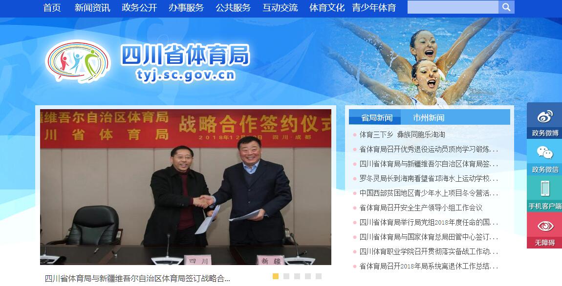 四川省体育局主要职责:(一)贯彻实施党和国家体育工作的方针政策和法律法规,研究拟订全省体育工作法规、规章草案和政策并组织实施。(二)研究体育发展战略,拟订全省体育事业发展规划,负责推动多元化体育服务体系建设,推进体育公共服务和体育体制改革。(三)统筹规划全省群众体育发展,负责推行全民健身计划,监督实施国家体育锻炼标准,推动全省国民体质监测和社会体育指导工作队伍制度建设,指导公共体育设施的建设,负责对公共体育设施的监督管理。(四)统筹规划全省竞技体育发展,指导体育训练、体育竞赛和运动队伍建设,组织和统筹参加国家级以上综合运动会,负责组织协调省级综合性运动会的竞赛工作,协调运动员社会保障工作。(五)统筹规划全省青少年体育发展,指导和推进青少年体育工作。(六)拟订全省体育产业发展政策,规范体育服务管理,推动体育标准化建设,负责监督管理全省体育彩票销售工作。(七)指导、管理体育外事有关工作,组织开展国际间和与港澳台的体育交流与合作。(八)指导体育科研、技术攻关和成果推广工作,负责组织、监督全省体育运动中的反兴奋剂工作。(九)承担由省政府公布的有关行政审批事项。(十)承办省政府交办的其他事项。