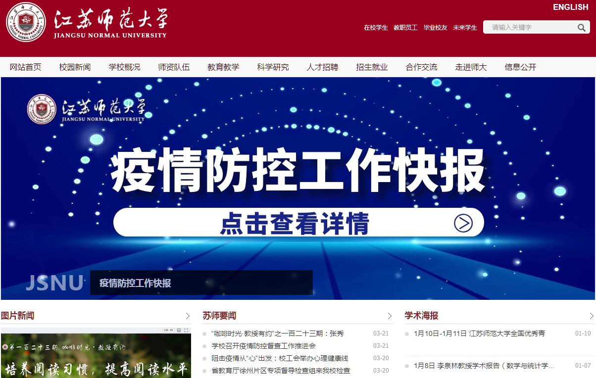 江苏师范大学是江苏省人民政府和教育部共建高校,是江苏高水平大学建设高校。学校前身是1952年创办于江苏无锡的苏南军区转业干部文化速成学校,战功卓著的刘先胜中将为第一任校长。1956年学校暂名“江苏省中学师资训练班”(无锡师范专科学校筹备处),正式纳入普通高等教育序列招生。1957年成立江苏师范专科学校。1958年学校北迁徐州,1959年与徐州师范专科学校合并,成立徐州师范学院。60年代初,全国高校布局调整,敬爱的周恩来总理指示:“徐州地区地域辽阔,要有大学”,学校因此得以保留。从此,学校扎根苏北,艰苦创业,逐步发展。1979年开始招收硕士研究生,1981年成为全国首批硕士学位授予单位。1996年学校更名为徐州师范大学。1999年原煤炭部所属的徐州工业学校并入。2011年学校更名为江苏师范大学。在学校发展史上,有著名汉语言学家廖序东教授,著名诗人、中国现代文学研究专家吴奔星教授,戏剧家、中国古代文学史家王进珊教授,中国古代文学研究专家吴汝煜教授,教育家刘百川教授,心理学家张焕庭教授,历史学家臧云浦教授,地理学家罗其湘教授等一批国内外知名专家学者。建校以来,全校师生秉承“崇德厚学,励志敏行”的校训,经过不懈努力,各项事业都有了快速发展。学校现有泉山、云龙、奎园、贾汪4个校区,占地2047亩,校舍面积81.2万平方米;教学科研仪器设备总值5.31亿元;图书馆藏书284万册。学校设有22个专业学院以及敬文书院、继续教育学院、国际学院和教育部批准设立的首个非独立法人中俄合作办学机构——江苏师范大学圣彼得堡彼得大帝理工大学联合工程学院,另设有独立学院科文学院。现有63个本科招生专业,34个一级学科硕士点,13个硕士专业学位类别,1个服务于国家特殊需求博士人才培养项目,1个博士后科研流动站,覆盖11个学科门类。具有以同等学力申请硕士学位授予权和硕士研究生推免权。现有在校普通全日制本科生18000余人(不含独立学院科文学院),博士、硕士研究生3100余人。建校以来,学校已向社会输送了十八万余名毕业生,一大批取得突出成就的江苏师范大学校友活跃在海内外政治、经济、文化、科技和教育等各个领域。学校坚持以立德树人为根本,深入推进教育教学改革,切实提高人才培养质量。2004年在教育部组织的本科教学工作水平评估中获得优秀等次,2015年高质量通过教育部本科教学工作审核评估。近几年,获得国家级教学成果奖2项(其中一等奖1项)、省级教学成果奖49项(其中特等奖3项),首届全国研究生教育成果奖二等奖;获批国家级特色专业建设点4个、教育部“十二五”专业综合改革试点项目2项、省品牌专业建设工程一期项目4项、省“十二五”重点专业(类)11个。建有国家级教学团队1个、省级优秀教学团队2个;获批国家级精品资源共享课9门、国家级精品教材和规划教材6部、省级优秀精品课程48门、省级在线开放课程7门、省级精品教材和重点教材45部。获得国家级大学生校外实践教育基地建设项目1项,承担教育部卓越教师培养计划改革项目2项,省级卓越教师培养计划改革项目1项。获得“中央支持地方财政专项”46项,拥有国家级实验教学示范中心3个,国家级示范性虚拟仿真实验教学项目1个,省级实验教学示范中心18个,省级虚拟仿真实验教学平台1个,省级在线开放虚拟仿真实验教学项目2个。学校被教育部、国家语委确定为全国首批“国家语委语言文字应用培训基地”、全国唯一一家“经典诵读教育”学科(领域)培训机构,获评“国家级语言文字规范化示范校”。学校积极实施人才强校战略,师资队伍建设取得显著成效。现有专任教师1560人,教授295人(其中博士生导师53人)、副教授611人,专任教师中博士占比54%,具有海外研修经历教师比例38.1%。目前我校有“长江学者”2人、国家“万人计划”教学名师1人、国家“千人计划”专家5人,4人入选教育部“新世纪优秀人才”支持计划,2人获得国家优秀青年基金,2人入选中国科学院“百人计划”,江苏特聘教授9人;双聘院士量级人才11人,“长江学者”、国家“杰青”量级人才50人;24人享受国务院政府特殊津贴, 4人次获得“全国先进工作者”“全国五一劳动奖章”“全国模范教师”“全国优秀教师”等荣誉,1人获得中国侨界贡献奖,4人入选“江苏省高校教学名师”,12人获得“江苏省有突出贡献的中青年专家”称号,8人为省“双创计划”人才,21人为省“六大人才高峰”培养对象,105人次入选省“333高层次人才培养工程”,157人次入选省“青蓝工程”;有国家级省级教学科研团队20个。学校注重学科建设与科研工作,内涵建设水平稳步提升。现有6个省优势学科、12个省重点学科,化学学科稳居ESI排名前1%。拥有江苏高校协同创新中心2个,部省级科研平台30余个。近五年来,获批国家级科研项目399项,其中国家社会科学基金项目141项(重大项目8项、重点项目8项),国家自然科学基金项目258项。在SCI/EI/CPCI/SSCI/A&HCI/CSSCI等索引学术期刊上发表科研论文4366篇,其中SCI一区、二区Top等期刊论文370篇,在Science、Nature、PNAS等国际一流期刊上发表论文7篇。自然指数(Nature Index)进入“中国内地高校Top100”,2016年位列54位,江苏省内高校第8位,全球高校排名第428位。2017年,学校入围US News 2018世界大学排行榜,位列中国内地高校第123。获得教育部高等学校科学研究优秀成果奖12项,