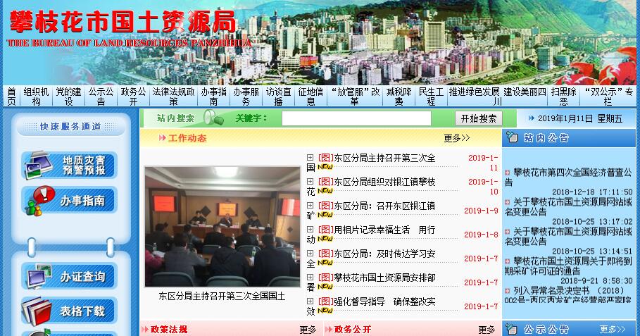 攀枝花市国土资源局是攀枝花市政府管理全市国土资源工作的职能部门。其主要职责:(一)贯彻执行国家有关国土资源的调控政策律、措施和法规,承担保护与合理利用土地资源、矿产资源的责任。编制全市国土资源发展战略和规划并组织实施。研究提出全市国土资源供需总量平衡的政策建议,拟定国土资源在经济运行、城乡统筹等方面的调控政策和措施。编制并组织实施全市国土规划,拟订并组织实施国土资源领域资源节集约利用和循环经济的政策措施。(二)承担规范国土资源管理秩序的责任。负责本系统、本部门依法行政工作,指导全市国土资源依法行政工作,监督检查市级以下各级人民政府及其国土资源行政主管部门执行和遵守国土资源管理法律、法规及土地、矿产资源规划、计划的执行情况。加强对下级国土资源行政主管部门履行职责的管理监督,直接查处县(区)人民政府及其国土资源行政主管部门违反国土资源管理法律、法规的行为。调查处理国土资源重大违法案件。(三)承担优化配置国土资源的责任。编制和组织实施全市土地利用总体规划、土地利用年度计划、土地整理复垦开发规划和其他专项规划、计划。指导并按法定权限审核县(区)土地利用总体规划、矿产资源规划,组织编制矿产资源、地质勘查、地质环境规划和地质灾害防治、矿山地质环境保护等其他专项规划并监督检查规划执行情况。参与审核报省政府、市政府审批的涉及土地、矿产的相关规划及其调整。(四)负责国土资源权属管理。依法保护土地资源、矿产资源等自然资源所有者和使用者的合法权益,组织调查处理重大权属纠纷,指导土地确权,负责各类土地登记资料的收集、整理、共享和汇交管理,提供社会查询服务。(五)承担全市耕地保护的责任,确保规划确定的耕地保有量和基本农田面积不减少。牵头拟定并组织实施耕地保护政策,组织实施基本农田保护,监督占用耕地补偿制度执行情况。指导未利用土地开发、土地整理、土地复垦和耕地开发的监督工作。组织实施土地用途管制、农用地转用和土地征收征用,承担报国土资源厅和市人民政府审批的各类用地的审核、报批工作。(六)承担及时准确提供全市土地利用各种数据的责任。制定地籍管理实施细则,组织土地资源调查、地籍调查、土地统计和动态监测,组织实施重大土地专项调查,指导全市地籍调查、登记和土地分等定级工作。(七)承担节约集约利用土地资源的责任。拟定并实施土地开发利用标准,管理和监督城乡建设用地供应、政府土地储备、土地开发和节约集约利用。拟定并组织实施土地使用权出让、租赁、作价出资、转让等管理办法,建立基准地价、标定地价等政府公示地价制度,会同农业部门监督管理农村集体建设用地使用权的流转。组织实施禁止和限制供地目录、划拨用地目录等,承担审核报市政府审批的改制企业的国有土地资产的处置。(八)承担规范国土资源市场秩序的责任。监测土地市场和建设用地利用情况,监管地价,规范和监管土地市场。规范和监管矿业权市场,组织对矿业权人勘查、开采活动进行监督管理。规范和监管国土资源相关社会中介组织和行为,依法查处违法行为。(九)负责矿产资源开发的管理,依法管理矿业权的审批登记发证和转让审批登记。负责辖区内规划矿区、对国民经济具有重要价值的矿区的管理,承担保护性开采的特定矿种、优势矿产的开采总量控制及相关管理工作,组织编制实施矿业权设置方案。(十)负责地质勘查行业和矿产资源储量管理。组织实施地质调查评价、矿产资源勘查,管理市级地质勘查项目,组织实施市级重大地质勘查专项,管理地质勘查资质、地质资料、地质勘查成果,统一管理公益性地质调查和战略性矿产勘查工作。管理矿产资源评审、登记、统计,组织实施矿山储量动态监督管理,组织实施矿产资源储量调查,协助上级机关开展压覆矿产资源管理工作。(十一)承担地质环境保护的责任,组织、协调、指导和监督地质灾害防治工作。指导重大地质灾害应急处置,组织拟定全市突发重大地质灾害应急预案。组织实施矿山地质环境、地质遗迹保护,监督管理古生物化石、地质遗迹、矿业遗迹等重要保护区、保护地,依法管理水文地质、工程地质、环境地质勘查和评价工作,监测、监督防止地下水过量开采和污染,承担城市地质、农业地质、旅游地质的勘查与评价工作。(十二)依法征收土地、矿产资源收益,规范、监督资金使用,拟定土地、矿产资源参与经济调控的政策措施。依法组织土地、矿产资源专项收入的征管,配合有关部门拟定收益分配制度,配合有关部门指导、监督全市土地整理复垦开发资金的收取和使用。参与管理土地、矿产等资源性资产,参与管理省、市出资形成的矿业权权益,负责编制有关资金的预算和财务、资产管理与监督。(十三)推进国土资源科技进步,组织开展对外合作与交流。组织制定、实施国土资源科技发展规划,组织实施重大科技专项,推进国土资源信息化和信息资料公共服务。(十四)承担市政府公布的有关行政审批事项。(十五)承办市政府交办的其他事项。