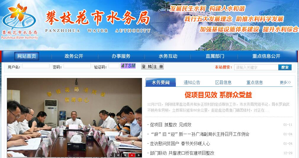 攀枝花市水务局主要职责:(一)贯彻执行国家和省有关行政管理工作的方针、政策和法律、法规。负责保障水资源的合理开发利用;负责全市水务、渔业、水土保持、地方水电行政管理的制度建 设,拟订政策和发展规划。组织编制全市重要江河湖库的流域综合规划、水资源保护和水源地保护规划、节约用水、防洪规划等重要水务规划,组织有关全市国民经 济总体规划、城乡规划、重大建设项目中涉及水务、渔业、水土保持、地方水电等方面的论证工作。(二)负责全市水资源统一管理。合理配置水资源,统筹兼顾和保障生活、生产经营、生态环境用水;实施水资源的统一监督管理,组织实施取水许可、水资源有偿使用和 按规定开展水资源调查工作;负责重要流域、区域以及重大调水工程的水资源调度,组织实施水资源有偿使用制度和水资源论证、防洪论证制度。(三)负责全市水资源保护工作,组织水功能区的划分,审定水域纳污能力,提出限制排污总量的建议;审查入河(库)排污口的设置、改建和扩建,指导地下水开发利用和管理保护工作;指导饮用水水资源保护工作;负责拟定全市节约用水政策和指导节水工作。(四)负责全市供水、排水、污水处理、再生水利用的行业管理指导和监督工作(含自备水源)。(五)指导全市水务行业体制改革工作;监管市政府授权管理的市级水务资产,指导县(区)水务行业国有资产的业务管理工作。(六)负责全市水务、渔业、水土保持、地方水电基本建设的指导并实施行业监督。(七)负责组织实施水务、渔业、水土保持、地方水电的法律法规及执法工作;调处县(区)之间的重大水事、渔事纠纷;负责有关行政复议和行政诉讼应诉工作。(八)负责全市水土保持工作。拟订水土保持规划并监督实施,负责全市水土流失综合治理及监测工作;负责权限范围内开发建设项目水土保持方案的审批、实施、监督工作。(九) 负责全市水产渔政工作。负责全市渔业生产,指导水产品加工、流通和市场建设,负责水产品质量安全管理和水生动物的防疫、检疫工作;拟订渔业资源保护、利用 规划;负责水生生物自然保护区和渔业资源保护区管理,协调仲裁渔事纠纷,查处渔政案件,负责渔船管理,指导渔港和渔业安全生产工作。(十)负责地方水电行业管理工作。负责全市水电建设项目涉水事务的监督管理。(十一)负责全市江河的综合开发与管理工作。负责全市河道、水库、湖泊、河口滩涂的行政管理及河道管护范围内砂石资源等的开发、利用和保护;负责对占用河道、河堤通道设施(包括临时设施)等行为的行政监督管理工作。(十二)指导农村水利工作。组织协调农田水利基本建设,指导农村饮水安全、节水灌溉等工程建设与管理工作,指导农村水利社会化服务体系建设;按规定指导农村水能资源开发工作,指导水电农村电气化和小水电代燃料工作。(十三)指导全市水务发展和水务行业劳动保护、科技推广、安全生产工作。(十四)负责防治水旱灾害,组织、协调、监督、指导全市防洪抢险及抗旱工作。编制全市防汛抗旱应急预案并组织实施,指导水务突发公共事件应急管理工作。(十五)承担市政府公布的有关行政审批事项。(十六)承担市政府交办的其他事项。
