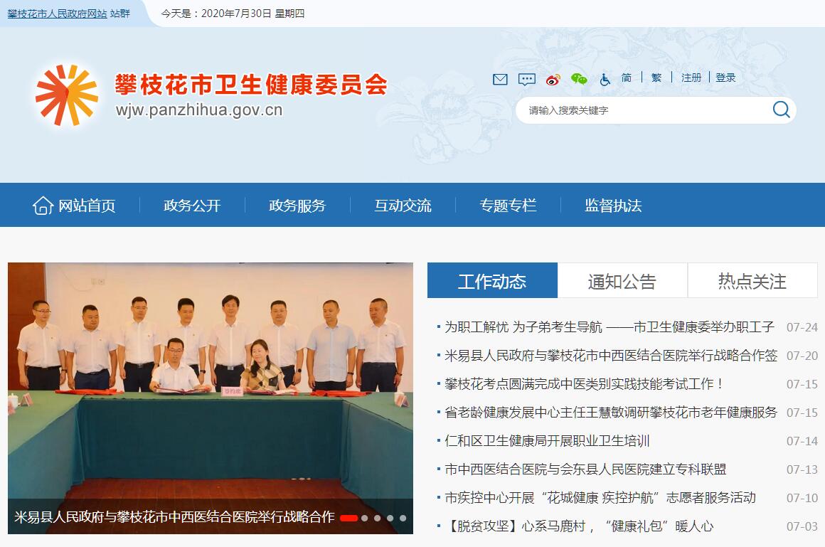 攀枝花市卫生健康委员会主要职责:(一)组织拟订全市卫生健康政策。负责拟订卫生健康事业发展政策、规划并组织实施。统筹规划全市卫生健康资源配置。制定并组织实施推进卫生健康基本公共服务均等化、普惠化、便捷化和公共资源向基层延伸等政策措施。(二)牵头推进全市深化医药卫生体制改革。研究提出深化改革重大政策、措施的建议。组织深化公立医院综合改革,建立健全现代医院管理制度。制定并组织实施推动卫生健康公共服务提供主体多元化、提供方式多样化的政策措施。(三)制定并组织落实全市疾病预防控制规划、免疫规划以及严重危害人民健康的艾滋病等重大传染病、寄生虫病、地方病等公共卫生问题的干预措施。负责全市卫生应急工作,组织和指导全市突发公共卫生事件预防控制和各类突发公共事件的医疗卫生救援。收集、报告法定传染病疫情信息、突发公共卫生事件应急处置信息。依照国家检疫传染病和监测传染病目录,参与开展检疫监测工作。(四)贯彻落实国家应对人口老龄化政策措施。负责推进老年健康服务体系建设和医养结合工作。承担市老龄工作委员会日常工作。(五)贯彻落实国家药物政策和国家基本药物制度。开展药械使用监测、临床综合评价和短缺药品预警,组织执行国家药典和国家基本药物目录,制定基本药物使用的政策措施。(六)组织实施食品安全风险监测,开展食品安全企业标准备案,组织开展食品安全事故流行病学调查。(七)负责职责范围内的职业卫生、放射卫生、环境卫生、学校卫生、公共场所卫生、饮用水卫生等公共卫生的监督管理。负责传染病防治监督,健全卫生健康综合监管体系。(八)制定全市医疗机构、医疗服务行业管理办法并监督实施,建立医疗服务评价和监督管理体系。会同有关部门实施卫生健康专业技术人员资格标准。制定并组织实施医疗服务规范、标准和卫生健康专业技术人员执业规则、服务规范。负责医疗机构、人员和行为的日常监管。(九)制定全市中医药中长期发展规划,并纳入卫生健康事业发展总体规划和战略目标予以组织实施。(十)负责全市计划生育管理和服务工作,开展人口监测预警,研究提出人口与家庭发展相关政策建议,执行计划生育政策。指导市计划生育协会的业务工作。(十一)指导县(区)卫生健康工作。指导基层医疗卫生、妇幼健康服务体系和基层卫生队伍建设。推进卫生健康科技创新发展。(十二)负责市确定的保健对象的医疗保健工作,负责市级有关部门(单位)离休干部医疗管理工作。负责重要会议与重大活动的医疗卫生保障工作。(十三)依法依规履行卫生健康行业安全生产监管职责,负责职责范围内的生态环境保护、审批服务便民化等工作。(十四)完成市委、市政府交办的其他任务。