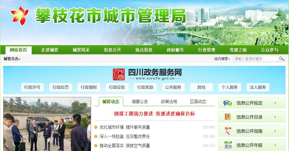 攀枝花市城市管理局主要职责:1、贯彻执行国家、省、市有关城市管理的法律、法规和政策;拟订全市城市管理发展规划、实施计划、规范性文件、管理标准,汇同相关部门拟订管理工作目标,并组织实施。2、负责城市管理的行政执法、行政复议工作。集中行使市容环境卫生管理、城市绿化管理、市政设施管理、公用事业管理方面法律、法规、规章规定的行政处罚权。3、负责城市市容环境卫生综合管理工作。依法对城市市容环境卫生实施监督检查和考核;负责环境卫生作业企业的行业管理。4、负责全市市政公用设施综合管理工作。负责城市排水、城市防洪、城市排涝管理职责以及城市防洪、城市排涝改造(维修)项目的建设管理职责。拟订市政公用设施发展计划并组织实施;负责对全市城市道路、城市道路桥梁、隧洞、城市照明及其附属设施等市政基础设施行业指导及监督管理工作。参与临时占用城市道路的机动车、非机动车停车场(点)的规划定点工作;负责建成区城市主干道、城市主干道桥梁、隧道、城市照明及其附属设施的维护、维修、管理工作;负责建成区事权内城市雕塑的维护和管理工作;指导公用事业单位改革。5、负责全市城市绿化管理和监督。负责对全市城市园林绿化行业管理、业务指导、培训、督促和检查;负责城市园林绿化管理标准和城市园林绿化建设工程有关管理规范的制定;负责城市建成区城市主干道道路两侧的行道树及其附属公共绿地的管理;负责城市规划区古树名木的保护管理工作;负责对权限内园林绿化企业监督管理工作。6、综合管理城管系统的安全工作;负责燃气行业综合管理工作。7、收集城市管理信息的收集、组织开发、利用城市管理科学技术研究和科技成果的转化与推广运用工作。8、拟订城市管理工作经费的中长期计划和年度计划;会同有关部门对使用情况实施监督管理。9、参与城市新建、改扩建项目中涉及市容环境卫生、园林绿化、市政公用设施建设项目的规划、方案审查、综合验收和监督管理。10、承担市政府公布的有关行政审批事项。11、承办市政府交办的其他事项。