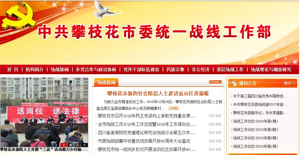 攀枝花市委统战部是市委主管统一战线工作的职能部门,是市委在统战工作方面的参谋和助手。主要职责是:(一)负责协调、监督、检查全市统一战线工作。调查研究统一战线的理论、方针、政策,组织贯彻执行中央、省委和市委关于统一战线的方针、政策;向市委反映统一战线全面情况,提出开展统一战线工作的意见和建议;检查统战政策执行情况,牵头协调处理统战工作中的重大问题。(二)负责联系各民主党派和无党派人士,反映他们的意见和建议;研究贯彻中国共产党领导的多党合作和政治协商制度以及对民主党派的方针、政策;落实中央、省委和市委关于发挥民主党派和无党派代表人士参政议政和民主监督作用的工作,为市委同民主党派、无党派人士进行政治协商做好组织联系工作;受市委委托,向民主党派、无党派人士通报中央、省委和市委的重要情况;支持帮助各民主党派加强自身建设,选拔、培养新一代代表人物;协助有关部门帮助民主党派机关改善工作条件和生活条件。(三)调查研究、监督检查有关民族和宗教工作重大方针、政策的贯彻执行情况;联系少数民族和宗教界的代表人物;协助有关部门做好少数民族干部的培养和举荐工作。(四)负责开展以祖国统一为重点的海外统战工作。联系香港、澳门和海外有关代表人士;归口管理台湾在野党派、政治团体的来访工作;做好台胞、台属有关工作。(五)负责党外人士的政治安排。会同有关部门做好培养、选拔、推荐、安排党外人士担任政府、政府部门和司法机关领导职务的工作;做好党外后备干部和新的代表人物队伍的建设工作;受市委委托,领导市工商联党组,指导工商联工作;协助各民主党派、工商联做好干部管理工作;协调指导市民族宗教事务局的工作;联系、管理黄埔军校成员;指导有关统战团体和人民团体的统战工作;协助有关部门管理县(区)委统战部长。(六)调查研究我市非公有制经济代表人士的情况,提出相应政策建议,团结、帮助、引导教育非公有制经济代表人士。(七)调查研究党外知识分子的情况,提出相应政策建议;联系并培养党外知识分子代表人物。(八)负责开展海内外统一战线宣传工作;协调政府各有关部门的统战工作;指导地方党委统战工作和统战系统干部培训工作;负责统战史志工作。(九)负责民主党派、工商联机关财务和部机关财务;按管理权限承办民主党派、工商联机关人事、工资福利等相关工作。(十)完成市委交办的其他任务。