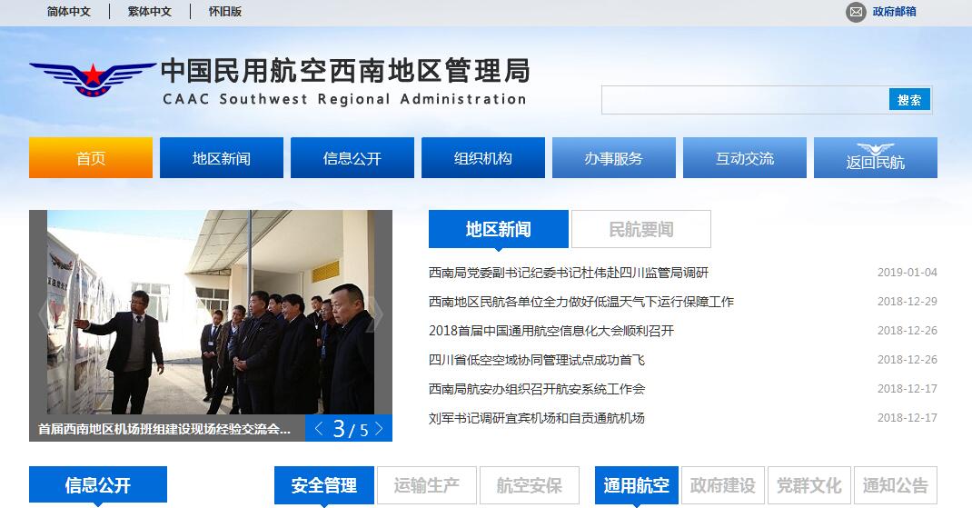 根据民航地区行政机构的主要职能,民航西南地区管理局设置19个职能机构、3个党群工作机构和1个离退休干部工作机构。1、办公室(外事办公室、港澳台事务办公室、应急管理办公室)。协助地区管理局领导处理日常行政事务,综合协调、督促检查地区管理局机关政务工作;负责地区管理局机关的文秘、机要、保密、档案、信访、行政管理、政务公开、电子政务等工作;负责地区管理局的外事管理与接待工作;承担辖区内民航应急工作和重大事项的组织协调;按授权,处理辖区内涉港澳台民航事务。2、航空安全办公室。综合管理辖区内的民用航空安全;组织调查处理辖区内的一般民用航空飞行事故、地面事故和飞行事故征候及其他不安全事件;参与辖区内重、特大运输飞行事故的调查处理工作;发布安全指令和安全通告;负责辖区内民用航空安全信息的收集、分析和发布;按规定组织辖区内安全评估工作并承办航空安全奖惩工作;组织、指导辖区内的航空安全教育和航空安全管理研究工作;承担地区管理局航空安全委员会的日常工作。3、政策法规处。负责地区管理局领导法律顾问和法律事务工作;提出政策建议;负责地区管理局各项政策、规定和合同草案的法律审查;组织并监督辖区内民航行政执法;负责辖区内行政处罚的审查和执行;负责辖区内民航各类行政执法监察员的管理;指导辖区内民航企事业单位法律工作;负责辖区内行业改革的有关工作,审核企业、机场联合兼并和改制上市,受理企业、机场不公平竞争的设诉;负责辖区内以地区管理局为业务主管单位的社会团体的管理。4、计划统计处(节能减排办公室)。研究提出所辖区域民用航空发展规划,对民用机场布局和机场、航路建设规划提出建议;负责辖区内民用机场新建、改扩建、迁建等项目的前期审查;负责辖区内民用机场使用政府性基金补贴项目的审核或审批及其监督工作;承办辖区内购租航空器项目的评估工作;负责辖区内行业信息统计工作;负责地区管理局及其所属单位的固定资产投资及基本建设、技术改造、利用外资等计划项目的管理;负责辖区内民用航空企事业单位收费监督和航油供油保障的有关工作;负责辖区内民用航空机电产品国际招投标的监督管理;承担辖区内民航行业节能减排有关管理工作。5、财务处。负责直属单位的资产管理、资金管理和外汇额度使用管理;监督管理辖区内国家财政专项资金使用;负责直属单位的财务预决算管理及辖区内财务信息统计工作;负责直属单位政府采购工作;负责直属单位固定资产投资项目财务与资金管理;监督检查直属单位财务管理情况,负责组织管理局权限内的民航基本建设项目竣工决算审批;负责辖区内行政性收费的监督;协助征收政府性基金;负责地区管理局日常财务管理工作;承担对有关领导干部的经济责任审计和离任审计工作。6、人事科教处。管理和指导地区管理局机关及直属单位的人事、劳动工资、机构编制、社会保险、培训教育、智力引进、科技等工作;按规定权限管理直属单位领导干部;负责地区管理局机关及其派出机构的公务员招录、考核、任用、调配等工作;组织实施辖区内民航科技项目,协调科技成果推广应用工作;负责辖区内民航信息化管理以及网络与信息安全监管工作;承担辖区内民航主体系列职称评审相关工作,协调辖区内行业培训和人才队伍建设工作。7、运输管理处(国防动员办公室)。对辖区内民用航空运输(含国际航空运输)市场实施监督管理,参与对民用航空企事业单位收费的监督;审核辖区内航空运输企业的经营许可申请;按规定权限审批航空运输企业航线及加班、包机申请;负责辖区内航空运输地面服务、计算机订座系统的市场准入及其监督管理;管理辖区内民用航空消费者事务,负责消费者对辖区内航空运输企业投诉受理的监督管理;管理辖区内民用航空国防动员工作;组织协调辖区内重大、特殊、紧急运输航空抢险救灾工作;对辖区内民用航空客货运输安全以及危险品航空运输实施监督管理。8、通用航空处。对辖区内通用航空市场实施监督管理;负责辖区内通用航空企业的经营许可管理,办理辖区内非经营性通用航空的登记并实施监督;组织协调辖区内重大、特殊、紧急通用航空抢险救灾工作。9、飞行标准处。负责实施民用航空器运营人在辖区内的运行合格审定及补充审定并进行持续监督检查;办理对辖区内飞行训练机构的合格审定事宜;负责辖区内民用航空飞行人员、乘务人员的资格管理。10、外国航空公司运行监管处。协助民航华北、华东、中南地区管理局负责辖区内外国和我国特别行政区公共航空运输承运人运行的持续监督检查。11、航空卫生处。监督管理辖区内的民用航空卫生工作,负责辖区内民用航空人员体检鉴定工作并审核颁发体检合格证;对辖区内民用航空体检单位委任代表及民用航空体检人员委任代表进行资格审查,并监督检查其工作;负责对辖区内民用运输机场的应急救护预案、国内交通卫生检疫条例实施预案的审查,并实施监督检查。12、航务管理处。审核报批或批准辖区内民用航空飞行程序、运行最低标准、低能见度运行程序等各类应急程序;承办有关飞行程序的验证试飞、新技术应用推广工作;负责对辖区内航务代理工作实施监管;负责对辖区内民用航空飞行签派委任代