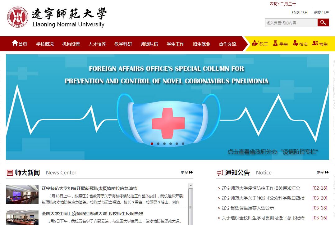 辽宁师范大学是一所省属重点大学,坐落在中国北方美丽的海滨城市——大连,是辽宁省“双一流”建设国内高水平大学重点建设高校、教育部“卓越中学教师培养计划”项目实施学校,是辽宁省基础教育师资培养与继续教育基地、教育科学研究咨询基地、高校师资培训基地、适应地区经济建设与社会发展需要的科研基地,现已成为辽宁省最大的、起示范带头作用的教师教育中心。作为新中国诞生后首批建立的高等师范院校之一,学校始建于1951年9月,初建时为旅大师范专科学校。1953年4月,更名为大连师范专科学校。1958年7月,大连师范专科学校和大连外国语专科学校合并,组建大连师范学院。1960年7月,更名为辽宁师范学院。1983年12月,更名为辽宁师范大学。67年来,学校与祖国共奋进,与时代同发展,砥砺耕耘,自强不息,先后为国家和社会培养了20余万名合格人才。学校始终坚持社会主义办学方向,全面贯彻国家教育方针,秉承“厚德博学、为人师表”校训,秉持“以人为本、质量至上”办学理念,在培养科学精神与人文精神相融合、实践能力强的高级专门人才的同时,积极致力于现代教师教育,着眼于学校的综合性、国际化的长远发展,解放思想,抢抓机遇,深化改革,不断凝聚发展力量,增强发展动力,积累了丰富的办学经验,形成了优良的办学传统,学校办学实力显著增强,各项事业持续、健康、协调发展,正向着教师教育特色鲜明的高水平综合性大学建设目标迈进。学校现有教职工1878人,专任教师1146人。普通本科在校生13000余人,硕士、博士在校生近5000人。现有国务院政府特殊津贴获得者12人,“长江学者”奖励计划青年学者1人,新世纪百千万人才工程国家级人选2人,教育部新世纪优秀人才3人,“双聘”院士1人,辽宁省百千万人才工程百人层次人选28人,千人层次人选22人,辽宁省优秀专家5人,辽宁特聘教授16人,辽宁省“攀登学者”2人,辽宁省高校优秀人才58人,大连市突出贡献专家1人,大连市优秀专家16人,大连市政府特殊津贴获得者7人,大连市领军人才培养工程人选7人,大连市领军后备人才6人。学校校园现有两个校区(包括黄河路校区、西山湖校区),设有22个学院,设有研究生院。现有5个博士后科研流动站,9个一级学科博士点,4个二级学科博士点,1个博士专业学位授权点;27个一级学科硕士点,11个专业学位硕士点;4个辽宁省高等学校一流特色学科(一级学科),其中有3个一级学科入选辽宁省“一流建设学科”;9个辽宁省重点学科。学校现有66个本科专业,有国家级特色专业6个,省示范性专业11个,省优势特色专业4个,省重点建设专业15个;国家级各类精品课程3门,省级各类精品课程34门,省级研究生精品课程4门;国家级规划教材10部,省级精品教材7部;国家级教学团队2个,省级教学团队8个;国家级教学名师1人,国家万人计划教学名师1人,省级教学名师16人,省级专业带头人5人;省级人才培养模式创新实验区1个;省级实验教学示范中心7个;省级虚拟仿真实验教学中心4个;获评省级教师教学发展示范中心建设单位;国家级大学生校外实践教育基地建设项目1项;省级大学生实践教育基地建设项目11项;省级教师教育改革创新实验区2个;国家级高等教育教学成果奖5项,基础教育教学成果奖2项;省级高等教育教学成果奖51项;教育部基础教育课程改革成果奖2项,省级基础教育课程改革成果奖5项。学校现有海洋经济与可持续发展研究中心(部、省共建人文社科重点研究基地)、海洋生物制药国家地方联合工程技术研究中心(国家发改委批准共建)、海洋基因工程药物与天然活性产物工程研究中心(辽宁省高校重大科技平台);现有7个省级重点实验室,4个省高校重点实验室;1个省级工程技术研究中心;2个省级协同创新中心,6个省高校人文社科重点研究基地,2个智库基地,11个其他类型研究基地;10个省高校创新团队;另参与筹建4个省级协同创新中心;有7个市级重点实验室、1个市级工程研究中心;设有高校社科联、科协;创建了牛河梁红山文化研究院。“十二五”期间,学校教师主持完成及在研科研项目1318项;出版专著926部;发表论文8879篇,其中被SCI收录845篇,被EI、ISTP、SSCI等收录410篇;获授权专利42项;获得各项科研成果奖励492项;签订“四技”合同71项。学校积极构建国际合作大平台,已与21个国家和地区的108所大学、科研机构建立了交流合作关系。学校经国务院学位委员会批准,与美国密苏里州立大学合作建设国际商学院。学校的国际教育学院是国务院侨办确立的华文教育基地,是教育部批准的外国留学生定点招生单位,是辽宁省来华留学教育示范基地,每年接收来自50多个国家和地区的外国留学生1000余人次,并设有汉语水平考试(HSK)考点。学校还在美国迈阿密大学、意大利米兰国立大学设立了孔子学院。学校先后被评为全国党建和思想政治教育工作先进单位、高校创新创业教育研究与实践先进单位、青少年教育工作先进单位、社会实践活动先进单位、高校物业管理先进单位、高校后勤信息与宣传先进单位、计划生育系统质量管理QC成果先进单位,教育部青少年犯罪研究工作先进单位、首批国家语言文字规范化示范校、国家语言文字工作先进集体、普通话水平测试先进测试站。先后获评辽宁省先进基层党组织,辽宁省深化创新创业教育改革示范高校,辽宁省普通高校思想政治工作、学籍管理工作、大学