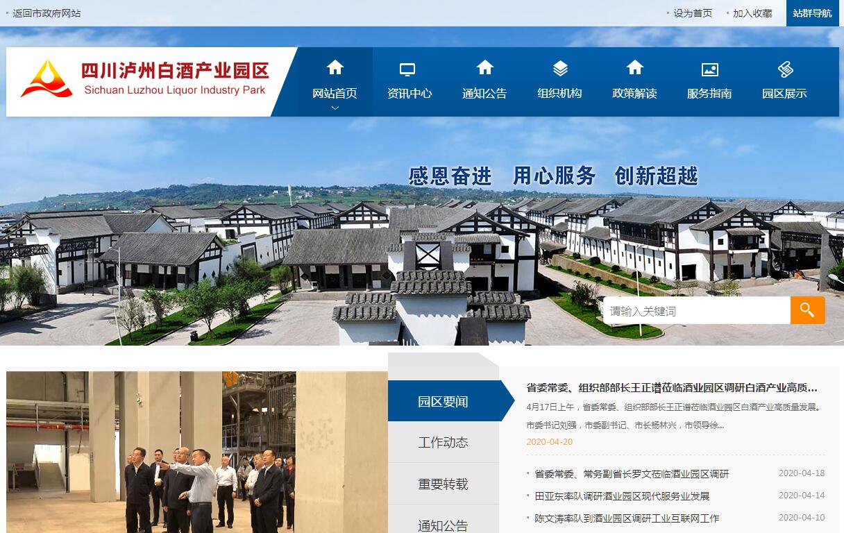 四川泸州白酒产业园区是经四川省人民政府批复同意设立的省级开发区,是全国首个以白酒制造为主导的专业化、集群化、全产业链园区。园区始建于2006年,经过10余年发展壮大,建成和在建面积达10平方公里,集聚企业200余户。先后创建为国家新型工业化产业示范基地、全国浓香型白酒综合加工产业知名品牌创建示范区、全国产业集群区域品牌建设白酒产业试点地区、全国模范劳动关系和谐工业园区。2018年,园区产值和服务性收入达710亿。目前,园区呈现四大特点:一是突出专业化与集约化。拥有两条较完整的产业链条。一条为白酒制造,涵盖原粮种植、酿造储存、灌装生产、检验检测、仓储物流、会展金融;另一条为包材生产,涵盖玻瓶、瓶盖、包装盒、包装箱等产品,覆盖研发、设计、印制、防伪等环节。二是突出科技与创新。拥有四大国家级功能平台,即国家固态酿造工程技术研究中心、国家酒类及加工食品质量监督检验中心、国家酒类包装产品质量监督检验中心和中国白酒产品交易中心。截至目前,四大中心及企业共承担省级以上科技项目75个,其中国家级项目13个,累计申请专利1232件。三是突出开放与合作。园区国际会展中心连续12年承办酒业博览会12届,2013年升格为国家级展会,2014年被确定为中国国际酒业博览会永久会址,是目前国内规模最大的酒类专业展会。2019年,有来自40个国家的政商代表、1000余户中外企业、5000余款酒类产品参展。四是突出绿色与生态。园区始终坚守安全环保生产红线,基础设施日趋完善,承载能力不断提升,实现废水、废气、废渣达标排放,综合循环利用。当前,为推动转型升级,园区以“创新、协调、绿色、开放、共享”五大发展理念为指导,致力打造“三区一核一中心”宏伟构想。总规划面积89平方公里,按照工业、农业、城镇三大板块设计,做大做强做优以酒为基础的上中下游产业链,实现“一二三产联动、产城乡大融合”发展格局。到2020年建成千亿园区;到本世纪中叶,逐步建成国家级经济开发区、国家级产城融合示范区、世界级酒文化集中展示区、中国白酒金三角核心腹地、世界级酒业会展交易中心,争创世界级白酒先进制造业集群。四川泸州白酒产业园区管理委员会,是市委、市政府派出机构,为正处级,党工委与管委会合署办公,其主要职责是:(一)贯彻执行党的路线、方针、政策和国家法律、法规,执行市委、市政府的决定;根据全市经济社会发展规划和年度计划,组织编制和修改酒业园区的总体发展规划和年度计划,并组织实施。(二)根据泸州城市总体规划和酒业园区总体发展规划,编制酒业园区国土空间规划及其他专项规划,经审查批准后组织实施。(三)负责酒业园区产业发展、经济运行、对外合作、招商引资等工作。(四)负责酒业园区内基础设施和公共服务设施建设和管理,按时序推进土地开发。(五)负责住房和城乡建设行政主管部门委托的酒业园区规划区范围内住房和城乡建设管理工作,为入园企业生产经营提供各项服务工作。(六)负责酒业园区财源建设,承担酒业园区财政收支管理责任,负责财政资金绩效评价,负责酒业园区税收征管协调工作。(七)负责酒业园区党建、纪检、监察、组织、人事、宣传、统战、群团等工作。(八)负责酒业园区综治、信访、维稳、法治、应急管理等工作。(九)负责承接省、市下放的各项权力事项,承担相应的法律责任。(十)负责职责范围内的安全生产和职业健康、生态环境保护、审批服务便民化等工作。(十一)完成市委、市政府交办的其他任务。
