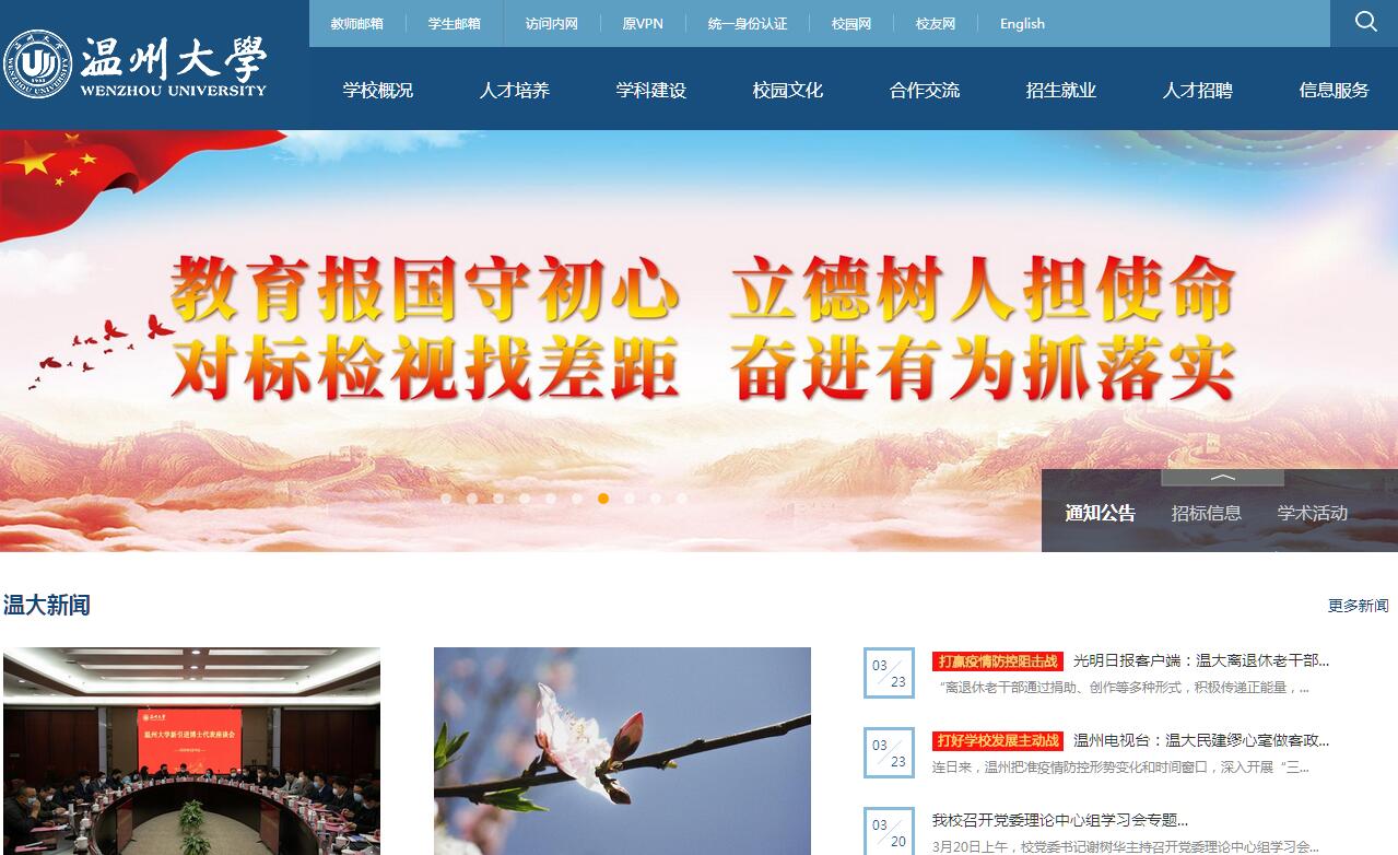 温州大学是一所地方综合性大学,办学历史可追溯到温州近代著名爱国爱乡人士黄溯初先生1933年创办的温州师范学校,文化底蕴深厚,有着优良的办学传统。学校位于浙江省南部美丽的沿海城市温州。学校占地总面积1985亩,分茶山校区和学院路校区。茶山主校区位于温州高教园区内,南眺罗山群峰,北蕴三垟湿地,山水灵秀与翰墨书香相得益彰,是莘莘学子修身治学的绝佳所在。学校校舍面积101.28万平方米,教学科研仪器设备总值5.39亿元,校本部馆藏纸质图书178.8万册,电子图书约177.5万册,各类中外文电子期刊和资料数据库78个。学校本部下设15个学院,现有全日制在校生14481人,各类成人继续教育学生9846人;教职工1746人,其中专任教师1072人,专任教师中具有正高职称教师189人、副高职称教师388人。有各级各类人才工程入选者320人(532人次),拥有双聘院士2人、国家“万人计划”人选1人、“长江学者”特聘教授1人、国家杰出青年基金获得者1人、国家“有突出贡献中青年专家”3人、“国家百千万人才工程”人选4、国家“千人计划”人选3人、国家优秀青年基金获得者1人、享受国务院政府特殊津贴专家9人、外专高端文教专家5人、浙江省特级专家1人;全国先进工作者1人、全国“五一”劳动奖章获得者1人、全优秀教师2人等一批高层次人才。举办瓯江学院(独立学院),开设44个本科专业,全日制在校生7306人,拥有一支相对独立的教师队伍。我校现拥有17个一级学科硕士学位授权点和12个硕士专业学位授权点。化学、中国语言文学为浙江省一流学科A类支持学科,电气工程、法学、马克思主义理论、应用经济学、机械工程、生态学、土木工程为浙江省一流学科B类支持学科。化学学科进入ESI全球1%,浙江省内排名第3。根据《中国研究生教育及学科专业评价报告》统计,我校研究生教育竞争力排行由2010年的63%连续7年持续提升到2016年的38%。在招44个本科专业,涵盖文学、理学、工学、法学、教育学、经济学、历史学、管理学、艺术学等学科门类,拥有2个国家级特色专业建设点、1个国家级专业综合改革试点、5个教育部卓越工程师教育培养计划试点专业,37个省级重点(建设)和优势、特色(国际化)专业;10门国家级精品课程和精品资源共享课程、38门省级精品课程,6部国家级规划教材、31部省级重点教材,1个国家级虚拟仿真实验教学中心,1个国家级大学生校外实践教育基地,1个省级大学生校外实践教育基地,4个省级重点实验教学示范中心(建设点),8个省级实验教学示范中心,4个省级教学团队。学校牢固树立人才培养质量是办学生命线的观念,坚持教学工作的中心地位,致力于培养“重实践、强创新、能创业、懂管理、敢担当”的高素质应用型人才。建立以素质教育为主线、通识教育与专业教育有机结合的人才培养机制;积极融合地方元素,不断创新人才培养模式,全面加强大学生的创新创业教育;积极开展教学质量工程建设,不断提高本科教学质量与水平。在2008年教育部本科教学工作水平评估中获得“优秀”等级,2015年圆满完成教育部本科教学工作审核评估。学校形成“教师教育”“工程教育”和“创业教育”等办学特色;被确立为国家创业型人才培养温州模式创新实验区、全国创业教育示范院校、首批国家级“大学生创新创业训练计划”高校、首批“全国高校创新创业50强”、 首批“全国深化创新创业教育改革示范高校100强”、国家级众创空间、教育部“卓越工程师教育培养计划”试点高校和浙江省教师教育基地;近五年来,获得国家级教学成果一等奖1项、二等奖1项,浙江省教学成果一等奖9项、二等奖17项。学生参加各类竞赛获得国际级奖项28项、国家级奖项687项、省级奖项2644项。学校始终以服务地方经济社会发展为己任,坚持基础研究与应用研究协同发展,坚持人文社会科学、自然科学和工程技术研究同步推进,科研水平不断提升,服务地方能力持续增强。学校设有135个科研机构;建有2个国家级科研平台、1个浙江省“2011协同创新中心”、2个浙江省行业(区域)科技创新服务平台、6个浙江省重点实验室、4个浙江省工程实验室、1个浙江省国际科技合作基地、2个中国机械工业联合会工程研究中心(实验室)、1个中国轻工业重点实验室,2个浙江省哲学社会科学重点研究基地、1个浙江省中国特色社会主义理论研究基地、1个教育部研究基地、1个浙江省非物质文化研究基地;拥有1个教育部长江学者创新团队、5个浙江省重点创新团队和3个浙江省高校创新团队。近五年来,主持承担了国家重点研发计划项目课题3项、国家社科基金重大项目4项、国家自然科学基金重点项目4项、国家社科基金重点项目6项、国家973计划课题1项等国家级科研项目266项,省部级项目768项;科研成果获得国家科技进步二等奖1项(主持人、第3单位)、教育部高等学校科学研究优秀成果奖(科学技术)一等奖1项、二等奖3项、教育部高等学校科学研究优秀成果奖(人文社会科学)二等奖1项、三等奖5项、浙江省科学技术一等奖2项、二等奖6项、三等奖4项、浙江省哲学社会科学优秀成果一等奖5项等省部级以上科研成果奖励51项。学校大力推进国际化办学进程,在教学、科研各方面开展了广泛的国际交流与合作。迄今已与18个国家和地区的75所院校建立了交流与合作关系。与美国肯恩大学合作创办温州肯恩