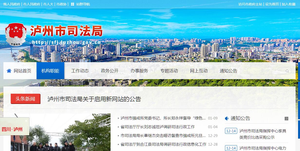 泸州市司法局主要职责:(一)贯彻执行国家、省、市关于司法行政工作的方针、政策和法律、法规及规章,拟订司法行政规范性文件,制定工作发展规划和工作计划,并组织实施。(二)负责指导、监督司法行政系统强制隔离戒毒、戒毒康复场所的管理工作。(三)拟订普及法律常识规划和法制宣传教育计划并组织实施,指导全市各地、各行业的法制宣传和依法治理工作。(四)负责指导、监督律师、公证、法律顾问、外来企业投诉工作,负责行政处罚工作;监督管理全市的法律援助工作;组织承办国家司法考试工作。(五)指导、监督基层司法所建设和人民调解、基层法律服务、社区矫正、安置帮教工作。(六)主管司法鉴定机构和司法鉴定人的管理工作。(七)指导本系统依法行政工作,监督管理所属社团组织。(八)负责司法行政系统的服装、警车等装备的管理工作。指导、监督市强戒所的计划财务和内部审计工作。(九)指导、监督全市司法行政系统队伍建设和思想政治工作,协助区县管理司法局的领导干部,负责市强戒所警务管理和警务督察工作。(十)履行廉政建设职责,执行廉政建设责任制的各项规定。明晰职权,防控廉政风险,建立行政权力公开透明的运行机制,推进廉政建设的标准化、规范化、制度化。(十一)承担市政府批准保留的行政审批事项。(十二)承办市政府交办的其他事项。