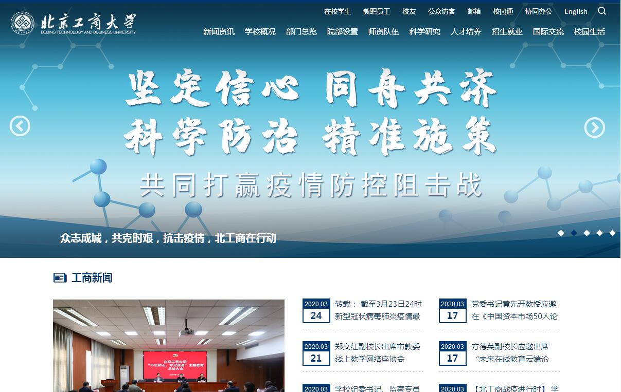 北京工商大学是北京市重点建设的多科性大学,1999年6月经教育部批准由北京轻工业学院与北京商学院合并,机械工业管理干部学院并入组建而成。北京商学院先后隶属商业部、国内贸易部,前身是中华全国供销合作总社干部学校和中央商业干部学校。中华全国供销合作总社干部学校建于1950年初,中央商业干部学校建于1953年,1958年中华全国供销合作总社干部学校合并到中央商业干部学校。1959年商业部经国务院批准成立中央商学院,1960年更名为北京商学院,中央商业干部学校与北京商学院合并。1969年北京商学院因“文化大革命”停办,1978年经国务院批准恢复招生。北京商学院是我国建国后建立较早的专门培养经济管理人才的高等院校之一,是国务院批准的全国首批硕士学位授予单位。北京轻工业学院创建于1958年,是我国最早建立的一所轻工业高等学校。1970年迁入陕西省咸阳市,1978年经国务院批准在北京原址重建,先后隶属于轻工业部和中国轻工总会,主要面向轻工行业培养高级专门人才。机械工业管理干部学院建于1982年,隶属于机械工业部,主要是面向机械工业行业培养管理干部。迄今学校已为国家培养了十万余名各级各类专门人才。合并组建后的北京工商大学步入了新的发展时期,综合实力显著增强,现已发展成为理、工、经、管、文、法、艺等学科相互支撑、协调发展的多科性大学,并将按照“特色、内涵、规范、质量”八字方针,努力实现特色鲜明的高水平研究型大学发展目标。2003年8月,经国务院学位委员会第20次会议审核批准,学校成为联合培养博士研究生单位,2004年起与中央财经大学联合招收和培养会计学专业博士研究生。2007年6月,学校接受教育部全国普通高校本科教学工作水平评估。2008年3月,教育部召开全国普通高等学校本科教学工作评估专家委员会全体委员会议,经全体委员投票确定:北京工商大学本科教学工作的评估结果为“优秀”。2012年12月,学校食品(含保健食品)添加剂与安全成为“服务国家特殊需求博士人才培养项目”,授予学位学科名称为“食品科学与工程”。2014年9月,“食品科学与工程”学科获批新设博士后科研流动站。2018年5月,经国务院学位委员会第三十四次会议批准,学校成为博士学位授予单位,应用经济学、食品科学与工程获批一级学科博士学位授权点。学校现设11个学院、1个教学部;拥有2个国家级检测中心、1个国家级实验教学示范中心、1个国家级虚拟仿真实验教学中心、1个国家工程实验室、1个科技部中国-加拿大联合实验室、1个北京市高精尖中心、4个北京市重点实验室、1个北京市实验室、1个北京高等学校工程研究中心、1个北京市工程技术研究中心、2个北京市研究基地、获批3个省部级协同创新中心、4个北京市高校实验教学示范中心;学校现有一级学科博士学位授权点2个,“服务国家特殊需求博士人才培养项目”1个,联合培养博士学位授权点1个,一级学科硕士学位授权点16个、硕士专业学位授权点19个(其中工程硕士专业领域7个)、本科专业50个;拥有北京市重点学科4个,北京市重点建设学科6个,国家级特色专业建设点5个,北京市特色专业建设点8个,国家级本科专业综合改革试点1个,北京市专业群建设与改革试点1个,北京市专业综合改革试点3个;北京市属高校首批一流专业2个。学校现有博士后11人(含联合培养4人),博士生23名,硕士生2360名,全日制普通高等教育本科生11440名,成人学历教育学生1578名。学校总占地面积82万平方米(合1230.6亩),其中阜成路校区21万平方米,良乡校区61万平方米。总建筑面积45.68万平方米,其中阜成路校区19.88万平方米,良乡校区25.80万平方米。固定资产总值26.95亿元。图书馆馆舍总面积25793平方米,截至目前,图书馆纸质文献171.9582万册、中外文期刊921种、报纸67种、电子图书88.8万余种、数据库100个。“十五”时期以来,抢抓机遇,积极拓展办学空间,不断完善基本条件,完成了阜成路校区改造和良乡校区一期等北京市重点工程建设项目,良乡校区新建面积达25.8万平方米,2004年10月,8千余名学生顺利入驻,良乡校区一期工程的建成,为莘莘学子的健康成长提供了良好的学习环境,为学校新时期跨越式发展奠定了坚实的物质基础。“十一五”及“十二五”时期,学校逐步完善阜成路校区和良乡校区的基础设施条件。2017年12月29日,良乡校区二期新建工程举行开工奠基仪式,“十三五”期间完成良乡校区二期新建工程建设,实现“整合校园资源、优化办学空间、提升条件保障”的目标。学校现有教职工1460人,其中专任教师952人。专任教师中,教授151人,副教授395人,具有博士和硕士学位的教师分别为594人和283人,占专任教师总数的92.1%。现有中国工程院院士4人(含双聘院士2名,兼职教授1名),国家“千人计划”入选者1人,全国优秀教师1人,新世纪百千万人才工程国家级人选2人,国家百千万人才工程人选1人,北京学者1人,享受政府特殊津贴专家11人,科技部创新人才推进计划中青年科技创新领军人才1人,省部级有突出贡献专家6人,教育部新世纪优秀人才2人,人力资源和社会保障部留学人员科技活动择优资助1人,新世纪百千万人才市级人选3人,北京市跨世纪优秀人才工程4人,北京市高校青年学科带头人4人,北京市“高创计划”青年拔尖人才3人,北京市科技新星10人,北京市优秀教师7人,北京市优秀教育工作