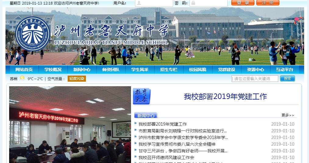 泸州老窖天府中学历经变迁,有着百余年办学历史。学校前身为1912年泸州老窖传人温筱泉与同盟会会员陈漱云创办的川南女子师范传习所,后更名育群女子中学,以及1937年民国时期川军将领杨森创办的成都天府中学泸县分校,后更名峨岷中学,新中国成立后,两校于1950年合并为泸州市第二中学校,2008年,泸州老窖集团公司捐资助学,遂冠名泸州老窖天府中学,为泸州市直属中学,四川省一级示范高中(即国家级重点中学)。学校现占地463亩,总投资4.6亿元,建筑面积13.5万平方米。现代化教育教学设施设备日趋完善,拥有理化生实验室、通用技术教室、图书阅览室、未成年人心理成长辅导中心、国际域名校园网站、网管中心、两个标准田径运动场等教学设施;正在建设游泳馆、体育馆、艺术活动中心。学校现有教学班126个,高中88个班,初中38个班,共有学生6500余人。有450名教职工,拥有特级教师、正高级教师、全国模范教师、全国优秀教师8人,教育硕士研究生110余名。一百多年以来,学校培养了近6万名合格毕业生,有1000余名学子成为科技、文化、教育、党政军等领域的优秀杰出人物,学子遍布全国各省及各大中城市和世界一百多个国家。学校荣获全国现代教育技术实验学校、全国青少年文明礼仪教育示范基地、全国中小学中华优秀文化艺术传承学校、全国体育工作示范校、全国学校艺术教育先进单位等国家级称号13项,获得四川省一级示范高中(即国家级重点中学)、四川省校风示范校、四川省阳光教育示范校、四川省校本研修示范校等省级称号35项,获得泸州市素质教育示范学校等市级称号50余项。学校通过了国际质量管理体系和国际环境管理体系双认证,为首批四川省示范性普通高中、泸州市教育局直属公办学校。学校秉承“真、美、信、和、毅”的校训,秉持“崇实励学,致知力行”的校风,以深厚的文化底蕴为载体,全方位对学生进行学习能力和综合能力培养,注重学生个性发展,确立了学生、教师和学校三位一体的“成长教育”理念。学校构建了“政府管理为主,企业扶持为辅,社会各界参与,学校办学自主”的新型办学体制。教学管理规范严格,注重过程管理和精细化管理,实施初中教育和高中教育“六年一贯制”改革。学校着眼百年名校教育品牌打造的长远发展战略,奋力向高品质、创新性、国际化的现代学校迈进。