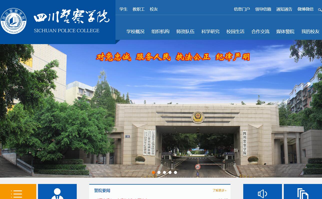 四川警察学院是由四川省政府主办,四川省公安厅和四川省教育厅按职责分工共同管理的全省唯一一所全日制政法公安类普通本科院校,是四川警力补充的主渠道和民警培训的主阵地。学校始于1950年建立的川西人民行政公署公安厅公安学校,2000年建立四川警官高等专科学校,2006年升本建立四川警察学院,2011年获批警务专业硕士研究生培养试点项目,2018年获批硕士学位授予单位,是全国31所省属公安院校中第六所升本、第一所开展警务专业硕士研究生教育、第一所拥有硕士学位授予权的学校。公安部先后在学校建立公安部警务实战训练四川基地、援藏办学点、国际维和警察选拔培训点,省公安厅在学校建立四川省公安厅警官培训基地、四川省公安民警心理训练基地、四川省公安厅战训基地。学校以“铸造忠诚警魂、培育时代新警、服务公安工作”为办学宗旨,秉承“政治建警、依法治校、从严治学、特色发展”办学理念,坚持公安学历教育、在职民警培训和警务科学研究协同发展,走职业化应用型内涵式发展道路,立足四川、面向政法,培养适应现代警务发展需要,具有忠诚政治品格、严明法纪意识、良好人文素养、扎实专业知识、过硬警务技能和富有创新精神的公安专业人才,努力建成具有鲜明区域特色的国内高水平公安本科高校。学校先后为各级公安机关和政法部门培养输送6万余名毕业生,涌现出8700余名英雄、模范、功臣,110余名校友为共和国献出生命,被誉为“警察的摇篮、英雄的熔炉、精神的铸所”。学校位于四川省泸州市,占地面积467.15亩,固定资产总值44993.94万元,其中教学仪器设备15029.98万元、图书92.01万册;现有本科生5046人、硕士研究生15人;教职工457人,其中专兼职教师355人(正高职称44人,副高职称91人,硕博士219人),实行公务员和人民警察身份管理;开设有侦查学、治安学、公安管理学、禁毒学、刑事科学技术、交通管理工程、网络安全与执法、消防指挥、法学9个本科专业;建有国家级实验教学示范中心1个,国家精品课程3门,国家级教学团队1个;省级人才培养模式创新实验区1个,省级实验教学示范中心1个,省级虚拟仿真实验教学中心1个,四川省高校重点实验室1个,省级精品课程10门,省级特色专业2个,省级应用型示范专业3个,省级教学团队3个,省社科联及省教育厅人文社科研究基地5个。党的十八大以来,学校深入研判公安高等教育发展面临的时代背景和学校基本校情,深刻总结和反思学校在办学定位、人才培养和特色培育等方面存在的突出问题和原因,迅速作出“回归公安本位、贴近公安实战、服务公安工作”的转型决定,明确“职业化应用型”发展方向,确立“归位发展、内涵发展、特色发展”总体思路,按照“控规模、调结构、突特色、重实战、提质量、促发展”实施路径,积极抢抓发展机遇,持续深化综合改革,取得明显成效,各项事业发展步入良性轨道。中国特色社会主义进入新时代,学校党委深入学习领会党的十九大精神和习近平新时代中国特色社会主义思想,按照“符合现代高等院校特征、体现现代警察院校特点、突出四川警察学院特色”要求,提出今后一段时期指导学校各项事业发展的“一二三四五”发展战略。总体思路是:瞄准一个目标,围绕两大中心,坚持三线并进,打造四个平台,实施五大工程。“一个目标”即:到2022年,基本形成结构合理、重点突出、特色鲜明、竞争力强的一流公安类学科专业体系,全面建立以职业化、专业化、实战化为导向的人才培养机制,人才供给质量和科研服务能力稳步提升,内部治理体系更加完善,治理能力明显增强,功能布局更趋合理,运行机制更具活力,基本建成具有鲜明区域特色的国内高水平公安本科院校;“两大中心”即:围绕服务支撑国家藏区稳定战略和西部边疆安全战略,服务支撑国家中心城市首位提升和国家“一带一路”倡议两大中心任务;“三线并进”即:坚持预备警官培养、在职民警培训、警事科学研究三条主线并重并进,全面推进学校内涵建设和特色发展;“四个平台”即:按照“校警联动,教战一体,建制管理,常态值守”要求,着力打造覆盖四川和辐射周边藏区的预备警官培养阵地、藏区民警综合训练基地、服务实战和支撑决策的四川警事科学研究院、支撑国家中心城市和辐射主要藏区的应急处突战备基地四个平台;“五大工程”即:以大思政育人体系建设、学科专业建设和警察职业能力提升、优质师资团队培育、公安智库建设、涉藏警务特色打造等“五大改革系统工程”为牵引,不断夯实办学治校基础,全面提高办学质量和教学科研水平,为全省公安工作和公安队伍建设提供人才保障和智力支撑,为建设美丽繁荣和谐四川贡献更大力量。