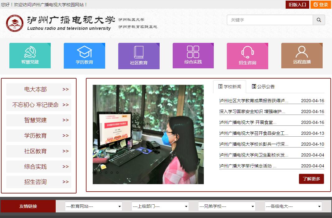 泸州广播电视大学(简称:泸州电大)成立于1983年11月21日,当时的名称为四川广播电视大学泸州分校。1994年8月9日,经四川省泸州市人民政府批准更名为泸州广播电视大学。1999年8月20日,原泸州广播电视大学与原泸州市商业技工学校合并,重新组建新的泸州广播电视大学。开放本科办有金融、法律、工商管理、汉语言文学、会计学五个专业;大专开设有文科、财经、政法、理工、 医科、外语、农科、艺术、国防军 事教育等九大类133个专业;中专开设有文科、师范、工科、财经、艺术五大类36专业。泸州电大创办以来,为适应我国改革开放和社会主义现代化建设的需要,坚持“面向基层、面向地方、面向农村、面向边远和民族地区”的办学方针,应用各种现代化教学手段,多层次、多规格、多功能、多种形式开展办学。20年来已为泸州及全省、全国输送了万余名毕业生。开展各种岗位培训5000多人次。电大毕业生已成为我市社会发展和经济建设各条战线上一支“下得去、留得住、用得上、信得过”的生力军。2009年,泸州电大拥有在四县三区共有近30余个教学点组成的基本覆盖泸州全市城乡的办学网络,本科、 大、中专学历教育在校生达4千人。她直接接受省电大业务指导,执行统一的教学计划、大纲、教材、考试和评分标准,采取面授、收视、收听音像教材和计算机多媒体教材及网 上辅助教学相结合的教学手段,实行分级办学、分级管理、分级负责的办学体制,独具教育资源优质共享、开放办学的特色。泸州电大以服务基层、农村和边远山区、少数民族地区为办学宗旨,以培养社会主义现代化建设需要的,德、智、体全面发展的应用型、职业型、复合型专业人才为目标,实行多层次、多形式、多规格、多功能办学。学校附近有泸州化工职业技术学院、泸州高等职业技术学院等,还设有远程教育基地——成人教育中心和指导毕业生就业工作的职业介绍所。泸州电大学历教育办有:成人专科起点本科;大专、大专预科、中专;普通专科(含高职班)、普通中专、职业中专;教育本、专科和“注册视听生”教育及第二专业学历教 育、与自考沟通的本、专科教育。凡具有国家承认的大专、高中毕业文凭的人员可分别报名参加免入学考试的开放教育本、专、科,与自考沟通本、专科和“注册视听生”专科学习;非普通高中毕业的在职从业人员,通过报考高职班“3+2”考试, 可对口选报电大成人大专开设的专业。电大招收的普通、职教类专业和普通中专的农村户口的学生,均可将其户口迁移到学校所在城市;学生毕业就业派遣时可享受普通高校、中专毕业生相同待遇。另外,经过职业技能考核合格者,还可获得职业资格证书。此外还办有继续教育、岗位培训、专业证书教育以及农村燎原实用技术教育等非学历教育。二十二年来,泸州电大已培训各类学生万余人,仅为社会输送大中专毕业生就达万多人。毕业生中,大多数已成为各条战线的骨干,赢得了社会的信任。泸州电大校本部位于市区,与泸州化工职业技术学院毗邻。泸州电大各级校园占地40余亩,学校拥有适应远程教学需要的卫星电视地面接收系统、音像教材制作系统和语音 实验室、视听阅览室,多媒体交互式教室,计算中心、图书馆等现代化教学设施和与互联网 联通的校园微机网络;配备有一支以学术水平高、远程教学经验丰富的教授、副教授为骨干 的专兼职教师队伍,各电大分校也都同样拥有与其办学规模相适应的教学、管理队伍和教学 基础设施。整个电大有严格的教学质量保证体系。电大的办学规模和质量受到中外教育同行的重视。电大办学的国际交流与合作日益增强,中美合作开设的财经类三门专业课,受训学生达3万人次。 电大毕业证书为世界众多国家所承认。