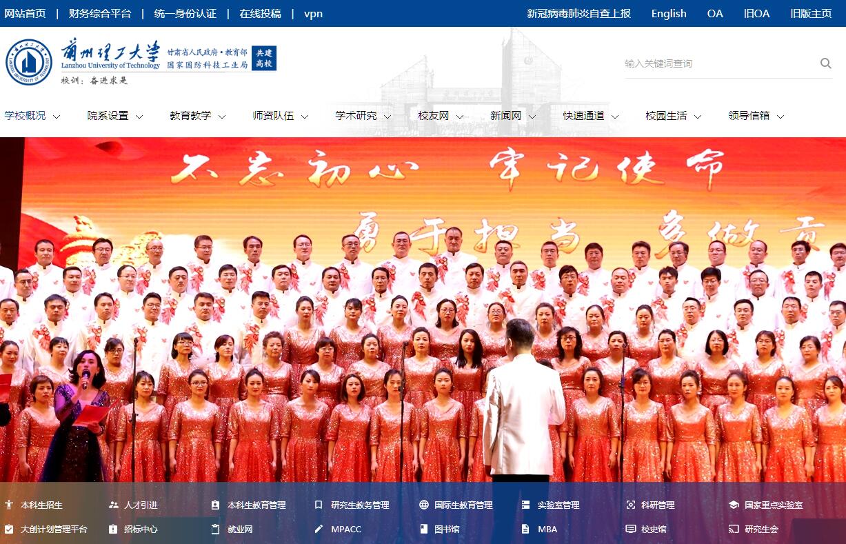 兰州理工大学坐落于甘肃省省会兰州市,是甘肃省人民政府、教育部、国家国防科技工业局共建高校,国家“中西部高等教育振兴计划”重点建设高校,“国家大学生创新型实验计划”和教育部“卓越工程师计划”入选高校,入选2016年国家国防教育特色学校,东南大学对口支援高校。学校前身是1919年的甘肃省立工艺学校;1958年,在组建兰州工学院的基础上,将甘肃交通大学并入,定名为甘肃工业大学;1965年,学校划归第一机械工业部,同时将东北重型机械学院和北京机械学院的水力机械、化工机械、石油矿场机械和焊接工艺及设备专业成建制全部迁入,并从湖南大学、合肥工业大学抽调一批教师来校工作;1998年,转制为“中央与地方共建,以地方管理为主”的院校;2003年,正式更名为兰州理工大学。经过近百年的建设与发展,学校已成为一所工科实力雄厚、理科水平不断提高、文科具有特色的多学科协调发展的理工科大学。学校现有两个校区,占地面积2430亩,校舍建筑面积108.9万平方米,图书馆馆藏图书223万册,电子图书55000GB。学校坚持立德树人根本任务,突出人才培养的中心地位,加强创新创业教育,完善质量保障体系,人才培养质量稳步提高,入选了“全国首批99个深化创新创业教育改革示范高校”。学校设有19个学院、1个教学研究部,设有研究生院、温州研究生分院。有2个国家级教学团队、3个国家级实验教学示范中心,是教育部首批示范性网络社区(易班网)试点高校,面向全国招生,有全日制在校生27075人,在2006年教育部组织的本科教学工作水平评估中获得“优秀”,在2017年本科教学工作审核评估中,获得专家好评。毕业生就业率连续多年保持在97%以上,被教育部授予“2009年度全国毕业生就业典型经验高校”称号。2015年,在解放军四总部组织的、有117所国防生培养地方高校参加的国防生军政素质基础达标考核中,我校国防生以全优的成绩位列第一名。学校有教职工2309人,专任教师1412人,其中高级职称813人,博士生导师151人,博士学位教师478人。有共享院士4人,“长江学者”特聘教授2人、国家杰出青年基金获得者2人、中国科学院“百人计划”入选者3人、中组部青年千人计划入选者3人、教育部新世纪优秀人才1人。有享受国务院特殊津贴30人、“百万人才工程”国家级人选2人,有“全国先进工作者”、 “全国师德标兵”、“全国优秀教师”1人。有甘肃省领军人才35人、“飞天学者”23人,省级“教学名师”11人。入选首批全国高校黄大年式教学团队。学校是我国首批学士、硕士学位授权高校,是甘肃省第一所具有工学博士学位授予权、第一所设置工学博士后科研流动站的高校。现有9个学科门类,涵盖了工学、理学、管理学、文学、法学、教育学、医学、艺术学、经济学。有16个省级重点学科,4个国防特色学科方向。“工程学”、“材料科学”两个学科进入“ESI排名全球前1%”。在全国第四轮学科评估中,土木工程、机械工程、材料科学与工程、控制科学与工程4个学科进入B档。冶金工程、动力工程及工程热物理在第三轮学科评估中分别位列全国高校第11位、26位。有5个博士后科研流动站、6个一级学科博士点、46个二级学科博士点、23个一级学科硕士点、170个二级学科硕士点,有6个硕士专业学位类别,有工程硕士(18个授权领域)、工商管理硕士、会计硕士、国际商务硕士、法律硕士、艺术硕士专业学位授予权。学校有66个本科专业,其中有6个国家特色专业建设点,2个教育部战略性新兴产业相关专业,1个国家级专业综合改革试点专业;机械设计制造及其自动化、过程装备与控制工程、化学工程与工艺和材料成型及控制工程4个专业通过了工程教育专业认证,土木工程、工程管理、建筑学3个专业通过住建部专业评估。学校大力推进学研产深度融合,主动服务国家和区域经济社会发展,在有色金属新材料及先进加工、高端装备及数控加工设备、新能源技术及装备、石油化工流程装备、工业控制及信息技术、土木工程及防灾减灾等研究方向形成了鲜明特色。学校现有“长江学者和创新团队发展计划”创新团队2个、国家级科技创新平台4个、教育部科研基地6个,省部级科研机构36个。学校有“省部共建有色金属先进加工与再利用国家重点实验室”,有经国家发改委批准成立的“有色金属合金加工国家地方联合工程实验室”,高新技术成果推广中心是首批国家级技术转移示范机构,大学科技园是国家级大学科技园,有经工信部批准的国家中小企业公共服务示范平台,是甘肃省首家拥有“军品三证”的高校。学校承担了包括“973”、“863”在内的多项国家重大科技项目,近五年承担国家级科研项目336项,入围了中国大学及科研院所研究影响力200强,2017年科技经费达到1.4亿元;SCI收录论文在全国高校排名达到140位,EI收录论文在全国高校排名达到71位。学校与兰州市、酒泉市、白银市、金昌市、温州市等20余个省内外城市建立了全面合作关系,与酒钢公司、金川公司、兰州石化公司、兰石集团等200多家企业建立了稳定的产学研合作关系。学校积极深化与地方政府、企业的合作,成立了“兰州理工大学——金川集团股份有限公司镍钴金属新材料协同创新中心”、“西北低碳城镇支撑技术协同创新中心 ”、“甘肃省工业经济发展研究院”、“甘肃生态建设与环境保护研究