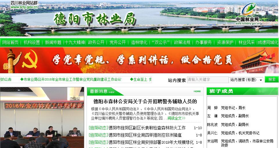 德阳市林业局主要职责:(一)贯彻执行国家有关林业的方针、政策和法律、法规,拟订全市林业及其生态建设的相关政策、中长期规划和年度计划。组织开展全市森林资源、陆生野生动植物资源、湿地和荒漠的调查、动态监测和评估,并按规定统一发布相关信息。承担林业生态文明建设的有关工作。(二)制定全市造林绿化规划和年度指导性计划,监督执行相关省级标准和规程,指导各类公益林和商品林的培育,指导植树造林、封山育林和以植树种草等生物措施防治水土流失工作,组织、指导和监督全民义务植树、造林绿化工作。承担林业应对气候变化的相关工作。承担市绿化委员会的具体工作。(三)贯彻执行国家森林采伐限额和林地保护利用规划,组织编制并监督执行全市森林采伐限额,监督检查林木凭证采伐,木(竹)材凭证运输、经营加工。组织全市森林资源调查、动态监测和统计。组织、指导林地、林权管理,组织实施林权登记、发证工作,拟订全市林地保护利用规划并指导实施,依法管理国有森林资源,承担国有森林资源资产产权变动的审核报批工作。(四)贯彻执行国家、省有关湿地保护规划及其相关的标准规定,拟订全市湿地保护规划。组织实施建立湿地保护小区、湿地公园等保护管理工作,监督湿地的合理利用。(五)贯彻执行国家、省有关防沙治沙、石漠化防治及沙化土地封禁保护区建设规划及其标准和规定并监督实施。监督管理沙化土地的合理利用,组织、指导建设项目对土地沙化影响的审核,组织、指导沙尘暴灾害预测预报和应急处置。(六)依法组织、指导陆生野生动植物的救护繁育、栖息地恢复发展、疫源疫病监测,监督管理全市陆生野生动植物猎捕或采集、驯养繁殖或培植、经营利用。承担濒危物种进出口和国家、市保护的野生动物、珍稀树种、珍稀野生植物及其产品出口的审核报批工作。(七)依法指导、监督全市森林、湿地、荒漠化和陆生野生动物类型自然保护区的建设管理和开发利用,监督管理林业生物种质资源、植物新品种保护,按分工负责生物多样性保护的有关工作。(八)贯彻执行国家有关集体林权制度、国有林场等重大林业改革意见和政策,拟订全市重大林业改革的相关实施意见和政策并指导监督实施。拟订全市农村林业发展、维护农民和其他经营者经营林业合法权益的政策措施,指导、监督农村林地承包经营和林权流转,指导林权纠纷调处和林地承包合同纠纷仲裁。依法负责退耕还林工作。指导国有林场(苗圃)、森林公园和基层林业工作机构的建设和管理。(九)拟订全市林业产业发展规划和相关政策措施并监督实施,组织指导林产品质量监督。指导山区林业综合开发。(十)承担组织、指导、监督全市森林防火工作的责任,承担市森林防火指挥部的具体工作。承担全市林业行政执法监管的责任,指导全市森林公安工作,管理森林公安队伍,指导全市林业重大违法案件的查处。指导和参与全市林业有害生物的防治、检疫工作。(十一)贯彻执行国家有关林业及其生态建设的经济调节政策,组织、指导全市林业及其生态建设的生态补偿制度的建立和实施。编制部门预算并组织实施,提出市财政林业专项资金的预算建议,管理监督市级林业资金,管理市级林业国有资产,负责提出全市林业固定资产投资规模和方向、市财政性资金安排意见,按规定权限审核报批规划内和年度计划内固定资产投资项目。(十二)负责全市林业及其生态建设的科技、宣传、教育和对外交流与合作,负责局机关公务员和直属单位干部的管理。(十三)承担市政府公布的有关行政审批事项。(十四)承办市政府交办的其他事项。