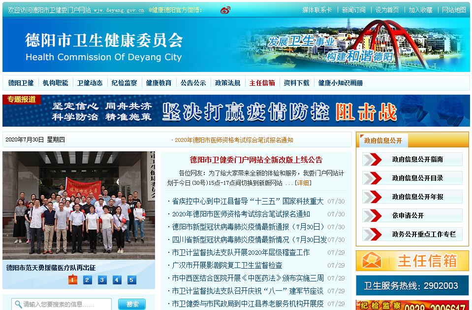 德阳市卫生健康委员会主要职责:(一)组织拟订全市卫生健康政策。负责拟订卫生健康事业发展政策、规划并组织实施。制定卫生健康地方标准与技术规范并组织实施。统筹规划全市卫生健康资源配置。拟订区城卫生健康规划并组织实施。制定并组织实施推进卫生健康基本公共服务等化、普惠化、便捷化和公共资源向基层延伸等政策措施。(二)牵头推进全市深化医药卫生体制改革。研究提出深化改革重大政策、措施的建议。牵头负责全市分级诊疗、现代医院管理、全民医保、药品供应保障、综合监管5项基本医疗卫生制度建设。制定并组织实施推动卫生健康公共服务提供主体多元化、提供方式多样化的政策措施。(三)制定并组织落实全市疾病预防控制规划、免疫规划以及严重危害人民健康的艾滋病等重大传染病、寄生虫病、地方病等公共卫生间题的干预措施。负责全市卫生应急工作,组织和指导全市突发公共卫生事件预防控制和各类突发公共事件的医疗卫生救援。依法报告传染病疫情信息、突发公共卫生事件应急处置信息。依照国家检疫传染病和监测传染病目录,参与开展检疫监测工作。(四)贯彻落实国家、省应对人口老龄化政策措施。负责推进老年健康服务体系建设和医养结合工作。承担市老龄工作委员会日常工作。(五)贯彻落实国家药物政策和国家基本药物制度。开展药械使用监测、临床综合评价和短缺药品预警。组织执行国家药典和国家基本药物目录,制定基本药物使用的配套政策措施。组织实施食品安全风险监測,开展食品安全企业标准备案。(六)负责职责范围内的职业卫生、放射卫生、环境卫生、学校卫生、公共场所卫生、饮用水卫生等公共卫生的监督管理。负责传染病防治监督,健全卫生健康综合监管体系。(七)制定全市医疗机构、医疗服务行业管理办法并监督实施,建立医疗服务评价和监督管理体系。会同有关部门实施卫生健康专业技术人员资格标准。制定并组织实施医疗服务规范和卫生健康专业技术人员执业规则、服务规范。负责医疗机构、人员和行为的日常监管。(八)贯彻执行中医药工作法律、法规和政策,实施中医药行业监管。指导基层中医药服务能力提升。组织开展中医药教育、科研和文化传承工作。协调推进中医药事业、产业、文化综合发展。(九)负责全市计划生育管理和服务工作。开展人口监测预警,研究提出人口与家庭发展相关政策建议,完善计划生育政策。(十)指导县(市、区)卫生健康工作。指导基层医疗卫生、妇幼健康服务体系和基层卫生队伍建设。推进卫生健康科技创新发展。(十一)负责市确定的保健对象的医疗保健相关工作。负责重要会议与重大活动的医疗卫生保障工作。(十二)指导市计划生育协会的业务工作。(十三)依法依规履行卫生健康行业安全生产监管职责。负责职责范围内的生态环境保护、社会信用体系建设和审批服务便民化等工作。(十四)按照本部门权责清单履行职责。(十五)完成市委、市政府交办的其他任务。