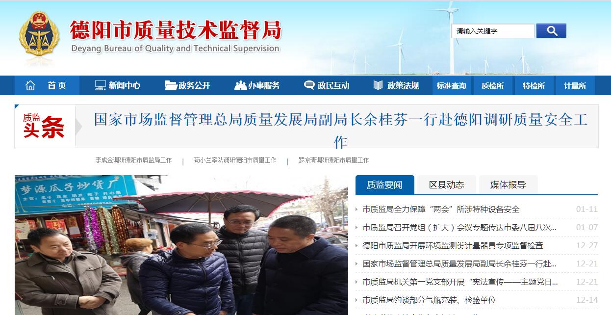 德阳市质量技术监督局主要职责:(一)贯彻执行国家和省、市有关质量技术监督工作的法律、法规和方针、政策,组织起草质量技术监督规范性文件草案;负责本部门依法行政工作,落实行政执法责任制。(二)统一管理和指导全市质量工作。组织实施国务院质量发展纲要;负责拟订提高全市质量水平的发展规划;组织实施品牌战略;组织实施质量奖励,负责推行全市产品质量诚信体系建设;研究分析全市质量形势,发布质量信息。(三) 统一管理和指导全市标准化工作。组织实施全市标准化战略;负责全市地方标准的统一立项工作;组织制定和修订区域性地方标准;负责采用国际标准、国外先进标 准工作,负责企业产品标准的备案工作;组织实施标准并监督检查;指导标准制定修订及标准体系建设;组织协调有关行政主管部门和行业组织标准化工作;管理全 市组织机构代码和商品条码工作。(四)统一管理和指导全市计量工作。组织推行法定计量单位和国家计量制度;建立全市量值传递和量值溯源体系;负责 建立和管理全市社会公用计量标准和部门、企(事)业单位最高计量标准;监督管理商品计量、市场计量行为、计量仲裁、计量检定机构、社会公正计量站;管理计 量检定人员的资质资格;负责能效标识的监督管理工作。(五)统一管理和指导全市认证认可工作。监督管理全市认证认可活动;负责全市实验室资质认定工作;组织开展实验室能力验证;监督管理全市体系认证、产品认证工作。(六) 负责全市产品质量监督工作。组织实施全市产品质量监督抽查工作;组织实施重点产(商)品质量监督工作;负责产(商)品质量仲裁检验工作;负责产品质量事故 的调查;负责工业产品生产许可证管理工作;负责纤维质量监督管理工作;负责产品防伪监督管理工作;贯彻执行缺陷产品召回制度。(七)负责食品包装材料、容器、食品生产经营工具等食品相关产品生产加工监督管理工作。(八)负责全市特种设备安全的监督管理工作。监督管理特种设备安全;负责特种设备相关单位监督检查工作;监督检查高耗能特种设备节能标准执行情况;组织指导特种设备应急能力建设。(九) 组织协调并查处违反产品质量、计量、标准化、认证认可、特种设备安全等法律、法规的违法行为;组织实施全市专项执法打击假冒伪劣工作;协调跨县(市、区) 案件的查处和大案要案的督查督办工作;负责全市质量技术监督投诉举报工作;指导监督全市质量技术监督行政执法工作。(十)组织和管理全市质量技术监督科技工作;制定并组织实施质量技术监督科技发展和技术机构建设规划;负责机动车安全技术检验机构监督管理工作;负责国家地理标志保护产品工作。(十一)承担市政府公布的有关行政审批事项。(十二)组织实施质量技术监督宣传、教育、培训、信息工作;协助相关职业资格工作。(十三)承办市政府交办的其他事项。
