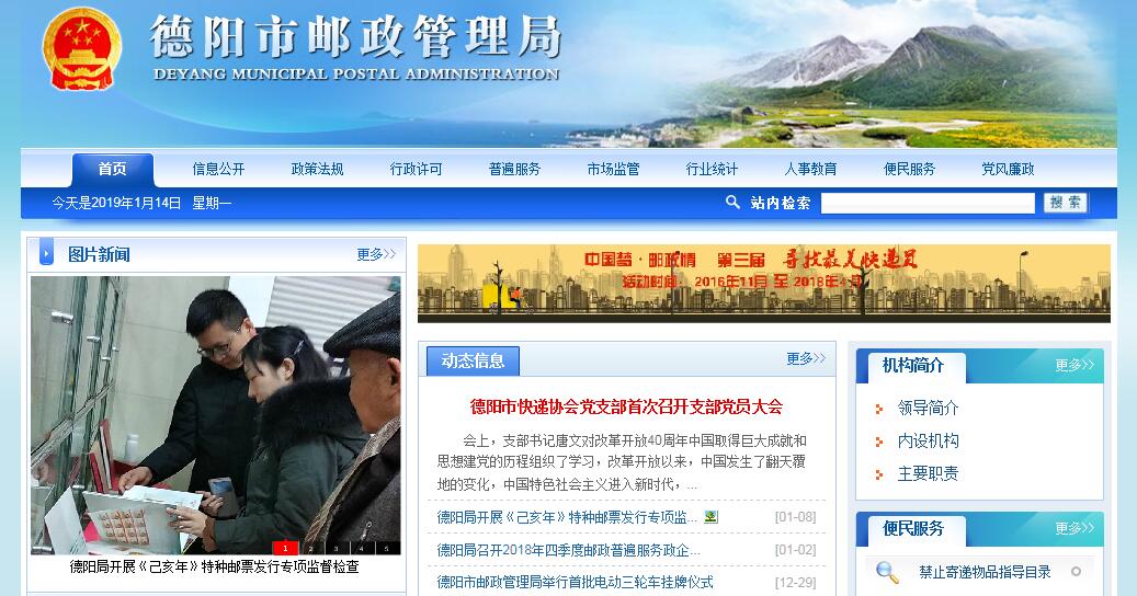 | 网站简介: 德阳市邮政管理局主要职责:一、贯彻执行国家邮政法律法规、方针政策和邮政服务标准。二、研究拟订德阳市邮政业发展规划。三、监督管理德阳市邮政、快递市场及邮政普遍服务和机要通信等服务的实施。四、负责德阳市邮政行业安全生产监管、统计等工作。五、保障邮政通信与信息安全。六、承办上级邮政管理部门和市人民政府交办的其他事项。 |