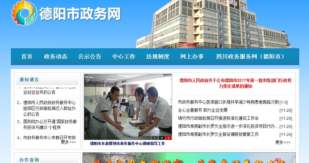 德阳市人民政府政务服务中心是由市委、市政府决定建立的为公民、法人和其他组织提供统一受理、集中办理政府服务事项的行政机构,是依法行政审批的载体、集中政务公开的载体,是市委、市政府以人为本、执政为民、服务社会的形象窗口,于2001年8月6日正式对外办公。设立政务服务中心的目的是促进政府职能、管理方式和干部作风的转变,提高行政效率、提高服务水平、提高防腐能力,为人民群众、改革开放和经济建设服务。市政务服务中心遵循的原则是“依法、规范、公开、便民、高效、廉洁”。其主要职责:(一)贯彻执行市委、市政府关于行政审批制度改革有关决定和要求。(二)制定政务服务中心的各项规章制度和管理办法并组织实施。(三)会同有关部门审查集中受理、办理政务服务事项的办事指南。(四)对进入或者退出政务服务中心集中受理、办理的要求进行初审并报市人民政府决定;对依法决定撤销或停止执行的已纳入政务服务中心集中受理、办理的政务服务事项,保障该事项在规定期限内停止执行。(五)协调和监督集中受理、办理的政务服务事项,组织各服务窗口高效、快捷地实施行政审批和政务服务工作,并适时通报政务服务工作情况。(六)对下级政务服务中心报送同级人民政府所属工作部门、机构审批的政务服务事项办理情况进行监督协调。(七)对各部门、机构在政务服务中心设置窗口提出具体意见,对进入政务服务中心的各服务窗口及其工作人员进行日常管理和考核。(八)受理公民、法人和其它组织对政务服务中心工作人员的投诉举报。(九)对下级政务服务中心的政务服务工作进行指导。(十)完成市委、市政府交办的其他工作。