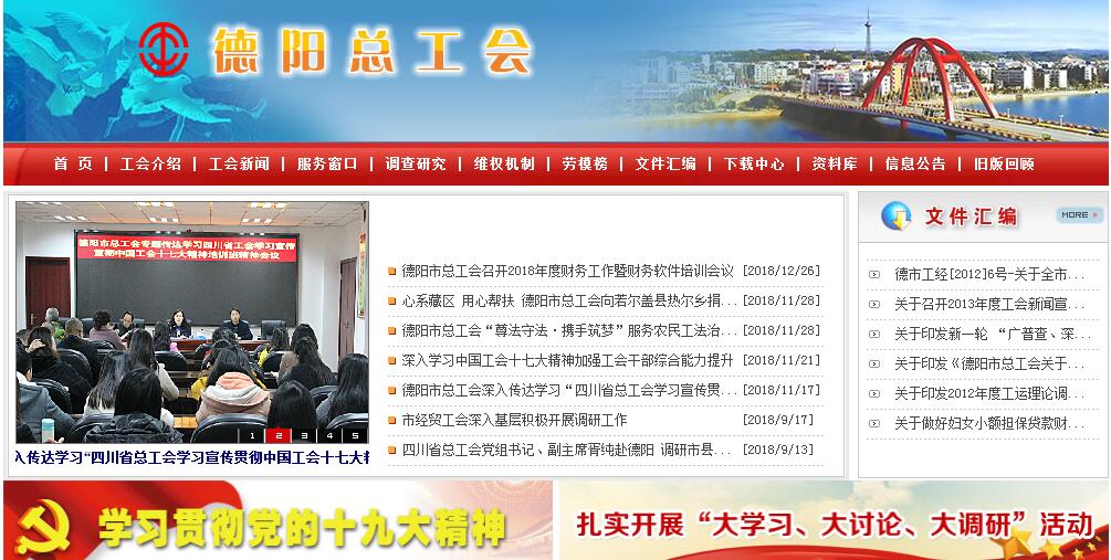 德阳市总工会是德阳市各级工会的领导机关,受中共德阳市委和四川省总工会的领导。目前,德阳市总工会第七届委员会由59名委员组成;七届委员会常务委员会由19人组成,其中主席1人、副主席4人(含兼职副主席1人)、常务委员14人。德阳市总工会现有6个县市(区)总工会、8个直属产业(局)工会、26个直属企业事业工会;机关内设部(室)8个(含产业工会2个),直属事业单位2个。截止2016年12月,全市共有基层工会组织7633个,会员94.1万人,专(兼)职工会工作人员2.8万人。初步形成了与城乡统筹发展相适应的工会组织新体系、社会化维权新格局和工作新机制,全市工会工作迈上了新台阶。1983年10月,德阳市总工会筹建,成为中国共产党领导下的全市性统一的工人革命组织。1984年1月举行了德阳市第一届工会会员代表大会,正式成立了德阳市总工会。德阳市总工会成立以来,在市委和上级工会领导下,全市各级工会认真贯彻党全心全意依靠工人阶级的根本指导方针,充分发挥党联系职工群众的桥梁纽带作用,紧紧围绕党和政府工作的大局,突出工会工作的特点和优势,全面履行“建设、维护、教育、参与”职能,为德阳市的经济建设和社会发展做出了积极的贡献。德阳市总工会的主要职责和工作任务:(一)根据党的各项方针政策,围绕全市工作的大局和工会工作的重点,研究和制定全市工运事业发展和工会工作的指导方针和任务,指导全市各级工会工作。(二)依照有关法律和工会章程,贯彻执行德阳市工会代表大会决议和常委会议定事项,组织和指导各级工会认真履行各项社会职能;参与涉及本市职工切身利益的有关政策、制度的制定,参与相关立法工作。(三)开展与职工利益密切相关的各种政策措施的调查研究,反映职工队伍的动态和职工的愿望要求,并提出建议和意见;根据下级工会的要求,与相关方面协商解决有关问题;研究制定本市工会的各项组织制度和民主制度,监督检查《工会法》、《劳动法》、《中国工会章程》和《四川省〈工会法〉实施办法》的贯彻执行情况。(四)制定并落实全市工会组织建设的各项规划和制度,负责工会会员的会籍管理工作,指导和开展全市工会干部的教育培训工作;负责本市各区(市)县总工会、基层工会领导班子的协管工作;指导和推进全市新建企业工会组建工作。(五)动员、组织职工积极参与经济建设,指导和推动职工技术协会工作;研究本市职工在劳动中的安全健康和劳动保护的状况,监督检查职工劳动保护、安全生产法规的落实情况,参与职工重大伤亡事故和严重职业危害的调查处理;协助政府做好德阳市劳动模范的推荐、评选工作,承担德阳市各级劳动模范的管理工作。(六)负责职工代表大会制度、平等协商集体合同制度、职工董监事制度等各项制度的贯彻落实,大力实施送温暖工程和再就业工程,切实维护广大职工特别是困难职工群体的合法权益;指导基层工会建立和完善调整劳动关系、维护职工劳动权益的深化机制和监督制约机制,参与本市重大劳动争议案件的调查处理;负责指导开展全市工会的信访工作。(七)制定全市工会的宣传教育规划,在职工中开展有关法律和党的各项方针政策的宣传教育活动,指导各级工会开展职工教育、文化、体育活动;指导和开展建设“职工之家”活动;指导工会各级女职工委员会开展工作。(八)负责市总工会经费的收缴、上解和回拨工作,以及工会经费的管理、审查和审计工作;负责市总工会资产的管理工作;研究制定全市工会劳动福利事业的发展规划和规章制度,负责全市工会企事业发展的指导、协调和管理工作。(九)承担本市工会的国际联络工作和与港、台、澳工会的联络,发展与各国城市工会组织的友好关系。(十)承担市委和市政府以及上级工会交办的其它工作任务。