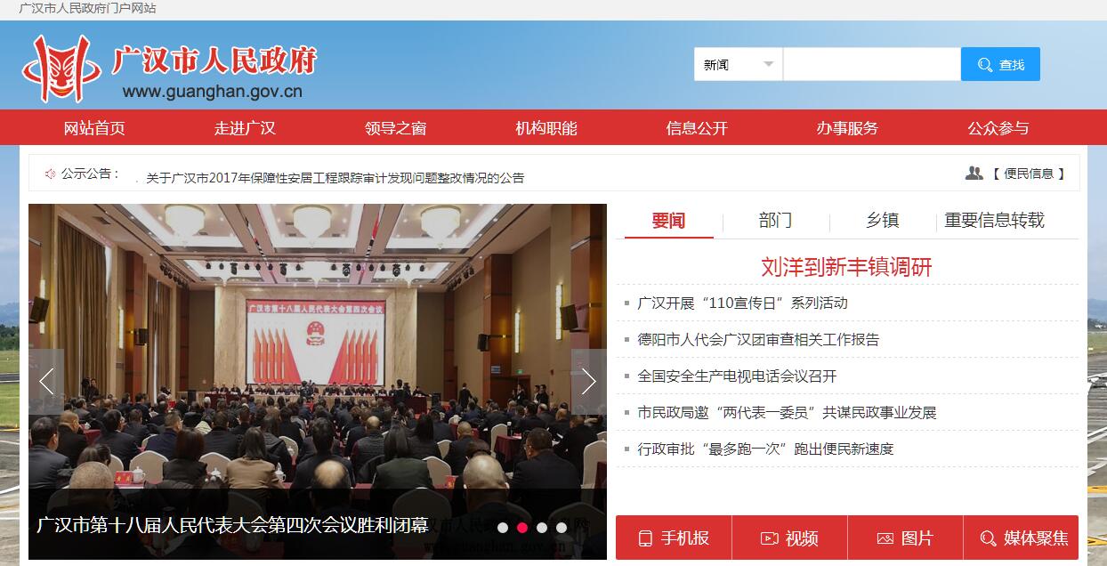 广汉位于“天府之国”腹心地带核心区,自古就有“益州门户、蜀省要衢、通京孔道”之说。秦为雒县,西汉置广汉郡,1950年属绵阳专区,1953年改属温江专区,1983年3月划入成都市,同年8月划入德阳市,1988年撤县建市。全市面积538平方公里,辖18个乡镇,总人口61万。2017年,地区生产总值400.1亿元,三次产业结构为8.5:51.2:40.3,规上工业增加值增速10.6%,一般公共预算收入17亿元,城乡居民人均可支配收入分别为32908元、16915元,综合实力排名全省第13位,被评为全省县域经济平原地区先进县第1名。广汉是文化名城。境内三星堆遗址是距今5000年至3000年左右的古蜀文化遗址,被称为20世纪人类最伟大的考古发现之一,昭示了长江流域与黄河流域一样,同属中华文明的母体,被誉为“长江文明之源”;沿袭300多年的“保保节”列入省级非物质文化遗产保护名录,被誉为川西民俗一绝;境内有国家级重点文物保护单位雒城和明代古寺龙居寺,以及金雁湖、房湖公园、广汉文庙、广汉东禅寺、汉代古墓群等,被评为省级历史文化名城、全国文化先进县。广汉是改革之乡。1978年,在全国率先实行“包产到组”联产承包责任制,1980年,第一个摘掉了人民公社的牌子。广汉大力弘扬敢为人先的改革精神,在农业农村、基层治理、创新创业等方面大胆突破、先行先试,农田水利改革的做法在全省推广,农村集体资产股份合作制改革被誉为“友谊经验”,被确定为全国农村集体产权制度改革试点县、全省农村改革综合试验区。广汉是产业新城。境内有德阳高新区、三星堆文化产业园和广汉工业集中发展区三大园区,是中国产业集群经济示范市,工商注册企业7835户,其中工业企业3068户。农业形成了以农旅融合示范带、休闲渔业文化示范带、循环生态农业示范带和粮食、蔬菜、水果、油菜为核心的“三带四基地”,被评为全国粮食生产先进县、全省现代农业示范县;工业形成了油气装备制造、医药、食品和通用航空、新材料、新能源“3+3”产业体系,规模工业企业312户,是四川首批工业强县示范市;服务业形成了以三星堆为核心,商贸、会展、旅游、餐饮等为支撑的“一核多点”产业布局,是德阳现代服务业发展新的增长极。广汉是宜居典范。南距成都市区20公里,北距德阳市区19公里,成都二绕、宝成铁路、成绵乐城际铁路、成兰铁路、成绵高速、成德大件路、天星干线、旌江大道等“一横七纵”交通干线穿境而过。地表水资源较为丰富,湔江、绵远河、石亭江、青白江等10条河流贯穿全境;鸭子河穿城而过,亲水栈道、连续水面和生态湿地绵延10公里,形成了城市生态廊道;城市建成区面积38平方公里,绿地公园、城市绿道、慢行步道、运动广场、生态景观星罗棋布,绿化覆盖率达44.1%,是全国森林城市、全省环境优美示范县城。