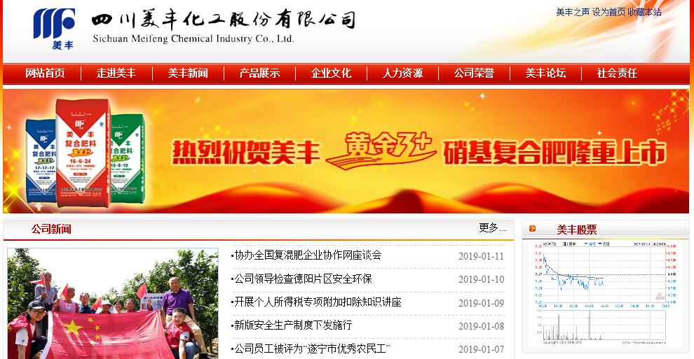 四川美丰化工股份有限公司于1997年在深交所挂牌上市,2002年7月,中国石油化工集团公司全资子公司——成都华川石油天然气勘探开发总公司重组四川美丰,成为公司第一大股东,四川美丰由此成为中石化集团旗下八家上市公司之一。公司目前总股本591,484,352股,其中第一大股东——成都华川石油天然气勘探开发总公司持股占比12.18%,第二大股东——射洪国资下属的四川美丰(集团)有限责任公司持股占比4.45%,其余均为社会公众股东。四川美丰已有四十多年发展历史,公司拥有多项行业领先的技术研发成果,现累计拥有省级以上鉴定成果13项、国家有效授权专利47项,荣获省部级科学技术进步奖8项;拥有国家级博士后工作站、土肥研发中心、农化服务中心等创新平台。公司各项经济技术指标和综合实力保持国内同行业先进水平,成为“中国上市公司竞争力百强”、“中国化肥效益十强企业”“中国化工500强企业”“四川100强企业”。作为中国百万吨级大型化工生产企业之一,四川美丰现拥有尿素、复合肥、三聚氰胺、柴油车尾气处理液、硝酸、硝铵、塑编制品、重载膜包装袋等化工产品200余万吨/年的生产规模,产品涉及化肥、民爆、环保、能源、包装五大板块,拥有总资产47亿元,净资产25亿元。公司下辖分公司2家,全资子公司10家,控股企业1家,参股经营企业3家。公司先后荣获“全国五一劳动奖状”“中国十大诚信企业”“全国质量管理先进企业”“中国企业文化建设先进单位”“中国最佳董事会50强”“上市公司信息披露优秀企业”“银行AAA级信誉企业”“农资经销商最佳合作厂家”等荣誉称号。“十三五”期间,四川美丰将以“立足主业、探索转型发展、依法合规经营”为原则,按照“两降、两保、两提升”的工作目标,坚持“夯基础、严管理、谋发展”的工作理念,把四川美丰建设成为一个在中国化肥行业综合实力名列前茅、有重大影响的大型企业集团。