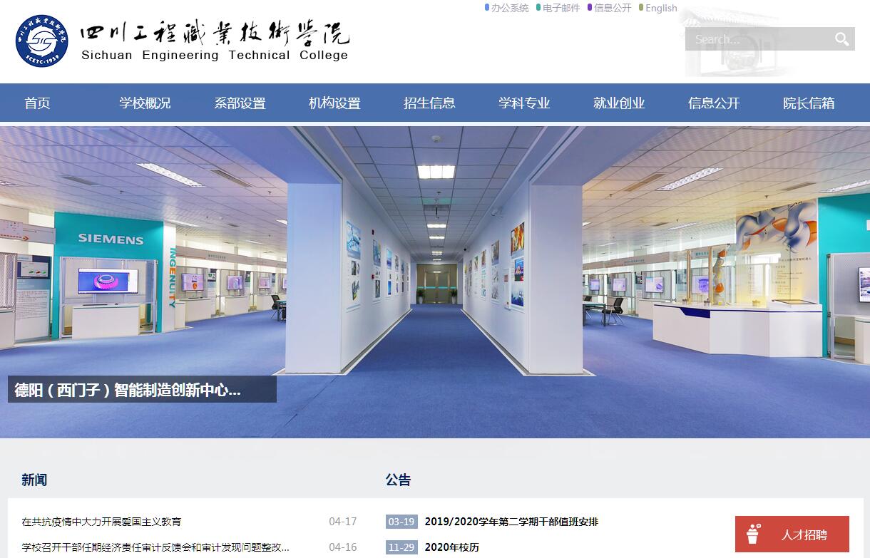 四川工程职业技术学院是一所公办全日制普通高等学校,隶属于四川省经济和信息化委员会。学校位于成都平原东北部的“国家重大技术装备制造业基地”——四川省德阳市,建于“中国人居环境范例”的旌湖之畔。千亩校园枕水而建,因势造园,既有芳草萋萋、枝疏叶浓的园林之妙,又有小桥流水、曲径通幽处传来的琅琅书声……处处透出和谐的人文氛围和清新的现代气息。目前,学校占地1166余亩,在校学生12000余人,教职员工922人,其中正高54名、副高240名,拥有“国家万人计划”“国家级教学名师”“四川省教学名师”等6名、“省级教学团队”4个、“四川工匠”2名。聘有数十名国内外著名教授、专家为客座教授,建立有600余人的“企业兼职教师人才库”。仪器设备总值1.48亿元,固定资产达5.58亿元,馆藏图书99余万册。开设有34个专业,是全国机械行业“数控”“焊接”专业的牵头院校,拥有数控、焊接、电气等一批国家、省级精品专业,形成了突出应用与创新的办学特色。在近60年的办学历程中,学校一路应运肇启、应时而变、披荆斩棘,研发、引领推动德阳国家高端装备智能制造示范基地建设,走出了一条具有中国特色的高职教育发展之路,成为全国综合实力最强、发展前景最好的高职学院之一。学校紧紧抓住国家大力发展职业技术教育和四川装备制造业蓬勃发展的战略机遇,坚持体制机制模式创新,确立了“体制创新,开放办学”的先进办学理念,开创了“省市共建,社会共享”的全新办学局面,形成了“校企合作,工学结合”的人才培养模式,取得了“职教惠民,服务社会”的辉煌办学成就,构建起了“省市共建、资源整合、多方投入、社会共享”的办学格局。近年来,学校紧紧围绕中国制造2025、四川全面创新改革和德阳高端装备创新发展示范基地等重大战略,与北京航材院、中国二重万航模锻、中科院成都分院、德国库卡、西门子合作,共建了德阳中科先进制造创新育成中心、德阳高端装备智能制造创新中心、航空材料检测中心、工业机器人应用创新中心,以及高温合金切削、工业机器人应用、航空模锻3个“四川省工程实验室”,搭建“高端装备制造产教融合创新平台”,协同实施人才培养、技术研究和社会服务。近三年,学校为中航工业、中国兵器工业、东方电气等高端装备制造企业输送毕业生7000余名,培训企业员工2.3万人次,完成科技服务近1000项。学校“创新装备制造业高端技术技能人才培养模式”已成为我省首批全创经验成果之一。2017年9月,学校的办学和人才培养成就,入选了中共中央宣传部、国家发展和改革委员会等举办的“砥砺奋进的五年”大型成就展,作为全国职业教育的典型,反映了职业教育服务国家战略和社会主义现代化建设的重要作用。学校秉承“科学、民主、求实、创新”的优良校风,坚持“以人为本、依法办学,从严治校,精心育人”的办学方针,以创新的育人精神为每一位学生求知治学、强化技能、全面发展铺设成长成才之路。近年来,我校学生在国家和省市各类大赛中屡获大奖,毕业生深受社会和用人单位欢迎,学校就业率连年保持在98%以上。半个多世纪以来,学校共为国家培养了10万余名各类人才,涌现出了原全国政协常委、新希望集团董事长刘永好等一大批优秀毕业生,为社会主义经济建设特别是装备制造业的建设和发展做出了积极贡献。学校坚持开放办学,主动对接“一带一路”国家战略,连续接待美国密苏里大学交流生10余批;与泰国南邦职业学院、清莱职业学院等五所职业院校签署合作备忘录和酒店管理专业泰国留学生联合培养协议;推出中泰文化交流项目,促进中国与泰国大学生的交流;达成与老挝合作培养质量管理与检测人才等一系列共识;进一步深化全面创新改革和教育现代化、国际化,大幅提升了科技创新和社会服务能力。四川工程职业技术学院始终肩负着“孕育国家建设之人才,开创高职改革之先河,发扬敢为人先之精神,促进社会经济之发展”的历史使命。站在新的起点,学校将继续发扬“开放创新、艰苦奋斗”的优良传统,围绕“育人为本,提高质量”的根本目标,坚定不移服务国家战略和经济社会发展,坚定不移走政产学研用一体化道路,争做“发展的示范、管理的示范、改革的示范”,努力培养更多更好的适应经济社会发展的高素质高技能专门人才,努力建成优质高等职业院校和中国特色高水平专业,绘就中国现代高职传承与创新并进、光荣与梦想交织的恢宏蓝图!