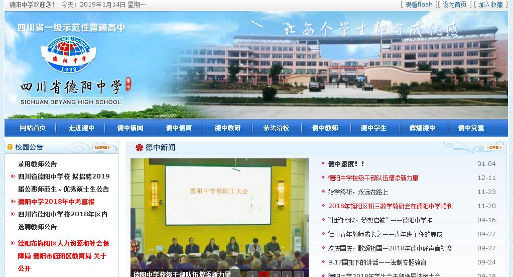 四川省德阳中学,始创于1939年抗战内迁的“国立六中二分校”,校址在德阳县城关外北文昌宫,即今德阳中学初中部所在地,首任校长苏郁文。1950年3月,由四所中等学校合并为德阳县初级中学。1952年经四川省教育厅正式命名为“四川省德阳中学校”,政府拨款在城北文昌宫原址修建新校舍。1960年获绵阳专区高考第一名。1966年以后,受到文革冲击,高中停止招生。1972年,高中恢复招生,学制两年。1982年被省教厅列为首批“四川省重点中学”,高中学制改为三年,建立学校教育教学系列规章制度。1984年,先后设立办公室、政教处等机构,并成立读书指导小组。1986年,建立教职工代表大会制度。1987年,筹建通达电缆厂,开始职称评定工作。同年12月,举行首届艺术周书法美术作品展览。1989年,首次开展德育系列化教育。1994年,提出“强健、正直、博学、创造”的校训,在省内引起强烈反响。1996年通过省级文明单位验收。1997年成为首批四川省校风示范学校。1998年提出“不放弃每一个学生”的教育观念。2001年9月,玉泉路新校区正式投入使用。2002年6月跨入“国家级示范性普通高中”行列。2013年被省教育厅评定为“四川省一级示范性普通高中”。赞曰:昔有文昌故宫,今为德阳中学。始于抗战三九,名于建国之初。传七十载薪火,历曲折之变迁,乃于2001拓玉泉校区,2008逢灾后重建。创国重,立品牌,发展至今,双校齐盛,享誉四方。闻德中当年,高人韵士,卧虎藏龙。崇文重道,立德树人。在陋巷而乐诗书,居斗室而忧天下,风雨飘摇而志节不移,世风不古而情怀弥坚。今我德中师生,当继先贤之学魂,明道正德,发扬蹈厉,兴民族之科教,创巴蜀之名校,诸君勉乎哉!学校教育教学设施齐备,配置精良,初中部享用着一所老牌重点中学全部的教育资源,理化生实验室达到国家Ⅰ类标准,有专用音乐室、美术室、练功房、两个学生机房、两套多媒体教学系统、两个阶梯教室,全部开通了校园网,有设施完备的食堂和学生公寓,400m标准田径运动场,配套设施完全满足了教师教学手段现代化的需要。在“教学生成人、促学生成才、助学生成功”的办学理念的指导下,我校德育工作始终坚持“立德树人”“环境育人”的工作思路。结合贯彻落实中共中央、国务院下发的《关于进一步加强和改进未成年人思想道德建设的若干意见》以及《中学德育大纲》,本着与时俱进的精神,提出德育内容要紧贴时代,形式要丰富多彩、方法要与时俱进、载体要力求创新。建立起党委领导、主管校长负责,政教处、年级组实施、班主任为核心的纵向管理和校工会、教研组、团、队、会、校、家、社横向协调的德育管理机制,逐渐形成了以常规过程管理为中心,以主题活动为载体,以特色文化引领,以社会主义核心价值体系和科学人生观教育为主线,建立以培养合格公民、健康人格品质志存高远的社会主义事业建设者和接班人为目标的渗透型德育教育模式。1、高处着眼,构建科学的德育管理运行机制。2、低处着手,强化养成教育,抓好校风建设。3、创新德育模式,彰显德育特色。我校德育在长期的摸索中,走出了一条“常规教育活动坚持不懈、传统教育活动富有特色、大型主题活动搞出实效”的德育工作新路子,也推动我校德阳工作迈上了更高的台阶。由于德育工作求真务实,我校“严谨、平等、和谐、奋进”的校风得到发扬光大,校园呈现出一派生机勃勃的大好局面,我校全体师生还将以与时俱进、开拓进取的精神,为追求至善人格、至善人生做出不懈努力。德阳中学面向全国广纳贤才,推行“能者上,平者让,庸者下”的激励机制。拥有一支结构合理、学科配套、业务精良、师德高尚的教师队伍。学校现有教职工419人,专任教师377人,其中全国优秀教师6人,享有国务院特殊津贴专家1人,教育部曾宪梓教育基金会优秀教育工作者1人,特级教师6人,省学术技术带头人1人,国家级骨干教师3人,省市劳模、优秀教师137人,68位教师研究生毕业或研修生结业,中级以上职称教师已成为学校教育教学主力军。教师队伍年龄结构合理,百分之八十以上教师都参加了课题研究。近年有20多位教师在全国省市优质课竞赛中获得一等奖。治学严谨,敬业爱生,锐意改革,是德中教师的突出特点。正是由于教师队伍整体素质高,德阳中学在激烈的教育竞争中,勇往直前,挺立潮头,不断地叙写着德阳基础教育的辉煌篇章。在这里,教育者就像辛苦耕耘的农夫,怀揣着一份对生命成长的守望,平等地善待每一位前来接受教育的学生,为他们提供合适的土壤和需要的养分,静待他们扎根出苗、拔节开花。在这里,没有心灵的沟通、没有爱的投入,就没有真正的教育。教育是一种文化浸润心灵、促进人全面生长的活动。学校应当高度关注文化氛围的营造,理解学生成长中的需求与烦恼,尊重学生在课堂教学中的主体地位,唤醒学生的生命活力和学习兴趣,让学生真正成为学习的主人,愿每一位学生在这里都获得成就感!在这里,教师的“自我实现”体现着教师的人生价值,也体现着学校的内在活力。学校应当高度关注作为“人”的教师的幸福指数,为教师创造适合他们生存发展的公平、公正的软环境,点燃他们的奋斗热情,提升他们的生命质量,努力让每一位教师过上有尊严的专业生活!倘若把学校视为一棵不断成长繁荣的大树,所有在这里相遇的教师和学生都是血