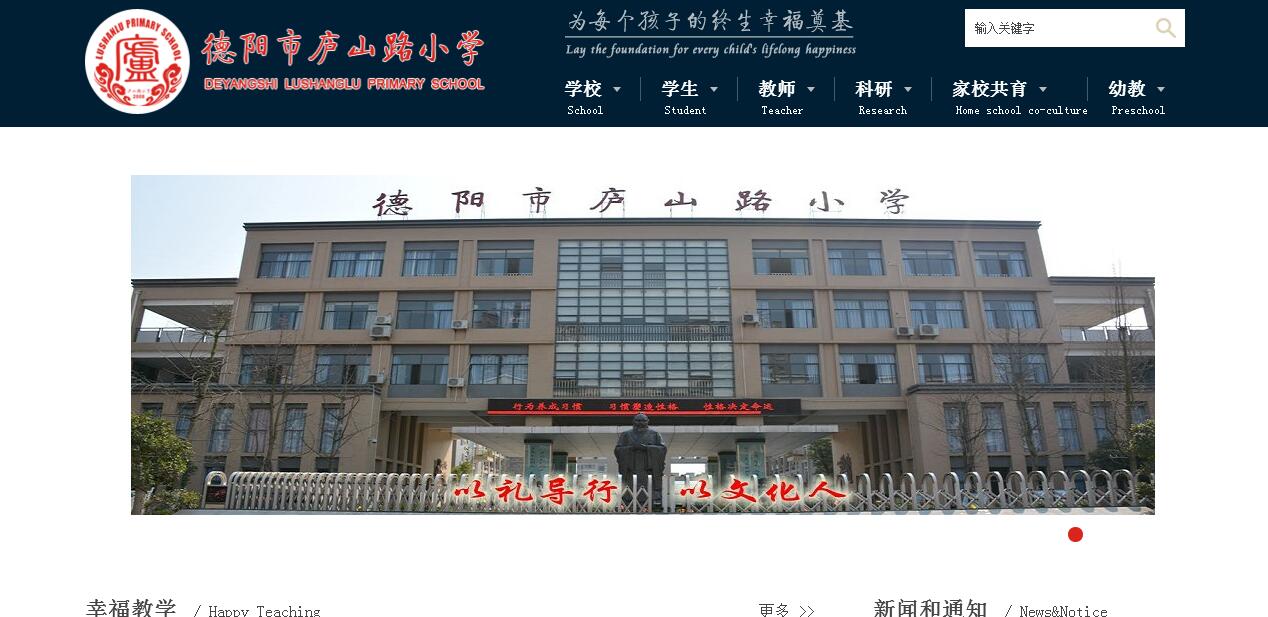 德阳市庐山路小学位于德阳市黄河片区,地理条件优越,交通便利,是德阳市政府创建、市教育局直属的公办学校。学校占地60亩,总投资5830万元,于2010年8月全面投入使用。学校共设48个小学教学班和8个幼儿教学班,共有教职工161人,在校学生2642人(小学部2235人,幼儿园407人)。学校师资力量雄厚,拥有中学高级教师2人,四川省骨干教师2人,德阳市骨干教师11人、市级学科带头人2人。学校秉持“以礼导行,以文化人”的办学理念,以“为每一个孩子的终生幸福奠基”为根本追求,以“品质、质量、特色”为目标,重视培养学生的行为习惯和学习参与的主动性、创造性,形成以“常规课堂高效率、艺体活动高质量、校本研究高水准”的校园氛围。推行“学会一门乐器,情趣一生;爱好一门运动,健康一生;养成阅读习惯,儒雅一生”的学生综合素质教育培养方案,促进学生全面发展,推进教师专业发展,实现学校科学发展。建校5年来,学校先后被评为:四川省教育工作先进集体、四川省现代教育技术示范学校、全国优秀家长学校、全国阅读教学先进学校、四川省消防安全教育示范学校、防震减灾科普示范学校、阳光体育示范学校、2011-2014连续三学年荣获办学水平督导评估优秀级学校等,高效的发展趋势,优秀的教学质量在社会中形成了良好的口碑。