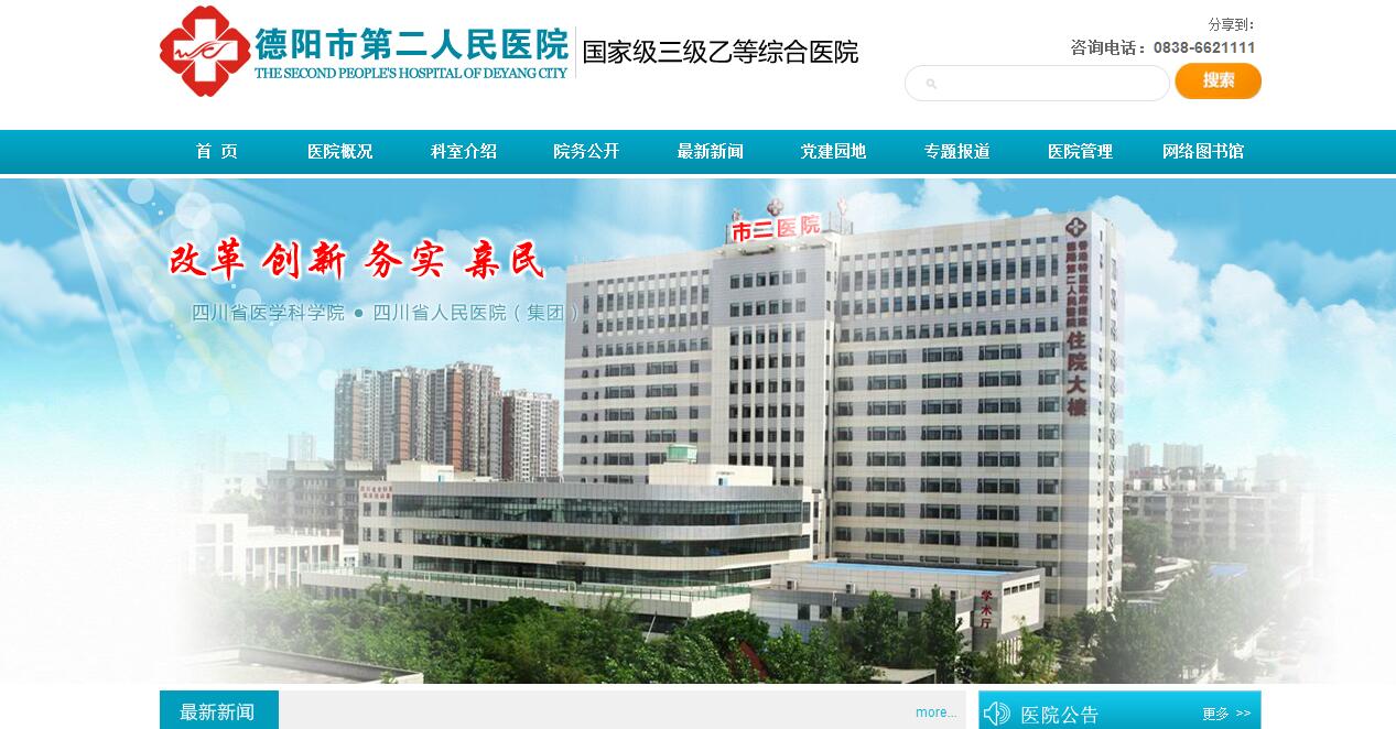 德阳市第二人民医院始建于1958年,前身为“中国二重”职工医院,2003年移交德阳市人民政府。医院是集医、教、研为一体的国家三级乙等综合医院,国家爱婴医院,四川省首批全科医学临床培训基地,全省首批“数字化医院”,西南医科大学等多家医学院校教学医院,是四川省卫生先进单位,德阳市首家园林式医院,全市首批“健康医院”示范点和践行社会主义核心价值观示范单位。医院下辖城南社区卫生服务中心和四川建院校园社区卫生服务站,托管旌阳颐年康复医院。医院占地面积64亩,建筑面积6万平方米。编制床位520张,开放床位700张。年门急诊量35万人次,住院病人2万余人。在职员工800余人,其中高级职称100余人,硕士博士研究生30余人。现有20余名学术带头人在国内、省内学术委员会任职。医院科室设置齐全,有职能科室19个,临床科室20个,医技科室8个,诊疗科目75个。配置有1.5T超导磁共振(MRI)、多层螺旋 CT、C型臂X光机、多功能数字X光机(DSA)、数字化X光机(DR)、大型彩超、全自动生化分析仪、γ适形放疗系统、电视腹腔镜、电视宫腔镜、利普刀(LEEP)、电视胸腔镜、电子支气管镜、可染色电子胃镜、电子肠镜、十二指肠镜、输尿管软镜、钬激光、关节镜、神经内镜、椎间孔镜、高压氧舱等一大批高、精、尖诊疗设备。近年来,医院以学习型组织建设为抓手,大力培育和践行“改革、创新、务实、亲民”的办院理念,推行“数据重塑医院管理”和“现代医院6S管理”等创新举措,使医院精细化管理迈上新台阶。 强化重点专科和特色专科打造,神经外科获批立项建设省级重点专科;建成吴阶平泌尿外科德阳中心和德阳市内镜治疗中心;建成市级重点专科8个(神经外科、骨科、内分泌科、中医科、康复科、妇科、心血管内科、泌尿外科);开设全市首个戒烟门诊、全市首个儿童身高促进门诊。打造了全市卫生系统首个院内健康教育广场。“十三五”期间,医院将大力实施人力资源开发、特色专科打造、基础管理提升、亲民文化建设四大战略,再建3-5个市级重点专科,创建3-5个省级重点专科,以差异化的竞争策略打造德阳人民信赖的“亲民医院”,创建国家三级甲等综合医院,力争建设成为名副其实的德阳地区医疗次中心。