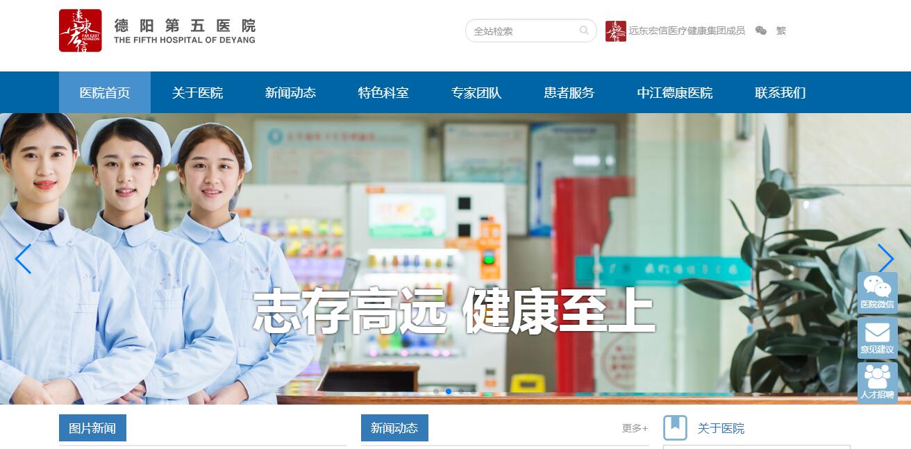 德阳第五医院(原东电医院)位于泰山北路五叉路口立交桥南侧,毗邻东电和德阳石刻公园,是一所具有50多年办院历史的国家二级甲等综合医院、爱婴医院、德阳市120急救网络医院。职工医保、工伤、城乡居民医保、商业保险定点单位。2016年医院加入远东宏信医疗健康集团。医院开放床位500余张,现有职工近600人,中高级技术职称人员200余人,设临床、医技科室30余个。配置有高频电刀、四维彩超、超声刀、C臂、核磁共振、西门子16排螺旋CT、大型DRX光机 、C型臂X光机、大型彩超诊断系统、全自动血液分析仪,、全自动生化免疫分析仪、血气分析仪、海扶刀等。现代化的洁净手术室和设施一流的ICU病房,完全能满足重大手术和抢救危急重症患者的需要。医院分科齐全,专业技术水平上乘,具有较强的专科诊治和综合救治能力。其中,内分泌科、骨科、普外科是德阳市重点专科。外科形成了以腔镜技术、无痛技术为特色的微创外科手术系列,先后利用腹腔镜、胆道镜、宫腔镜、输尿管镜、关节镜等开展了一系列微创专科技术,得到了广大患者的一致好评。内科具有较强的专科诊治水平及危险重症的综合抢救能力。心血管、呼吸、消化、内分泌、神经内科、儿科等内儿科疾病的诊治有着丰富的诊疗经验和较高的技术水平。全套胰岛素检查、动态血糖监测、糖尿病足筛查箱和胰岛素泵的广泛应用,使糖尿病的诊治处于德阳地区的领先水平。医院健康体检与管理部独具特色,体检场所完全体检者与就诊者完全分离、检前个性化方案的定制、检中的人性化流程、检后的一对一沟通。医院重视继续教育、员工培训和学术交流,与华西医院、省医、成都中医药大学等高校、医院保持良好关系,常年邀请台湾及国内知名专家来院开展诊疗和学术指导。