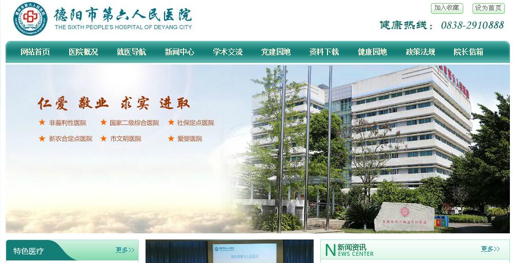 德阳市第六人民医院(东汽医院)是国家二级甲等综合医院,国家级爱婴医院,四川省数字化医院,德阳市、区两级医保、新农合定点医院,“120”网络医院;四川大学华西医院网络医院,成都军区医院协作医院,四川大学华西医院康复医院教学医院、假肢矫形装配医院,辽宁中医药大学教学医院,中国医学科学院北京阜外心血管病医院心血管疾病诊疗质量监测基地。医院位于德阳市区庐山南路三段三十五号,由香港特区政 府独资整体援建,建筑面积3.2万㎡。医院规划床位300张,10万元以上大中型设备60余台套。医院现有心血管和普外两个市级重点专科。全院有高级职称专业技术人员近40人,医院还聘请华西医院和省人民医院8名知名教授为各个专业首席专家,不定期来院查房、会诊、手术以及技术指导,近年还不定期邀请台湾、香港专家教授来院技术指导。医院始建于1965年,由党中央、国务院批准成立,专门服务于三线企业东方汽轮机厂(东方电气集团东方汽轮机有限公司前身),由来至于上海、北京、哈尔滨、成都等各大医院专业技术拔尖、政治素养过硬的医务人员组建而成。五十年来一直伴随东汽成长。2008年汶川大地震时,全院职工在汉旺本部被完全摧毁情况下,发扬“不怕牺牲,敢于胜利,坚韧不拔,艰苦创业,自主创新,勇攀高峰”的“东汽精神”,第一时间整体投入伤员救治,当天就转运伤员1500余人!此后,全院职工坚守在极重灾区抗震救灾和卫生防疫,医院的表现被媒体广为宣传并受到国家卫生部、国资委、四川省委、四川省政府的表彰。医院在“汶川”大地震后于2009年9月26日在德阳经济技术开发区异地重建,2014年1月1日整体移交德阳市人民政府。医院目前拥有临床医学、口腔医学、中医学、公共卫生与预防医学、药学和中药学六个一级学科,外科、内科、急诊科、妇产科、儿科、康复科、皮肤科、眼耳鼻科、全科医学、医学影像、医学检验十一个二级学科以及近30个亚专业,医院是全市唯一拥有职业卫生服务资质的医院,是全市唯一实验室通过计量认证的医院,设有监测检验中心,开展职业危害因素监测、职业健康体检;设有健康体检中心,开展各类健康体检。作为政府举办的非盈利性公立医院,我院时刻牢记自己的社会责任。近年多次在社区举办健康讲座和义诊,数万人受益;和德阳市残联合作开展“脑瘫儿童康复项目”和“白内障复明工程”获得社会好评;积极参加社会公益活动和“彝良、庐山地震”等大型灾害救援行动。作为德阳经开区医疗卫生中心,我院将立足开发区、面向德阳,以一批优势特色专科为核心,打造具有香港特色的新医院,以更优质、更温馨的服务回馈社会,服务德阳市民。