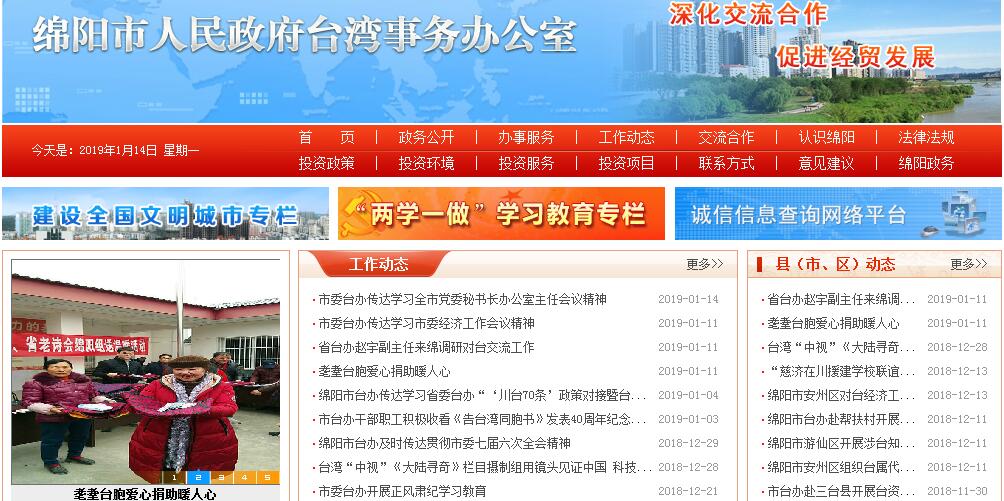 中共绵阳市委台湾工作领导小组办公室、绵阳市人民政府台湾事务办公室,实行两块牌子、一个机构、一套班子,简称“绵阳市台办”。是市委指导全市对台工作和市政府主管台湾事务的办事机构。其主要职责:1、抓好党中央、国务院制定的对台针政策的贯彻执行;落实市委、市政府及省台办对台工作的安排部署和工作任务;研究拟定全市对台工作计划并组织实施。2、组织、指导、管理、协调各县(市、区)、园区和市级部门的对台工作;检查了解各地、各部门贯彻落实党中央、国务院及市委、市政府对台方针政策的执行情况。3、统筹协调和指导全市对台经贸交流与合作;会同有关部门妥善处理台商投诉工作。4、管理全市对台宣传工作。指导各县(市、区)、园区和市级部门制定对台宣传工作计划、开展对台宣传工作;负责对台宣传组稿和稿件的审核把关;协助市委宣传部管理指导台湾记者来绵采访,管理全市与台湾的新闻交流工作;负责全市台事干部教育培训工作。5、负责对台交流交往管理工作。统筹协调和指导绵台两地在教育体育、科技、卫生、文化、宗教等领域的交流与合作。6、管理全市台胞、台属工作。抓好台胞往来管理工作;做好涉台教育引导工作;协助落实台胞台属政策;做好台胞来绵接待、服务工作;会同有关部门协调组织开展涉台方面的重大活动,妥善处置涉台重大事件、突发事件、民事纠纷及来信来访工作;做好台胞捐赠管理工作。7、负责对台湾各界人士的联络工作。指导、协调各县(市、区)、园区和市级有关部门开展对台联络和交流工作。8、完成市委、市政府及省台办交办的其他工作任务。