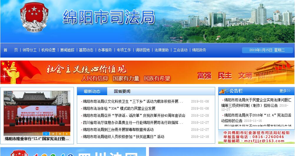 绵阳市司法局主要职责:1、组织、指导和管理全市人民调解和司法助理员工作,协调处理重大、疑难矛盾纠纷;参与社会治安综合治理和平安创建工作;2、制定全市法制宣传教育和普及法律常识规划,并组织实施,指导和检查全市各地区和各行业依法治理和“法治城市”、“法治县区”创建工作;3、组织、指导和管理全市法律援助机构和法律援助业务活动,负责全市 “12348”法律服务热线工作;4、监督、指导全市律师工作和法律顾问工作,管理律师协会;5、监督、指导和管理全市公证机构和公证业务活动;6、监督、指导和管理全市司法鉴定机构和司法鉴定业务活动;7、监督、指导和管理全市基层法律服务机构和法律服务业务活动;8、组织实施全市国家司法考试工作,管理取得法律职业资格的法律人才。9、监督、指导和管理全市非监禁刑罚执行和社区矫正工作;10、监督、指导和管理全市解除劳教、刑满释放人员的帮教安置工作;11、指导乡镇(街道)司法所为党委政府和基层经济和社会组织提供法律咨询和法律建议;12、组织、指导全市法学教育,组织开展法学理论研究和法学工作;13、负责全市司法行政系统的监察、审计和法制工作;14、指导和管理司法行政系统队伍建设和思想政治工作,协管县(市、区)司法局领导干部;15、负责全市司法行政审批工作和业务活动;16、负责全市监狱、劳教单位的党建和纪检监察工作; 17、完成市委、政府交办的其它工作。
