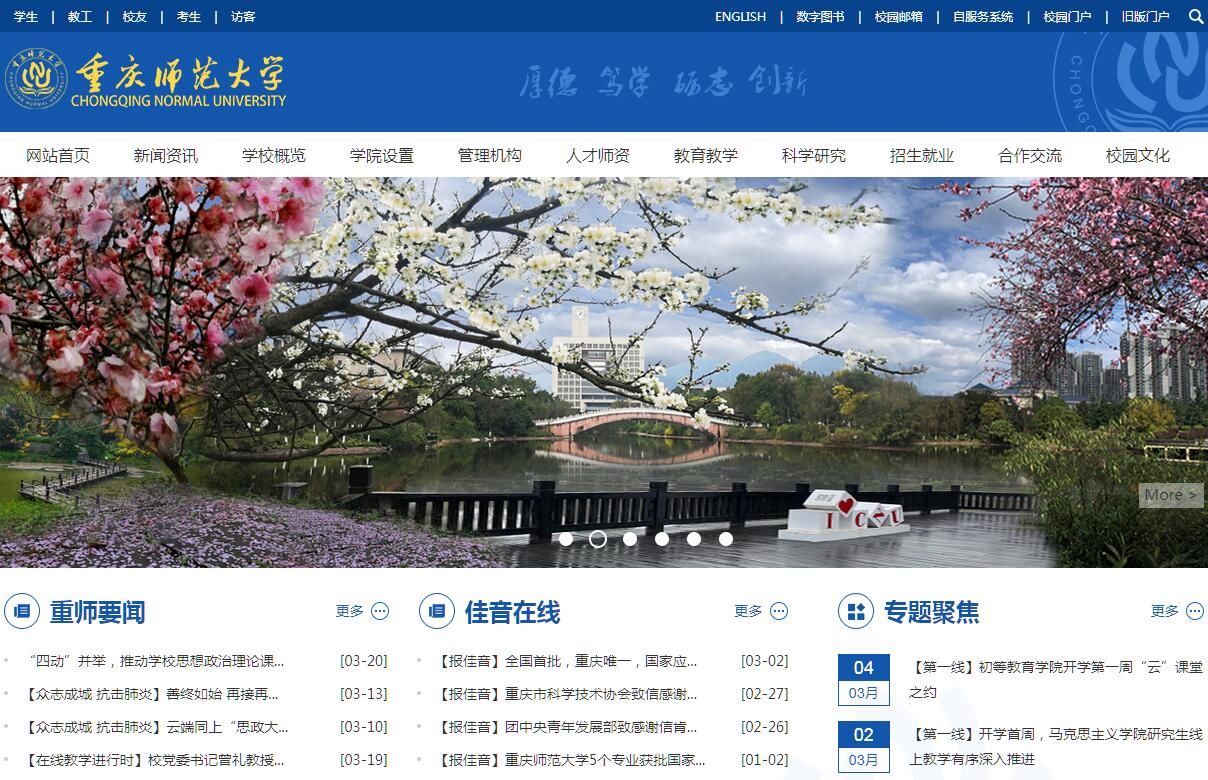 重庆师范大学创办于1954年,办学历史可追溯到1906年创立的官立川东师范学堂。学校是一所多学科协调发展的综合性高等学府,坐落在历史文化名城重庆市。校园面积2688亩,包括大学城校区、沙坪坝校区和北碚校区。学校是全国绿化模范单位、全国学校艺术教育先进单位,重庆市依法治校示范校、重庆市文明单位、重庆市德育工作先进集体、重庆市园林式单位、重庆市十佳市容整洁单位、重庆市森林校园、重庆市美丽校园。学校拥有“国务院侨务办公室华文教育基地”“教育部全国职教师资培训重点建设基地”“国家汉语国际推广师资培训基地(重庆)”等三个国家级基地,是全国先期两个“中德(重庆)职教合作示范基地”之一,是教育部和国家发改委“特教基地学校”。拥有重庆市职业教育测评与师资培养协同创新中心和重庆市普通中小学教师、幼儿教育教师、特殊教育教师、职教师资、管乐师资等多个市级培训示范基地。全国首批部校共建“重庆新闻学院”,以及重庆旅游学院、重庆音乐学院、重庆幼儿师范学院、重庆特殊教育学院也依托我校设立。60余年来,学校坚持教育为人民服务、为中国共产党治国理政服务、为巩固和发展中国特色社会主义制度服务、为改革开放和社会主义现代化建设服务,全面贯彻党的教育方针,坚持“立教无类,以文化人”的办学理念,秉承“自强不息,躬行师道”的重师精神,践行“厚德、笃学、砺志、创新”的校训,立足重庆、面向西部、服务全国,突出教师教育特色,构建形成了师范教育和非师范教育“两轮驱动”,基础教育、职业教育和汉语国际教育“三驾马车”,文化传承与创新、决策咨询与公共服务、科技攻关与应用转化“三大板块”协同发展的特色办学格局。学校现有全日制本科生25500余人,研究生3600余人。专任教师1600余人,正高职称教师280余人,具有硕士、博士学位教师占专任教师近80%。博士生导师36人,与四川大学、重庆大学、西南大学、陕西师范大学、上海大学、内蒙古大学、澳大利亚联邦大学、澳门大学等海内外高校联合开展博士培养。学校拥有国际系统与控制科学院院士1人,有双聘中国科学院院士6人、中国工程院院士4人、中国社会科学院学部委员1人,有“新世纪百千万人才工程”国家级人选3人,有国家级有突出贡献的中青年专家1人,有全国杰出专业技术人才1人,有“中国青年科技奖”获得者1人,有享受国务院政府特殊津贴专家13人,有中国科学院“百人计划”人选1人,有“海外杰青”获得者1人;有教育部“新世纪优秀人才支持计划”入选者、教育部“优秀青年教师资助计划”入选者、教育部“高校青年教师奖”获得者,重庆市“两江学者”特聘教授、重庆市有突出贡献的中青年专家、重庆市杰出专业技术人才、重庆市杰出青年基金获得者、重庆市“百人计划”人选、重庆市高层次人才特殊支持计划人选、重庆市教学名师、重庆市“巴渝学者”特聘教授、重庆市专家工作室首席专家等省部级人才250余人次。兼职教师中还聘有国家“千人计划”“杰青”“长江学者”等国家级人才。学校现有17个二级学院,1个独立二级学院,17个硕士学位授权一级学科、106个二级学科,10个硕士专业学位授权,14个市级重点一级学科,涵盖哲学、法学、经济学、教育学、文学、理学等11个学科门类。70个全日制本科专业(含方向)。有国家级特色专业建设点、国家级专业综合改革试点、国家级卓越教师培养改革项目、国家级卓越农林人才教育培养计划改革试点项目、国家级精品视频公开课、国家级教师教育精品资源共享课、国家级教学科研团队、国家级教师队伍建设示范项目等15个,重庆市特色专业建设点、三特专业、三特学科专业群、精品课程和双语课程、教学团队、实验教学示范中心、人才培养模式创新试验区等80个。学校主动适应经济社会发展需要,不断创新人才培养模式,深化教学内容和课程体系、教学方法与手段改革,形成了“通识综合素养+专业理论素养+实践动手能力+创新创业能力”的人才培养模式。建立了以“三主线”和“六环节”为基础的教学质量监控体系。开展了“卓越教师”培养,在金融工程、计算机科学、统计学、酒店管理等本科专业开设中美121人才培养项目实验班。学校获得国家级教学成果二等奖等7项、国家级教学工程项目14项、国家级规划教材5项,省部级教学成果奖57项。我校教师获全国高校青年教师教学竞赛一等奖,学生在全国大学生数学建模竞赛中获全国一、二等奖40项,重庆市一、二等奖135项;在全国电子设计竞赛中获得全国一、二等奖8项,重庆市一、二等奖33项;在全国师范院校师范生教学技能竞赛中获得全国一、二等奖10项。 学校科研事业围绕两个重点展开。一是围绕“双一流”建设和学校内涵发展,着力提升科研核心竞争力。近五年主持国家社科基金重大招标、国家自然科学基金等国家级项目186项,科研经费4亿余元;发表ESI热点、高被引论文、三大检索论文2521篇,出版高水平专著165部;获教育部自然科学一等奖、教育部人文社科奖、全国教育科学研究优秀成果奖、国家哲社文库等标志性成果79项。学校构建了校级、市级、部级科研平台三级培育体系,平台数量大幅提高,类型逐步扩展,拥有包括教育部重点实验室、省部共建教育部工程中心和重庆市人文社科重