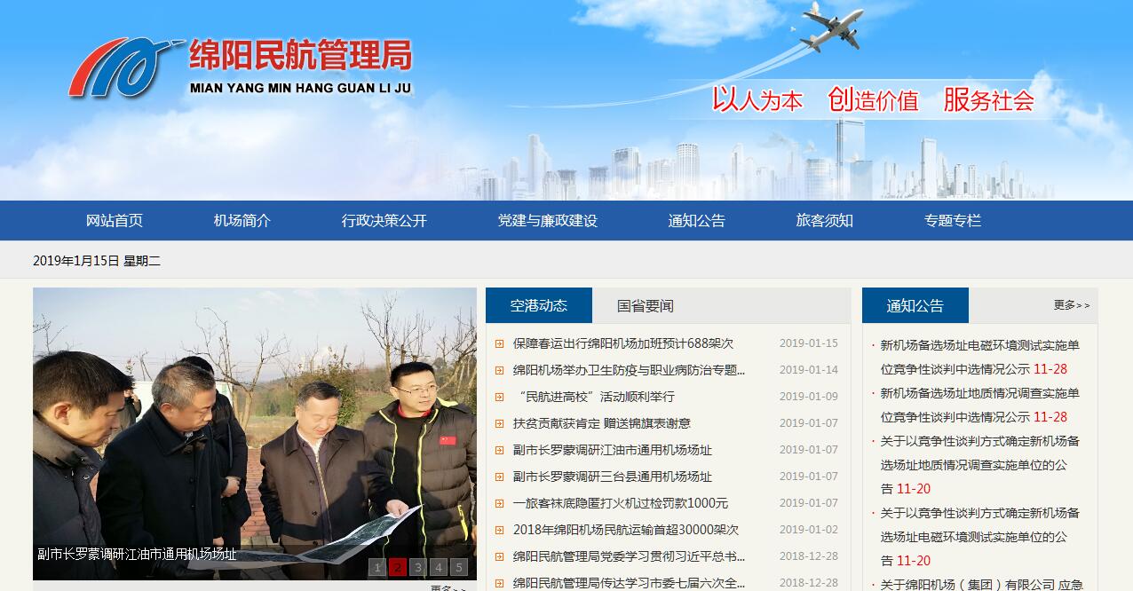 绵阳民航管理局主要职责:遵照国家民航局和空军部门的有关规定,根据绵阳市社会发展规划和绵阳市人民政府决定,制定绵阳民航业发展规划,负责管理和规范绵阳地区客货运输市场;负责绵阳地区的净空环境、电磁环境和环境保护的管理协调工作;履行绵阳地方民航执法职责;负责统一协调管理绵阳南郊机场的生产运营、安全运行、负责组织实施绵阳南郊机场的应急预案;负责绵阳南郊机场的特许经营权、专营权的管理;负责同国际国内的行业部门的技术交流联营合作与业务交流培训。绵阳南郊机场(IATA代码:MIG;ICAO代码:ZUMY)位于四川省绵阳市,于2001年4月建成通航,是一座新兴的现代化航空港,距市中心10公里,机场外联宝成铁路,成绵、绵广高速和九寨环线,交通便利。机场等级为民用4D级,跑道长2400米,停机坪面积6万平方米,11个停机位,候机楼建筑面积26000平方米,是仅次于成都双流机场的四川省第二大机场。2001年 通航第一年。民航运输起降架次781架次,旅客吞吐量64,947人次,货邮行1,040.1吨。2010年 旅客吞吐量突破50万人次。民航运输起降架次5,825架次,旅客吞吐量577,236人次,货邮行1040.1吨。2014年 旅客吞吐量突破100万人次。民航运输起降架次10,016架次,旅客吞吐量1,084,998人次,货邮行10,788.6吨。2015年 旅客吞吐量突破150万人次。民航运输起降架次14,148架次,旅客吞吐量1,547,533人次,货邮行12,631.5吨。2016年 旅客吞吐量突破200万人次。民航运输起降架次19,214架次,旅客吞吐量2,172,922人次,货邮行16,920.0吨。2017年 旅客吞吐量突破350万人次。民航运输起降架次28,510架次,旅客吞吐量3,543,403人次,货邮行22,270.0吨。截止2018年夏航季,有北京、上海、广州、深圳、石家庄、天津、乌鲁木齐、拉萨、杭州、南京、厦门、长沙、福州、武汉、三亚、海口、昆明、丽江、大理等38个通航城市、57条航线,由国航、南航、东航、川航、海航、深航、山东航、祥鹏航、春秋航等20家航空公司执飞。如今,绵阳机场紧紧抓住国家实施西部大开发和建设绵阳科技城这一历史机遇,加强队伍建设,深化内部改革,创新管理体制,积极开拓客货运输市场,大力提高机场的保障能力和服务水平,努力为绵阳及周边地区做出新的贡献。