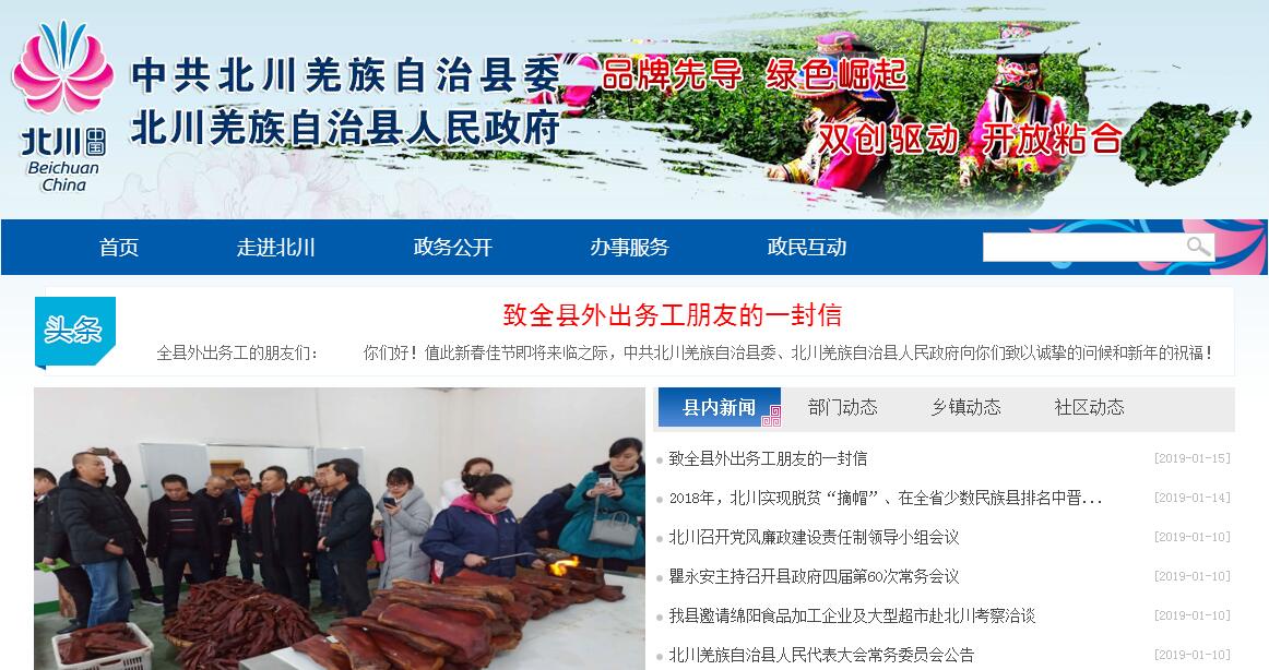 北川,古名“石泉”,位于四川盆地西北部。地理坐标,东经103°45'02"~104°43'12",北纬31°33'17"~32°13'17",东接江油市,南邻安州区,西靠茂县,北抵松潘、平武,辖区面积3084平方公里,2017年,全县总人口23.53万余人,辖10镇13乡。全境多山,峰峦起伏,沟壑纵横,地势西北高,东南低,最高点青片乡插旗山海拔4769米,最低点香泉乡通口河香水渡口海拔540米,高差4229米,县境气候环境独特,自然资源丰富。历史悠久,文化灿烂。夏商时期,县境属《尚书?禹贡》梁州之域,周为冉駹部落属地。汉武帝开发西南,于冉駹属地置汶山郡,县境属汶山郡广柔县。北周武帝保定四年(564年)在今禹里镇青石置北川县,是为北川建县之始。唐太宗贞观八年(634年)析北川县地在今禹里镇置石泉县,唐高宗永徽二年(651年),并北川县入石泉县。民国3年(1914年),因与陕西省石泉县同名,且彼县设置在先,乃复名北川县。北川自建县至2017年,已历1453年。北川是全国唯一羌族自治县,有羌族人口8.5万人,占全国羌族人口的三分之一。境内羌风民俗、宗教祭祀、节庆典礼、歌舞技艺、挑花刺绣、小吃杂耍,传承演绎着古羌文化的悠远神秘;开坪乡永平堡遗址、都坝乡伏羌堡遗址、桂溪镇烟云洞古人类遗迹、青片乡大寨子遗址等不可移动文物反映出羌族发展轨迹。北川是大禹故里,被授予“中国大禹文化之乡”,禹羌文化厚重,境内保存着大量有关大禹的历史遗迹,每个遗迹均有神奇而美丽的传说。北川是革命老区,红色文化鲜明,境内有著名的千佛山战役遗址、纪念碑,有红四方面军长征纪念馆、红四方面军总医院旧址等各类纪念馆6个。北川是“5.12”汶川特大地震极重灾区,抗震救灾和灾后重建中塑造的抗震文化和感恩文化感天动地,县境内的5.12汶川特大地震纪念馆、抗震纪念园是全国爱国主义教育示范基地、全国科普教育基地。北川是著名作家沙汀的出生地,留有《在其香居茶馆里》《淘金记》等著名文学作品。禹羌文化、红色文化、抗震文化、感恩文化在县境交相辉映,成为时代传承的宝贵财富。山川隽美、资源丰富。北川地处“神秘天地线”北纬31度附近,保存全球同纬度最完整的生态系统,是国家重点生态功能区,县境内林地面积362万亩,森林覆盖率55.7%;有小寨子沟、千佛山2个国家级自然保护区和竹林沟省级自然保护区。有野生脊椎动物515种,大熊猫、川金丝猴等国家一二级重点保护动物74种,有野生植物2150中,珙桐、红豆杉等国家一、二级重点保护植物13种,中羌药材繁多,有药材资源品种795种,其中药用植物616中。北川境内水资源丰富,通口河、安昌河和平通河三大河流穿境而过,地表水年径流总量38.15亿立方米,地下水蕴藏量1.8亿立方米,水能资源理论蕴藏量49.04万千瓦。至2017年底,北川境内矿产资源充裕,有黄金、赤铁矿、锰矿、重晶石、大理石等,其中大理石储量10亿立方米以上,北川被授予 “中国米黄大理石之乡”。北川特色旅游资源丰富,全县有AAAAA级景区1个,AAAA级景区4个,大小景点百余个。万亩辛夷花林,中药养身圣地药王谷,西南地区最大的现代高科技农业生态观光园维斯特休闲农业旅游区,兼具“九寨之秀,青城之幽”的国家级的自然保护区—小寨子沟。北川新县城更是全国唯一一个国家AAAAA级景区的县城,集国家园林县城、全国人居环境范例奖、四川省园林城市、四川省文明城市等众多殊荣于一身。2017年,全县接待游客635.07 万人次,实现旅游收入 51.71亿元。经济多元,特色初显。北川全境皆山,山地面积占辖区面积的98.8%,是传统的农业县,主要农作物以玉米为主,小麦、马铃薯、黄豆、荞麦、油菜次之,饲养猪、羊及家禽是重要的经济来源。改革开放后,在稳定粮食生产的同时,历届县委、县政府根据土地资源丰富的优势,大力发展茶、药、桑、果等多种经营,多经基地20余万亩。1998年,北川被列为全国12个退耕还林科技支撑示范县之一,至2009年全县退耕还林11.7万亩。汶川特大地震后,北川受到世界的关注,北川经济逐渐向多元化方向发展。精品农业示范区建设有序推进,建成茶叶、高山蔬菜、魔芋等农业产业基地75万亩,“北川苔子茶”“北川花魔芋”获国家地理标志产品保护;电子商务和“互联网+”势头强劲,荣获第二批国家级电子商务进农村综合示范县;总部经济初见端倪,普网、北华、富民村镇银行等总部经济初具规模;文旅发展引领区逐步形成,北川是四川省旅游强县、全国首批“全域旅游示范区”创建单位。省级经济技术开发区—四川北川经济开发区,坚持“一区多园”模式,通用航空、食品医药、新型建材、应急等产业加快发展。2017年,全县规模以上企业36家,高新科技型中小企业192家,实现地区生产总值50.19亿元,比2016年增长9.1%;实现公共财政收入4.51亿元,比2016年增长12.5%;。城镇常住居民可支配收入27041元,比2016年增长8.7%;农村居民人均可支配收入11814元,比2016年增长10.6%,人均消费支出9463元,比2016年增长8.4%。