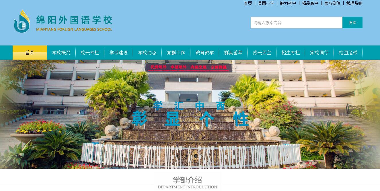 四川省绵阳外国语学校,始建于1999年,至今已办学18年。是绵阳市教体局直属的集小学、初中、高中于一体的全寄宿制、现代化、国际化品牌学校,是一所适应现代教育发展规律和社会主义市场经济发展特色的新机制学校。学校占地230亩,共161个教学班,在校学生7796人,教职工544人。专任教师中,中高级教师和特级教师占60%以上。学校坚持以培养“具有全球意识、以民族复兴为己任的现代人”的高远办学目标,以“团结、落实、智慧、人文”为工作方针,以“想得细、跟得紧、贴得近、落得实、合乎情”为管理特色,发扬“海纳百川、自强不息、厚德载物、永争第一”的绵外精神,挥舞如椽大笔绘制着“优质绵外、幸福绵外、内涵发展、全面跨越”的宏伟蓝图,让每一个走进绵外的学子“赢在起跑线,美在成长中,胜在人生路”。建校以来,绵外取得了令人瞩目的成就。精品高中。以“精细、多元、高端”为特色,建设精英文化,参加12届高考就先后夺取了四川省文科第二名、四川省理科第二名、绵阳市文科状元、绵阳市理科状元的桂冠,重点大学上线率保持了76%的记录,并一直稳定在50%以上,本科大学上线率保持在94%以上。魅力初中。以“智慧、人文、博雅”为特色,领航基础教育。初中部名师荟萃,英才辈出,12届中考稳居绵阳市前列,多人次夺取绵阳市中考状元和前十名,一类国重上线率保持在65%以上,省重上线率保持在95%以上。美丽小学。以“赏识、个性、和谐”为特色,启蒙素质人生。小学部参加全市统考纷纷摘取相应学段的桂冠,美丽小学,声名远播。学生参加全国英语、数学、物理、化学、生物竞赛,1000余人次获全国一等奖;参加科技、艺术、体育竞赛,700余人次获全国一等奖或金牌。学校品牌响亮,特色鲜明。是“全国素质教育先进单位”“全国外国语学校会员学校”“国家公派留学新加坡指定生源学校” “ 四川省教育工作先进集体”““四川省校风示范学校”“四川省艺术教育特色学校”“四川省青少年足球基地学校”“绵阳市教育质量先进学校”“绵阳市培养输送体育特长生先进学校”“绵阳市科技教育示范学校”“国家公派留学新加坡指定生源学校”以及“绵阳市全国外语等级培训考试中心”。学校勇担均衡发展重任,输出优质教育资源。2010年创办绵外实验学校;2013年与阿坝州理县结成教育联盟、帮扶北川县永昌中学;2014年结对帮扶省级示范高中绵阳梓潼中学,成功创办绵外幼稚园;2015年,对口援建雅安市雨城区雨城二中,帮扶凉山州西昌二中。学校影响日渐深远,品牌日益扩张,彰显了强大的生命力、创新力。学校发挥品牌力量,提供优质教育,为学生未来发展、美丽人生、终身幸福奠定坚实的基础。教育代表学校的核心竞争力,是学校品牌的生命线。绵外的社会公信力,来源于取信于民的教育水平和办学业绩。难能可贵的是,绵外致力于建设质量高地,搭建成功阶梯,不是片面追求分数、一心只看成绩,而是通过教学改革,追求绿色质量,构筑生态课堂,培养学生学会生存、学会交流、学会发展、学会协作、学会学习的能力。教学和德育联动,整体设计,共同撑起孩子幸福成长的天空。