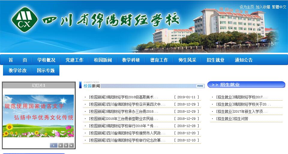 四川省绵阳财经学校是经四川省人民政府批准的全日制经济、技术类普通中专学校,是绵阳市教育体育局直属学校。学校创建于1956年,2000年起,先后获得首批“国家级重点中等职业学校”、“国家中等职业教育改革发展示范学校”、“全国就业安置工作先进学校”、“四川省职业教育先进单位”、“四川省中等职业教育学生内务管理示范学校”、“绵阳十大名校”、“绵阳就业创业成绩突出单位”、“全国职业教育先进单位”等荣誉。学校开设会计、酒店服务与管理、机电技术应用、计算机应用、旅游服务与管理、数控技术应用、美术设计与制作、电子商务、市场营销、中餐烹饪等10个专业,其中,会计和高星级饭店运营与管理是省级重点专业,计算机应用和机电技术应用两个专业为市级示范专业。学校是绵阳市唯一一所省教育厅确定的“现代学徒制”和教学诊断改革试点学校。学校位于中国科技城绵阳市城区,环境优美,占地180余亩,在校学生4000余人。学校师资力量雄厚,230多名教师中,“双师型”超过80%。校内各种设施完善,设备先进,电教中心、虚拟社区和各种专业实验(训)室以及众多的校外实践基地,完全满足教育教学需要。学校教育质量高,升学渠道广,对外培训多,就业安置畅,社会影响大。与绵阳职业技术学院、四川商务职业技术学院联合举办高职班,与成都东星航空服务有限公司联合开设组织“旅游服务与管理”专业(航空定向班)高素质定向学生培养培训,与西南财经大学和成都理工大学联合联办专科以上成人教育。学校教育理念先进,治学严谨,管理严格,注重德技相长,实行校企合作和多证书制度,培养实用型高技能人才,建校62年来,为社会培养了10万余名合格的技术人才,为当地经济社会发展做出了突出贡献。