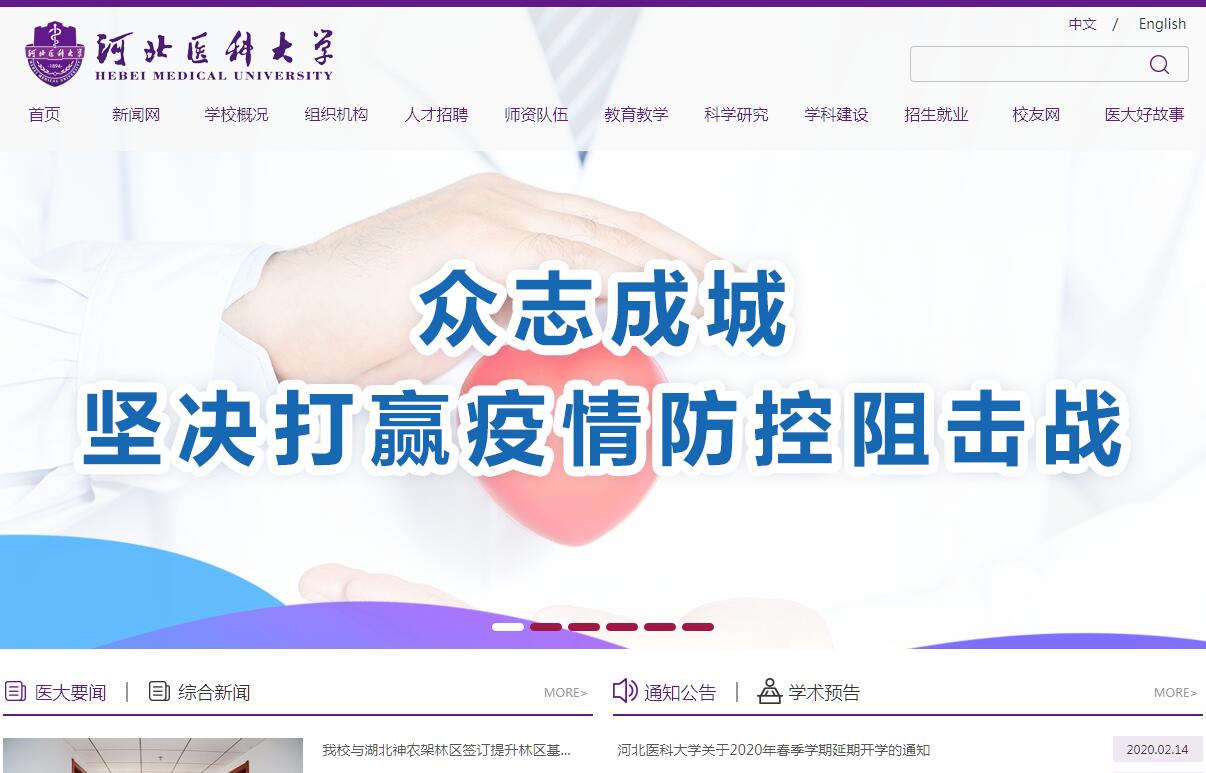 河北医科大学是河北省重点骨干大学,初名北洋医学堂,1894年由直隶总督北洋大臣李鸿章于天津创办,是中国近代第一所官办西医院校。辛亥革命后,1912年10月民国教育部颁发第十六号令,据此北洋医学堂1913年更名直隶公立医学专门学校,并开始招收本科学生。1915年学校迁至保定。1937年7月7日抗日战争全面爆发,学校被迫停办。1946年1月复校招生。1949年4月更名为河北医学院。1958年学校由保定迁至石家庄。1995年,原河北医学院、河北中医学院、石家庄医学高等专科学校三校合并,改称河北医科大学。2013年河北中医学院恢复独立建制。2016年,教育部、国家卫生计生委、河北省人民政府正式签署共建河北医科大学协议。“十三五”期间,学校制定了“建设特色鲜明的高水平医科大学”的发展目标。学校秉承“崇德、敬业、谨严、创新”的优良校风,历经120年,特别是改革开放三十多年来的建设发展,已成为集教学、科研、医疗为一体的综合性医科大学。2005年学校提出了“明德博学 行方智圆”的校训。2015年学校确立了“学生为本 教师为先”的办学理念。目前,学校有两个校区、五所直属附属医院,下设18个二级学院,24个本科专业,其中国家级特色专业4个,省级特色专业4个。现有全日制在校生13795人,其中博士生、硕士生3418人,留学生413人。学校建有基础医学、临床医学、中西医结合、生物学4个博士后科研流动站,具有基础医学、临床医学、生物学、公共卫生与预防医学、药学、中西医结合等6个一级学科博士学位授予权;52个学科具有硕士学位授予权,具备培养学士、硕士、博士及博士后的完整医学教育体系。全校系统共有教职工15000余人(含直属附属医院),其中正高职专业技术人员1096人,副高职专业技术人员1654人,博士生导师117人,硕士生导师1519人。在这支队伍中有一批学识渊博、在国内外享有盛誉的专家教授,包括中国工程院院士4人,全国杰出专业技术人才1人,“万人计划”教学名师1名,国家百千万人才工程人选4人,燕赵学者3人,河北省高端人才4人,国家级优秀(模范)教师8名,河北省高等学校教学名师11人,享受国务院特殊津贴专家107名,省管优秀专家60名,有突出贡献的中青年专家111名。学校的5所直属附属医院中,4所为三级甲等综合性医院,1所为三级专科医院,编制床位9139张。另有5所非直属附属医院、5所教学医院和28个实习基地,教学床位达到25000张。学校不仅是河北省的医学教育、医疗救治中心,也是河北省的医学研究中心。设有国家级重点学科1个(中西医结合基础)、重点培育学科1个(法医学)、国家中医药管理局重点学科1个(中西医结合基础),国家级临床重点专科16个,河北省“双一流”建设学科4个,河北省国家重点学科培育项目支持学科1个,河北省强势特色学科4个,省级重点学科12个,省部共建(教育部)重点实验室2个,省级协同创新中心3个,省新型智库1个,省哲学社会科学研究基地1个,省教育厅人文社会科学重点研究基地2个,省级重点实验室、研究室、工程中心20个,省级研究所6个。此外,学校还承办编辑出版了国家级及省级学术刊物8种。近年来,学校不断加强国际交流与合作,已成为河北省对外文化、学术交流的重要窗口。先后与日本、韩国、美国、比利时、法国等12个国家的27所医学院校和科研机构建立了密切的协作关系,聘请了百余名外国专家担任学校的名誉职务,有留学生413人在校学习。此外,学校秉承大学服务于地方建设的宗旨,积极向地方政府与企业提供智力支持,先后与多家企事业单位签署合作协议43项,合作内容涵盖了人才培养、科学研究、生产服务等。