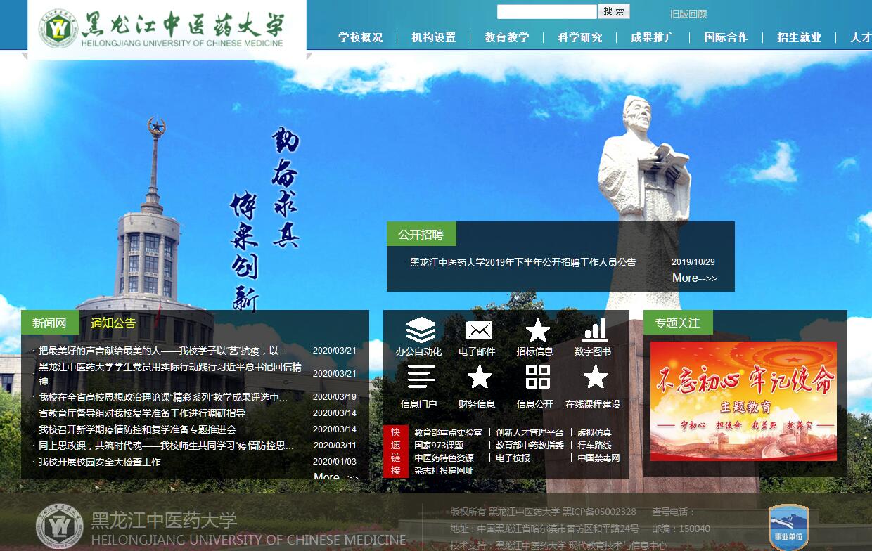 黑龙江中医药大学始建于1954年,经六十余年的建设与发展,学校已成为具有较高教学、科研、医疗水平,在国内外有一定影响的高等中医药院校。学校于2004年全国首批获得教育部本科教学工作水平评估优秀结论,2007年全国首家通过教育部本科中医学专业认证单位,2008年被确定为国家中医临床研究基地建设单位,2014年晋升为全国文明单位,2015年荣获全国50所毕业生就业典型经验高校称号,2016年获批成为全国中医药文化宣传教育基地,2018年获批成为黑龙江省“高水平大学和优势特色学科建设高校”。学校下设11个学院、11个附属医院(2个直属)、1个中医药研究院、27个教学医院和70个实习基地。设有24个本科专业,涵盖医、理、文、工、管、法等6个学科门类。有博士学位授予权一级学科4个、二级学科30个;有硕士学位授予权一级学科5个、二级学科36个;有博士专业学位授权点1个,硕士专业学位授权点4个。现有全日制在校生15221人,其中博士研究生299人、硕士研究生1947人、本科生10891人、专科生1742人、留学生288人。学校设有中医学、中药学、中西医结合、药学4个博士后科研流动站,是国家第一类特色专业(中药学、药物制剂和针灸推拿学)和首批第二类特色专业(中医学)建设点。中药类人才培养模式创新实验区为教育部首批人才培养模式创新实验区,中医临床人才培养模式创新实验区为黑龙江省人才培养模式创新实验区。在全国第四轮学科评估中,中药学学科排名并列第一、中医学学科排名并列第四,成为全国获评“A+”学科的三所中医药院校之一。学校有国家重点学科4个、国家中医药管理局重点学科21个、省级重点学科11个、省领军人才梯队17个;有国家级教学团队3个、省级教学团队5个;有国家精品课程8门、国家精品资源共享课程8门、省精品课程22门。学校两次获全国优秀高等教育研究机构称号,曾先后获国家教学成果一等奖1项、二等奖6项、省级教学成果奖55项。教学实验中心为全国中医药院校首批确定的“国家级实验教学示范中心”。中医药文献检索中心被确定为中国中医药文献检索中心黑龙江分中心,为国家中医药管理局首批科技项目查新定点单位。学校现有教育部重点实验室1个,国家中医药管理局研究中心1个、重点研究室3个、三级实验室10个;黑龙江省重点实验室8个,省普通高等学校重点实验室5个,省校企合作工程技术中心2个;有科技部中医药国际科技合作基地1个,国家中医药管理局中医药国际科技合作基地1个,黑龙江省中医药国际科技合作基地1个,黑龙江省科技创新平台1个。现为国家“973计划”项目首席科学家单位,曾先后获得各级各类科研课题立项3245项,其中国家973项目及课题5项、863项目1项、“十三五”国家重点研发计划项目1项;获得各级各类奖励1008项,其中国家技术发明二等奖1项、国家科技进步二等奖8项、吴阶平-保罗·杨森医学药学奖2项、吴阶平医药创新奖1项、高等学校科学研究优秀成果奖一等奖2项、中国中西医结合学会科学技术奖一等奖3项、中华中医药学会科学技术奖一等奖3项、黑龙江省科学技术奖一等奖14项、中国中医药研究促进会科学技术奖一等奖1项。学校培养的博士撰写的学位论文分别于2008年和2012年获得教育部、国务院学位委员会“全国优秀博士学位论文”。学校教学科研设备总值达3.45亿元,有超导核磁共振波谱仪、超高效液相质谱联用仪等一批大型精密仪器设备。在中药血清药物化学研究、中药天然药物药效物质基础研究等方面处于国际先进水平,在方剂配伍规律、针灸作用机理研究和中医药治疗内科、妇科、肾病等重大疾病的临床研究方面处于国内领先水平。学校附属第一医院(第一临床医学院、护理学院)为国家中医临床研究基地建设单位、全国示范中医医院。学校附属第二医院(第二临床医学院、针灸推拿学院、康复医学院)是黑龙江省首家获得国家药物临床试验机构认定的中医院,为全国首批现代化中医院建设单位。两所附属医院均为国家三级甲等中医医院,现有床位2800张,有国家重点专科19个、省级重点专科20个,年门诊量突破140万人次,实现业务收入12亿元。当前,学校正在加快推进东北三省最大的集医疗、康复、护理、养老于一体的新型“医养结合”模式的养老养护康复机构建设,占地面积40万平方米,规划设置10000张养老养护康复床位的新型医疗服务机构正在哈南工业新城拔地而起。2016年9月,原国家卫计委副主任、国家中医药管理局局长王国强来学校调研,对“医养结合”项目建设给予充分肯定。学校现有教职工3667人(校本部901人)。其中具有教授、副教授职称的专任教师599人,博士生导师116人,硕士生导师510人,享受国务院及省政府特殊津贴85人,国医大师1人,国务院学位委员会学科评议组成员2人,教育部高等学校教学指导委员会委员5人,国家级有突出贡献中青年专家3人,百千万人才工程国家级人选6人,全国先进工作者2人,全国优秀科技工作者2人,国家级教学名师3人,全国模范教师1人,全国优秀教师6人,全国中医药高等学校教学名师2人,全国巾帼建功标兵1人,现有长江学者讲座教授1人,龙江学者特聘教授17人,“千人计划”国外专家1人。学校拥有东北三省唯一一家药物安全性评价中心,建立了黑龙江省中药材GAP研究中心,现为“省医药工业校企合作专业委员会”牵头单位,拥有占地100万平方米