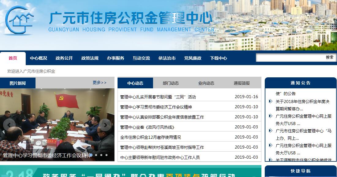 广元市住房公积金管理中心于2003年6月成立,为市人民政府直属正县级事业单位。中心内设办公室、稽核科、会计科、信贷业务科、资金归集科、信息技术科六个科室,下设苍溪县管理部、旺苍县管理部、剑阁县管理部、青川县管理部、朝天区管理部、昭化区管理部、利州区管理部、宝轮管理部八个派出机构,负责全市行政辖区内住房公积金的管理和运作。管理中心现有干部职工77人(含聘用人员23人)。其中中心领导班子成员5人 ;共产党员44人,占职工总数的57%;具有大专以上文化程度职工77人,占职工总数的100%。中心自成立以来,在市委、市政府的正确领导下,按照市住房公积金管委会的决策部署,围绕“改善民生、服务大局”的总体要求,以“管理上档次、服务上水平”为核心,不断创新管理、规范运作、优化服务,全市住房公积金事业得到了健康、快速的发展。近年来,管理中心先后荣获省级“文明单位”、“档案工作规范化管理一级单位”,市级“卫生先进单位”、“保密工作先进集体”、“社会治安综合治理工作优秀单位”、“普法先进单位”、“创先争优先进基层党组织”、“模范职工之家”等荣誉。多次获得省住建厅年度完成目标任务特别奖、一等奖。管理中心全体干部职工上下一心,为“服务民生”,实现“住有所居”,为建设美丽、开放、活力、畅达、幸福的川陕甘结合部区域中心城市而努力奋斗。管理中心依法履行下列职责:(一)编制、执行住房公积金的归集、使用计划;(二)负责记载职工住房公积金的缴存、提取、使用等情况;(三)负责住房公积金的核算;(四)审批住房公积金的提取、使用;(五)负责住房公积金的保值和归还;(六)编制住房公积金归集、使用计划执行情况的报告;(七)承办住房公积金管理委员会决定的其他事项。