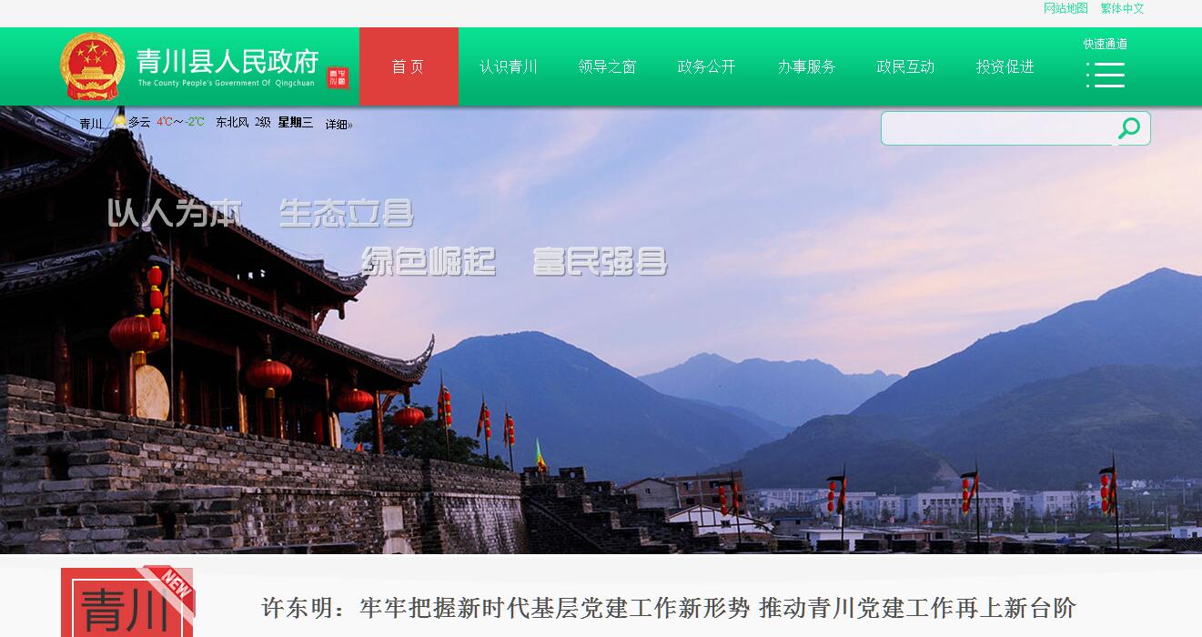青川县地处四川盆地北部边缘,秦岭南麓,白龙江下游,川陕甘三省接合部,素有“鸡鸣三省”之称。青川自西汉置郡至今,迄今已有2300多年历史。因“其水清美”,唐天宝元年始名为清川。全县幅员面积3216平方公里,辖11镇25乡268个行政村,有蒿溪、大院两个回族乡,总人口25万。青川山青水秀。青川年平均气温13.7℃,年降水量1027毫米,最高处海拔3837米,最低处海拔491米,气候特征为春迟、夏短、秋凉、冬长,立体气候明显。年空气质量优良天数达363天以上,每立方厘米负氧离子达2.5万个以上。青川环境优美、风光旖旎,有“全域山水画、天然大氧吧”和“夏青川、爽天下”的美誉。境内唐家河、东河口地震遗址公园、青溪古城、青川县城战国木牍生态文化园4个国家AAAA级景区和国家级风景名胜区白龙湖闻名遐迩,白龙湖·幸福岛、初心谷·田缘张家、大坝·凌霄花谷3个国家AAA级景区和省级自然保护区毛寨、东阳沟风光如画。青川区位独特。青川地处中国中西部交接地带上,是西北连接西南的重要通道,兰海高速、京昆高速、广(元)平(武)高速(在建)和宝成铁路、兰渝铁路、西成高铁三条铁路穿境而过。独特的区位优势和便捷的交通条件,使青川可1小时到达绵阳、广元、昭化港和广元机场,2小时到达成都、西安、南充、巴中、汉中、陇南6市,4小时到达兰州、重庆。青川物产丰富。境内森林覆盖率达72.99%,有银杏、珙桐等野生植物1900余种,大熊猫、金丝猴、扭角羚等珍稀动物440余种,盛产黑木耳、香菇、竹荪等山珍和茶叶、核桃、油橄榄等有机食品及天麻、乌药、青贝等名贵中药材,有青川黑木耳、青川天麻、青川竹荪、七佛贡茶、白龙湖银鱼、青竹江娃娃鱼、唐家河蜂蜜7个“国家地理标志保护产品”。境内矿产资源丰富,是四川省矿产资源优势县之一。白龙江和青竹江横贯全境,全县总蓄水量157亿立方米,水能蕴藏量100多万千瓦。青川前景广阔。青川属国家重点生态功能区,是川陕革命老区、秦巴山区连片扶贫开发重点县和“5.12”汶川地震极重灾区县。近年来,青川县始终坚持“以人为本、生态立县、绿色崛起、富民强县”发展思路,牢牢把握“基础先行、三产联动、城乡统筹、改革引领、法治助推、党建保障”发展举措,全县呈现出经济快速发展、民生持续改善、改革全面深化、社会和谐稳定的良好态势。青川将继续坚持举生态旗、打生态牌、走生态路,大力发展绿色产业,努力建设成为生态旅游目的地、生态经济先行区、生态文明示范县和“中国生态康养旅游名县”,与全国全省同步全面建成小康社会。青川名片:国家卫生县城、国家生态旅游示范区、全国最具魅力生态旅游县、国家有机产品认证示范县、国家农业产业化示范基地、国家生态农业试点县、中国名茶之乡、中国食用菌之乡、全国绿色食品原料标准化生产基地、国家生态原产地产品保护示范区。