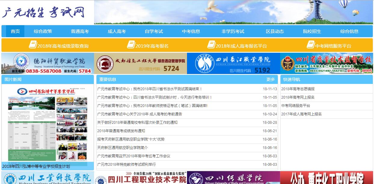 | 网站简介: 广元招生考试网(www.gyzsks.cn),备案号为 蜀ICP备11006012号,是广元市大学中专招生委员会主办的政策性官方网站,网站着力于宣传招生考试政策,传达招生考试工作进程,架设高校、考生之间的桥梁,努力服务于招生学校,服务于广大考生,为社会经济发展做出应有贡献。是广元市教育考试中心主办的服务性官方网站,网站主要功能是为实现考生网上报名,考生志愿网上填报,高中招生网上录取等提供服务。 |